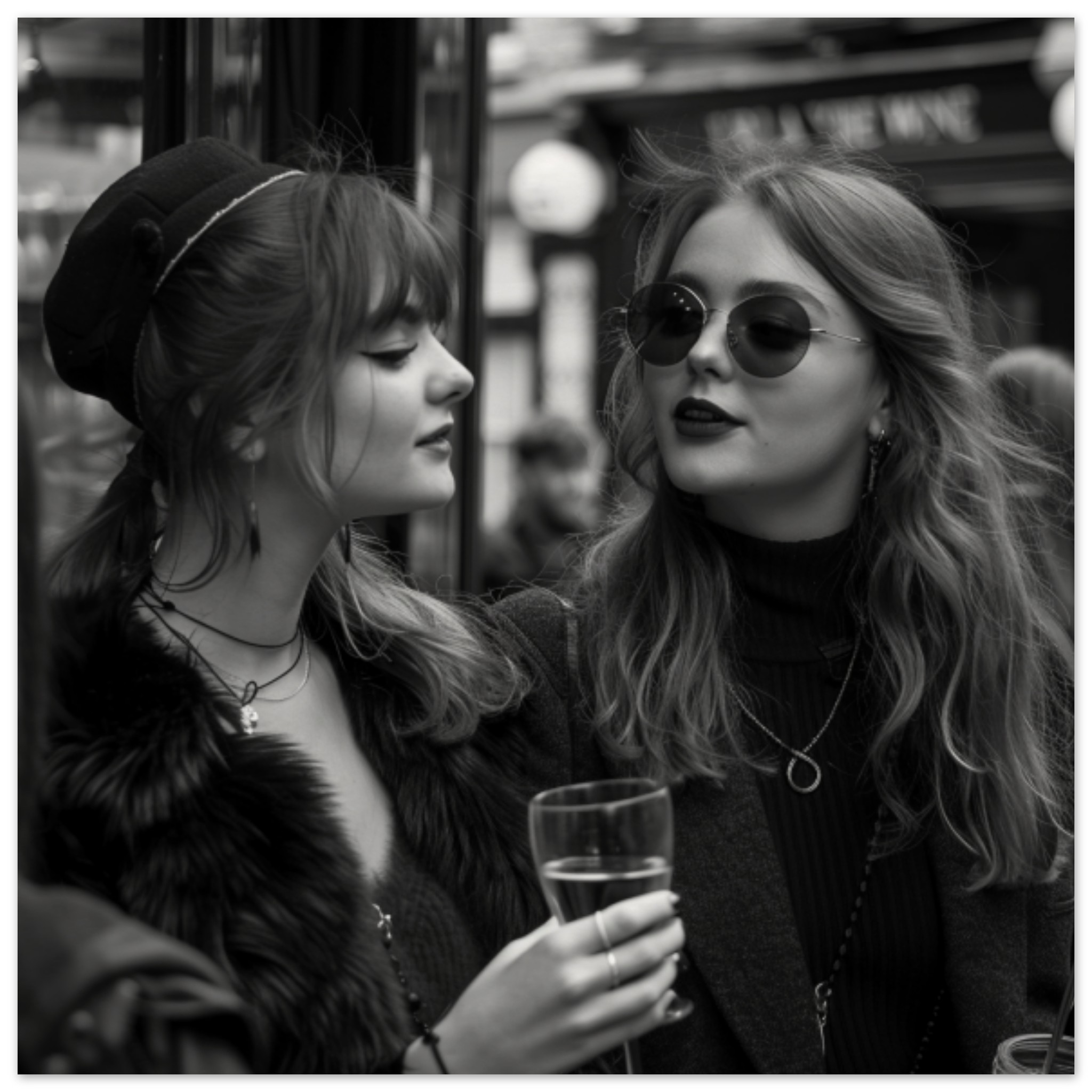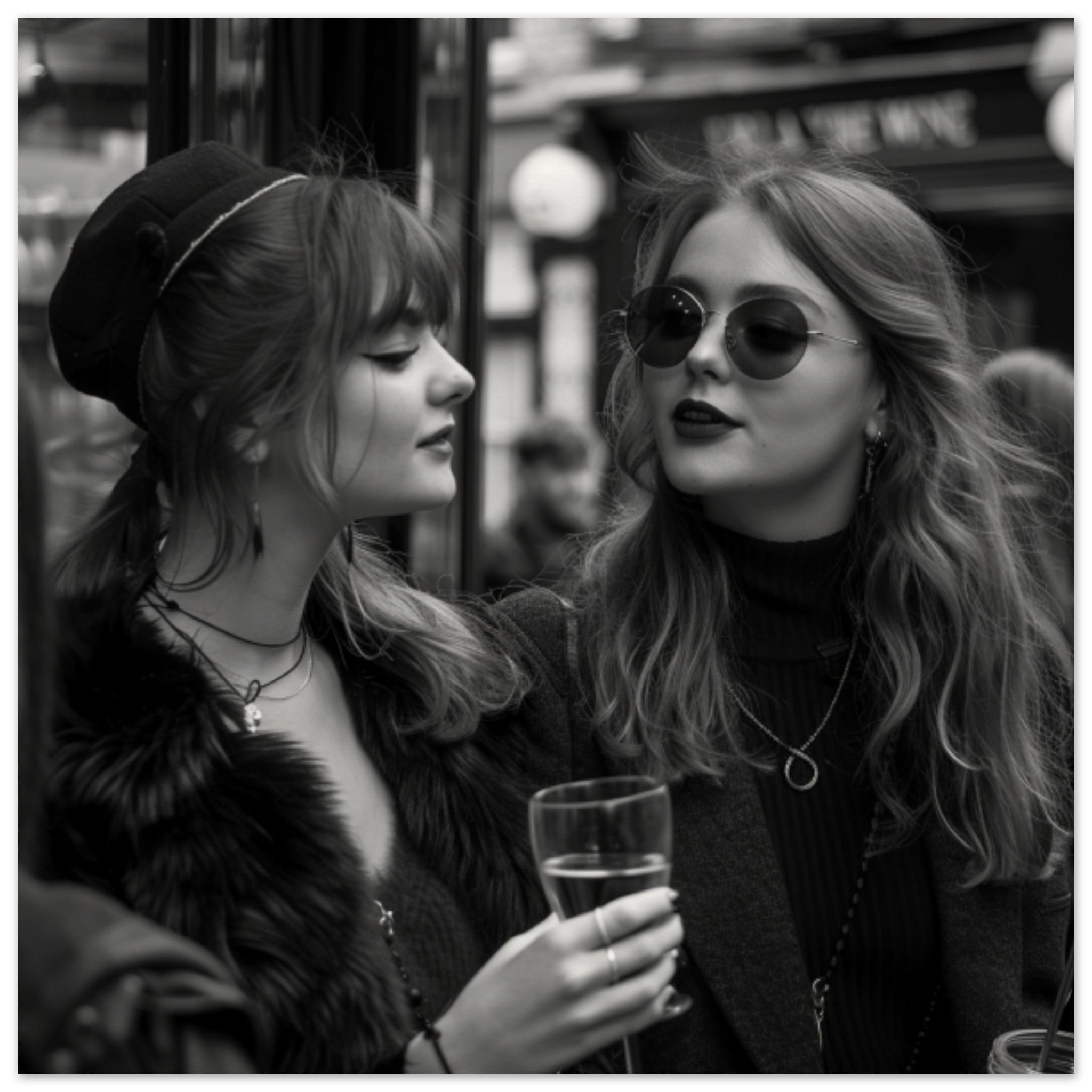Two stylish women are standing on a street corner, both wearing black sunglasses and trendy outfits. One woman is in a fur coat, while the other is in a black turtleneck. The image is in black and white, with dominant colors of black and grey. The women are holding drinks, one of them holding a glass of liquid. The focus is on their fashionable accessories, with sunglasses being a prominent feature. The faces of the women are partially obscured, adding a sense of mystery to the scene. Overall, the image captures a moment of urban street fashion.