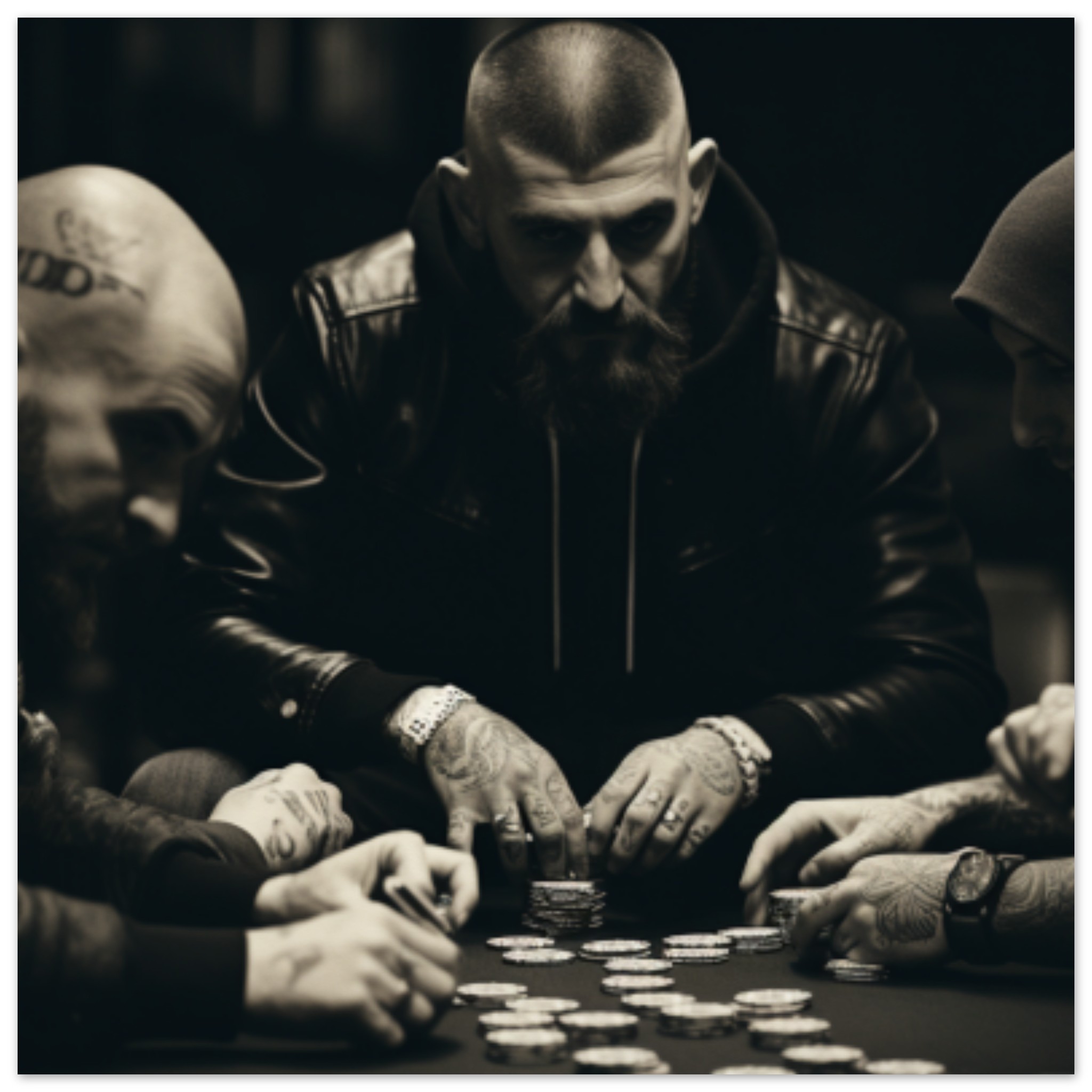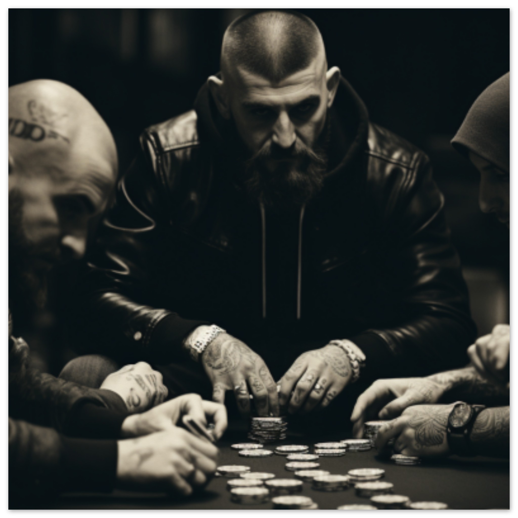 A black and white image showing a group of three men playing poker at a table in a room. One man is seated in the center, wearing a hoodie and looking at a tattoo on his hand. Another man with tattoos on his head sits to the left, while the third man is on the right side of the table. The image focuses on the men’s faces and hands as they engage in the game. Silver coins are visible on the table. The overall atmosphere is intense and focused as the men concentrate on their game.