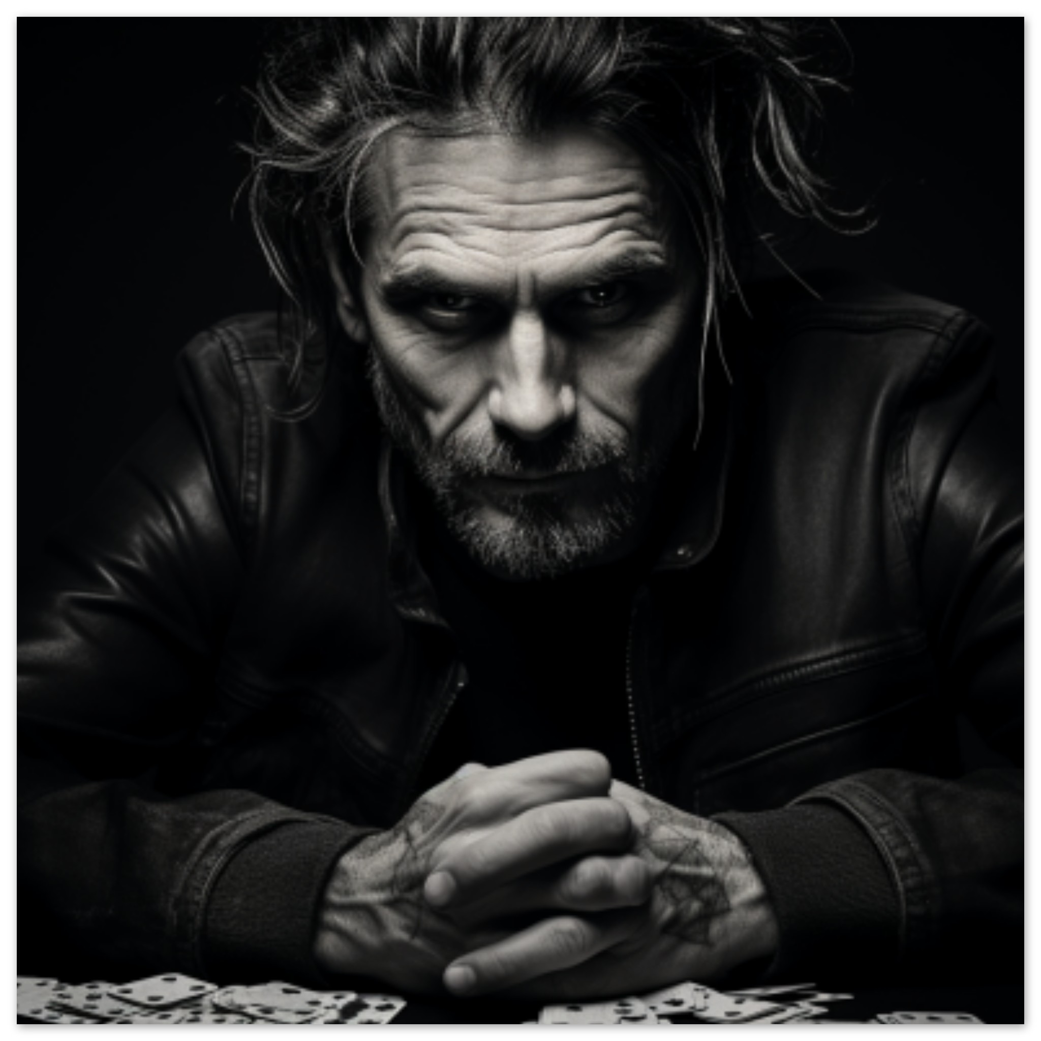 A black and white image of a man with a beard and long hair sitting at a table with playing cards. The dominant colors in the image are black, with an accent color of dark gray. The man’s face is the main focus, with a close-up showing his beard and mustache. He is wearing casual clothing and appears to be indoors. The image is monochrome and has a strong focus on the person’s portrait. The man’s expression is intense as he engages in a game of cards, with a hand visible in a close-up shot.
