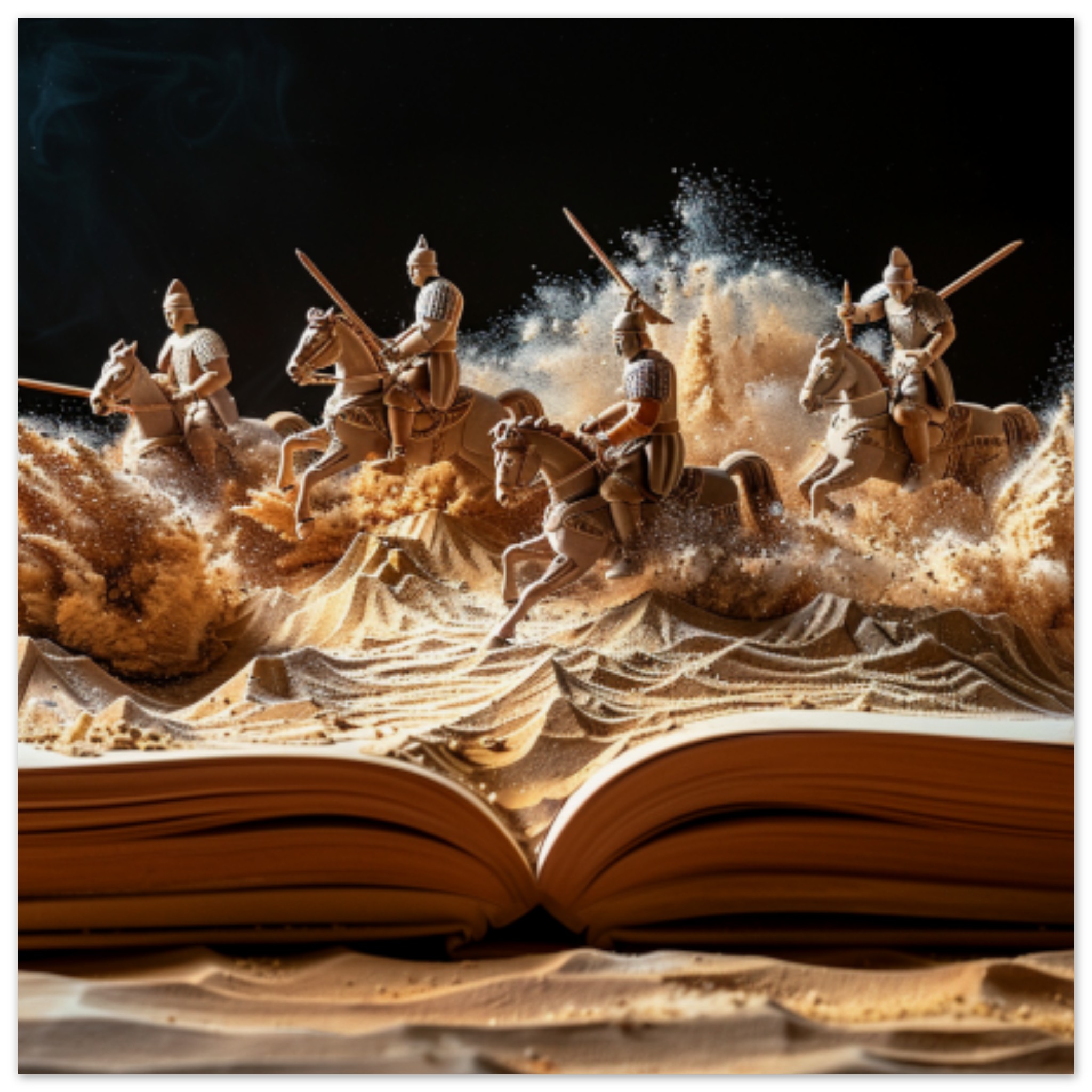 “A group of people riding horses is depicted on the cover of a book. The image shows a brown horse in the foreground, with a black background. One person is visible in the image, located towards the center with a bounding box of 30×76 pixels. The dominant colors in the image are brown and black, with an accent color of #693616. The image is not black and white. The content of the image is not adult, racy, or gory. The image is 600 pixels wide and 452 pixels high. The primary tag associated with the image is ‘book’.”