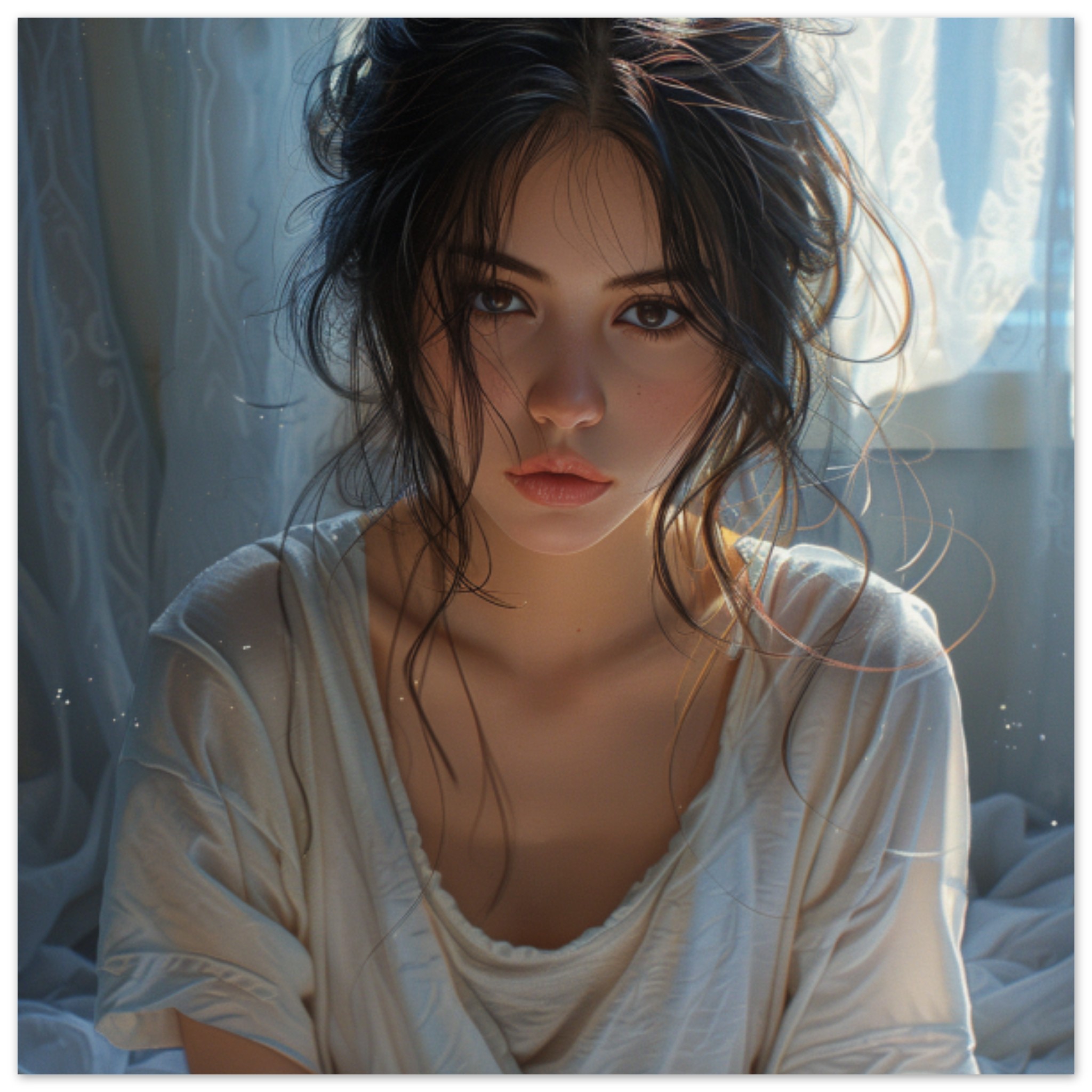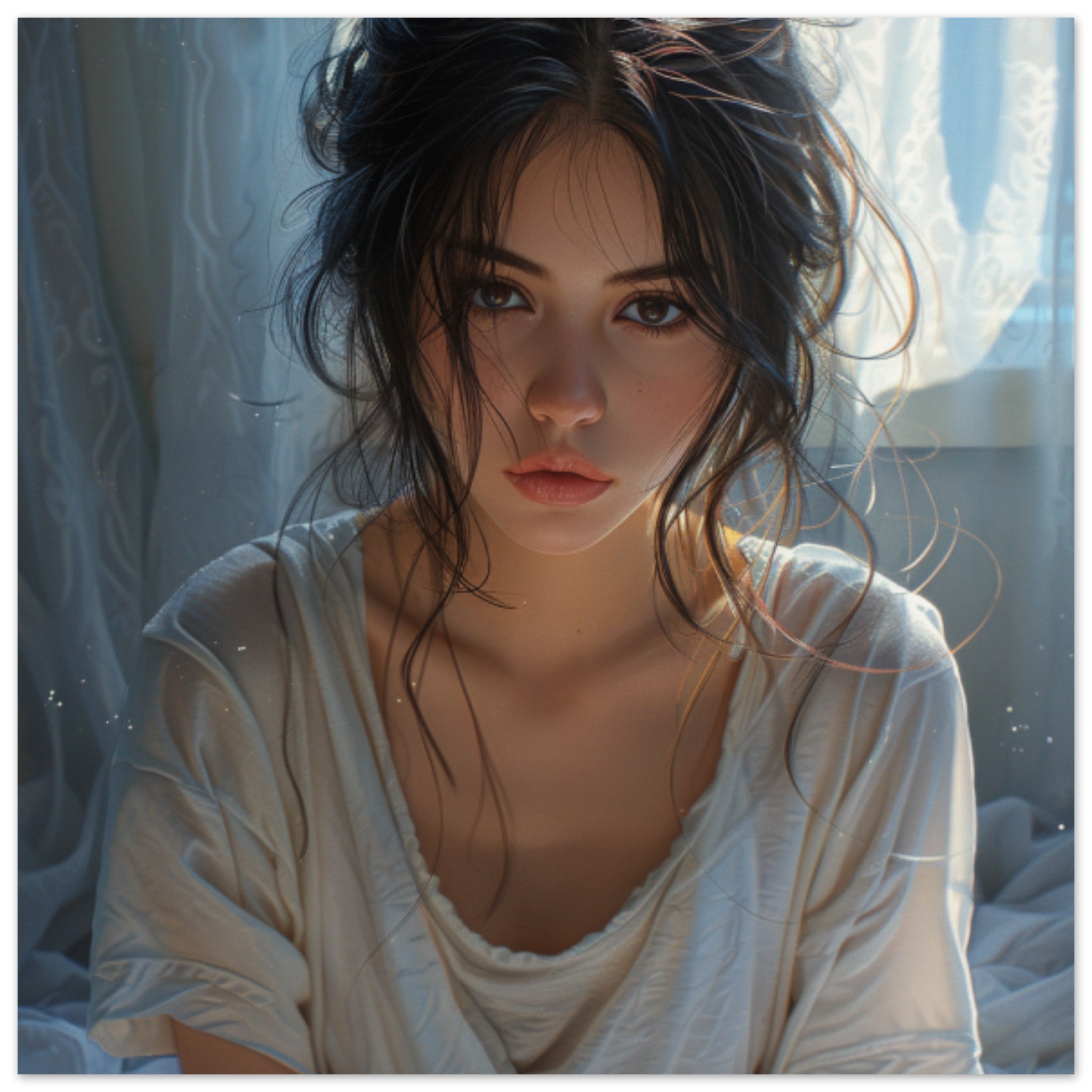 A young woman with long brown hair is standing indoors in front of a window. She is wearing a white shirt and has a serious expression on her face. The dominant colors in the image are grey and brown, with the accent color being a shade of blue. The woman’s face is the main focus of the photo, with her lips and skin clearly visible. The image is not black and white and is not considered adult, racy, or gory content. The woman is alone in the photo, with no other objects or people present.