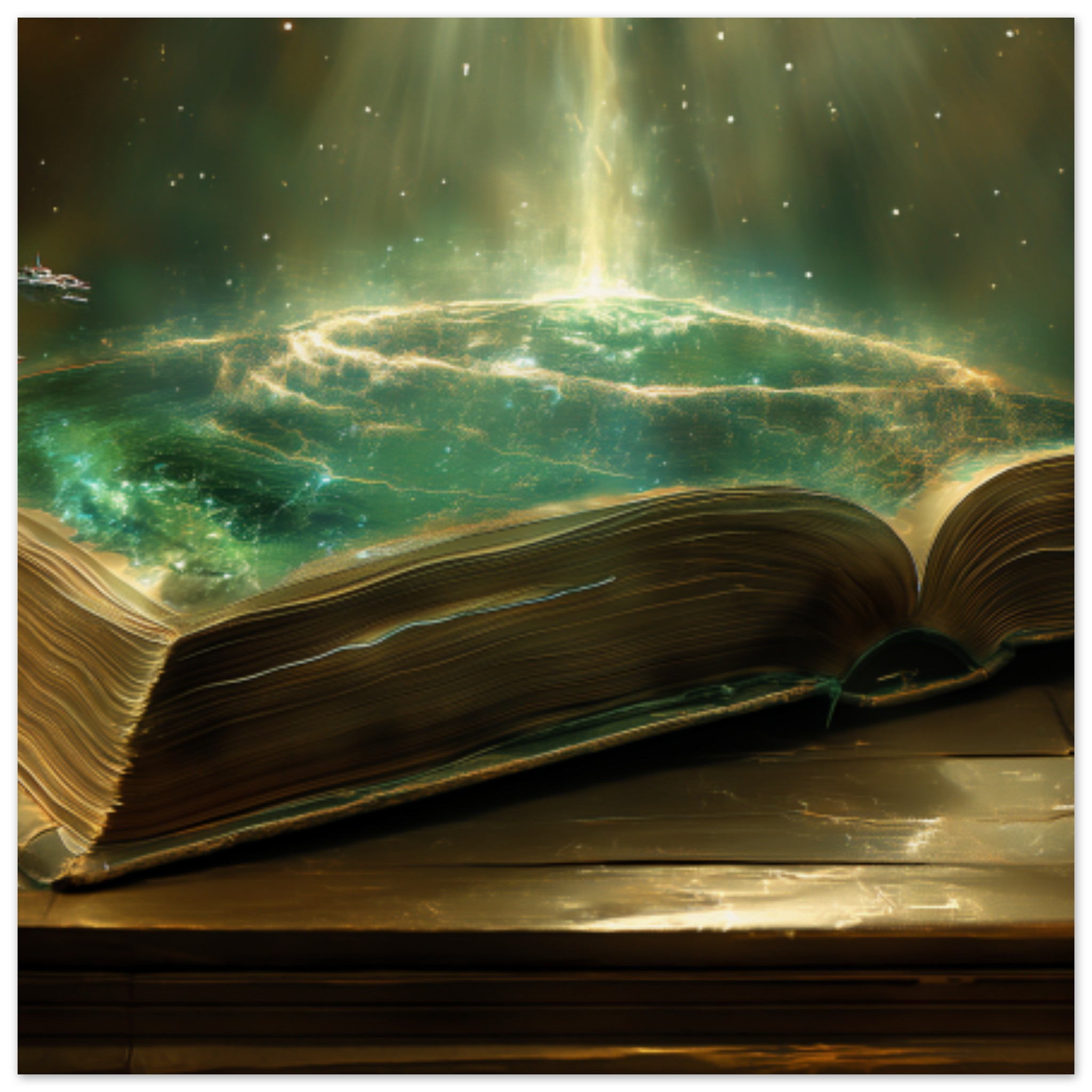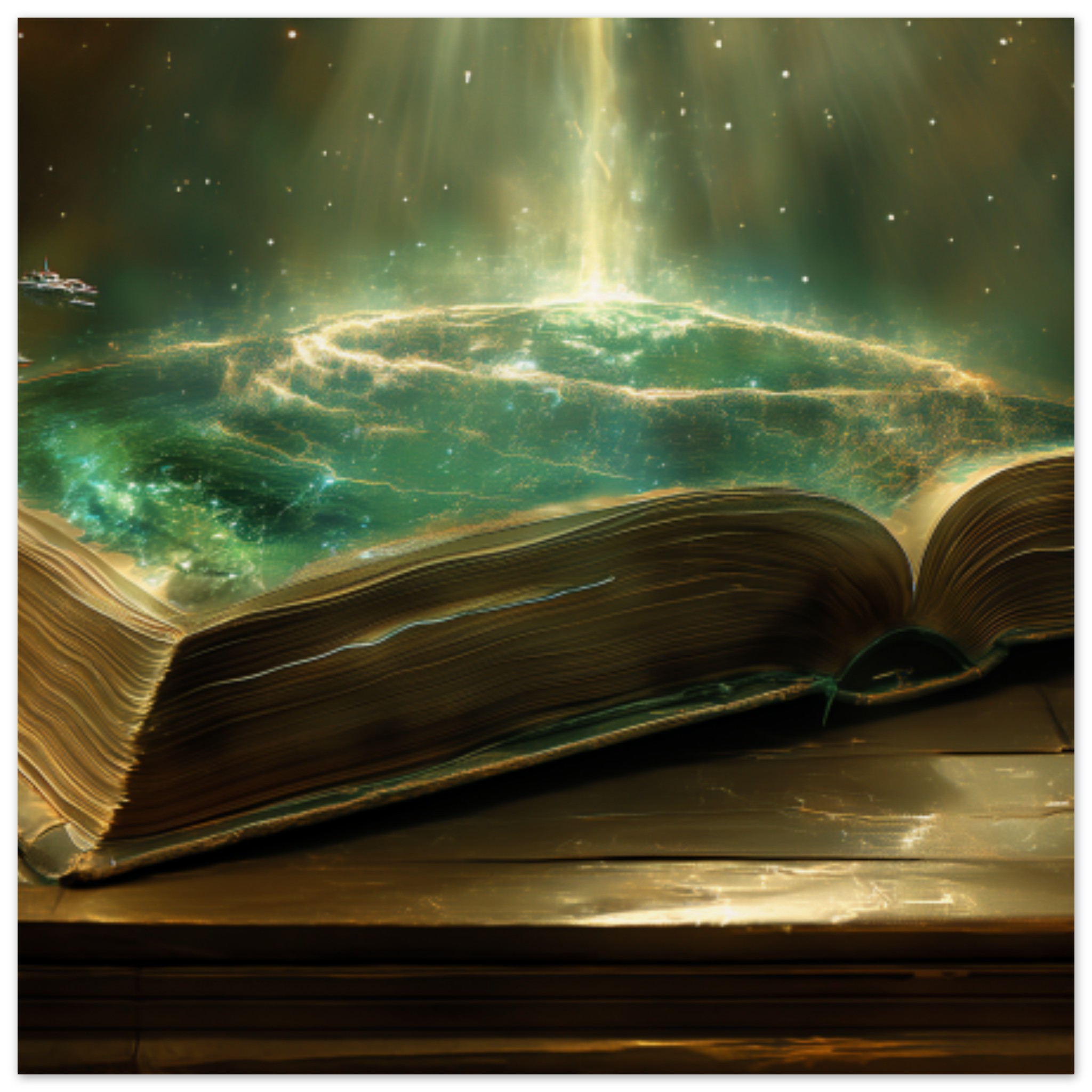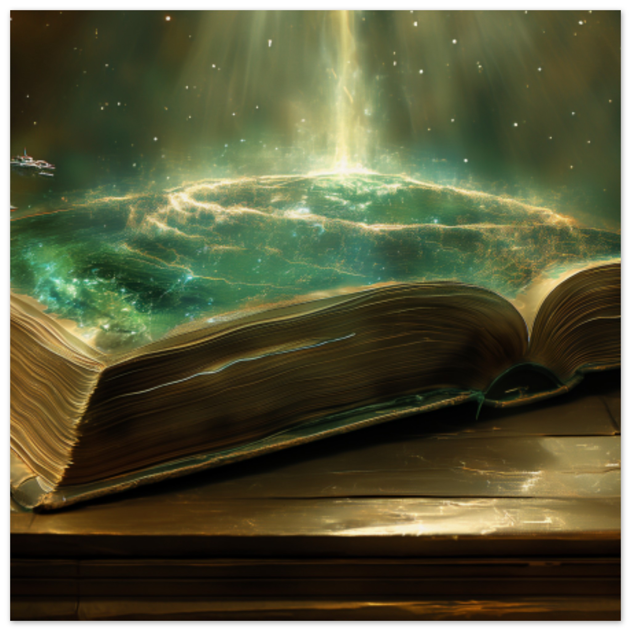 A visually captivating image of an open book with a glowing planet in the middle is displayed. The book has a black cover with hints of brown and green. The background is also black. The planet emits a vibrant green light, creating a mesmerizing effect. The image is not in black and white and the accent color is a warm brown shade. The book appears to be a screenshot, giving it a digital feel. Overall, the scene evokes a sense of wonder and mystery, with elements of space and stars subtly present.