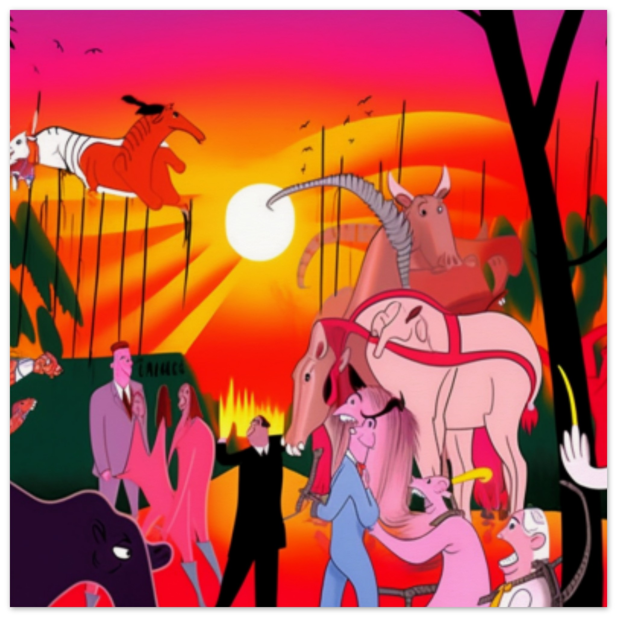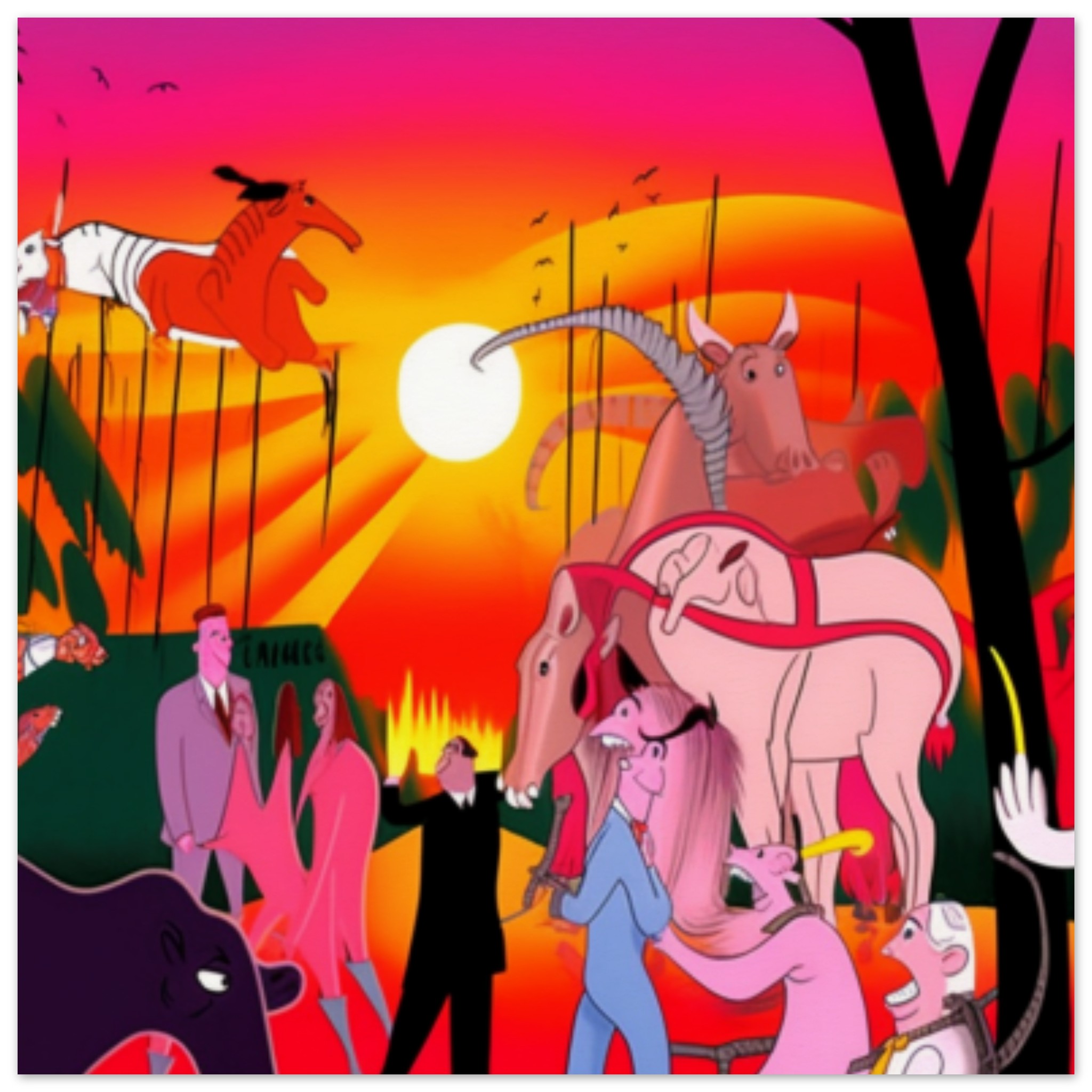 A vibrant illustration of a group of people in a forest, with dominant colors of red and pink. The image depicts a mammal in the foreground and a person in the background. The scene has an anime style, resembling an animated cartoon with a whimsical and fictional feel. The artwork is detailed and colorful, with a touch of yellow accent color. The composition is lively and engaging, capturing a sense of adventure and imagination. This creative painting combines elements of clipart and drawing, creating a captivating piece of art with a hint of fantasy.