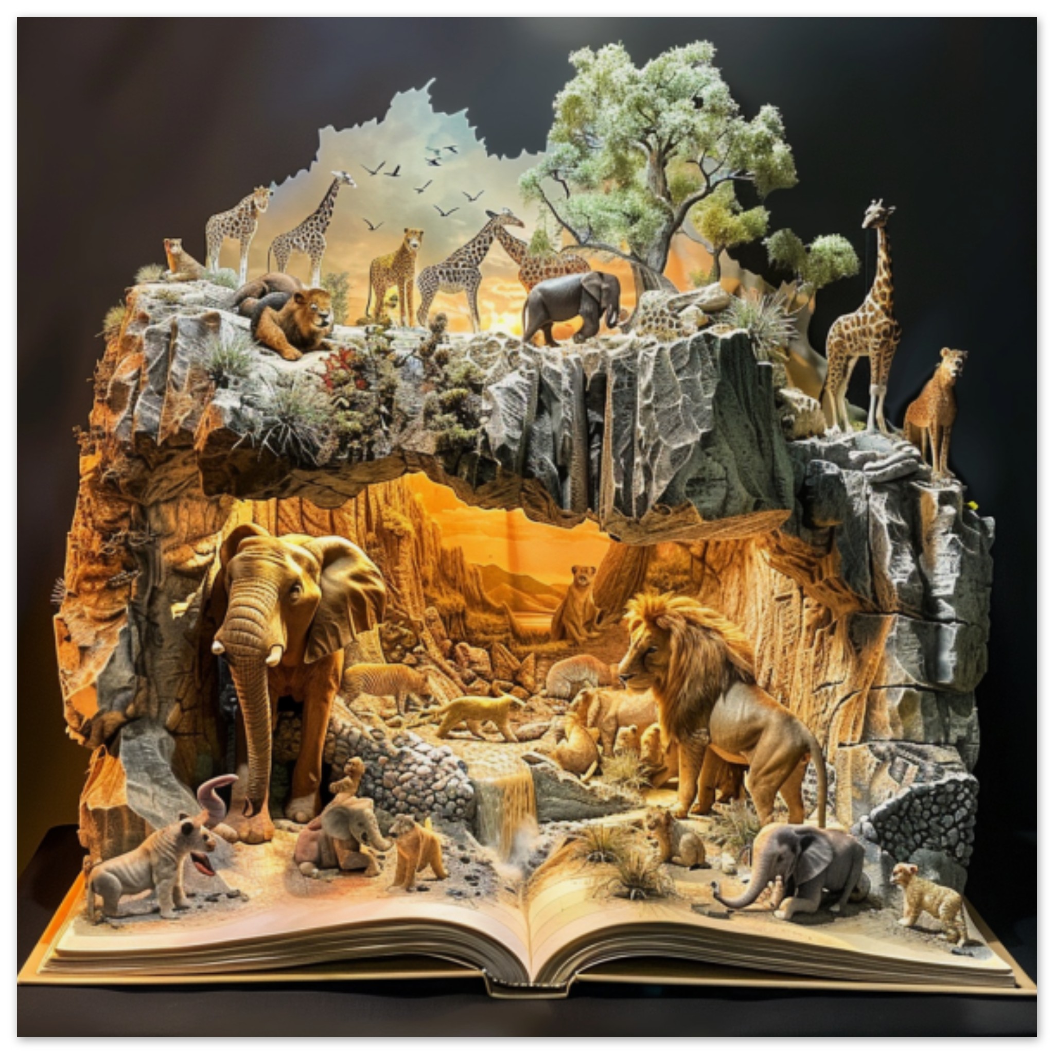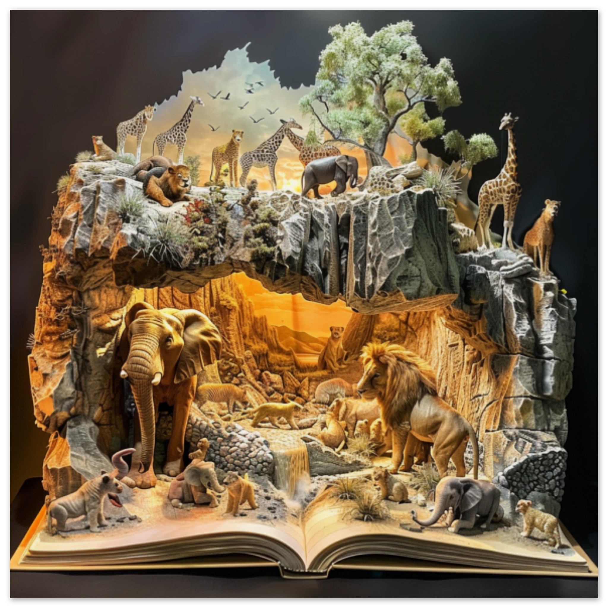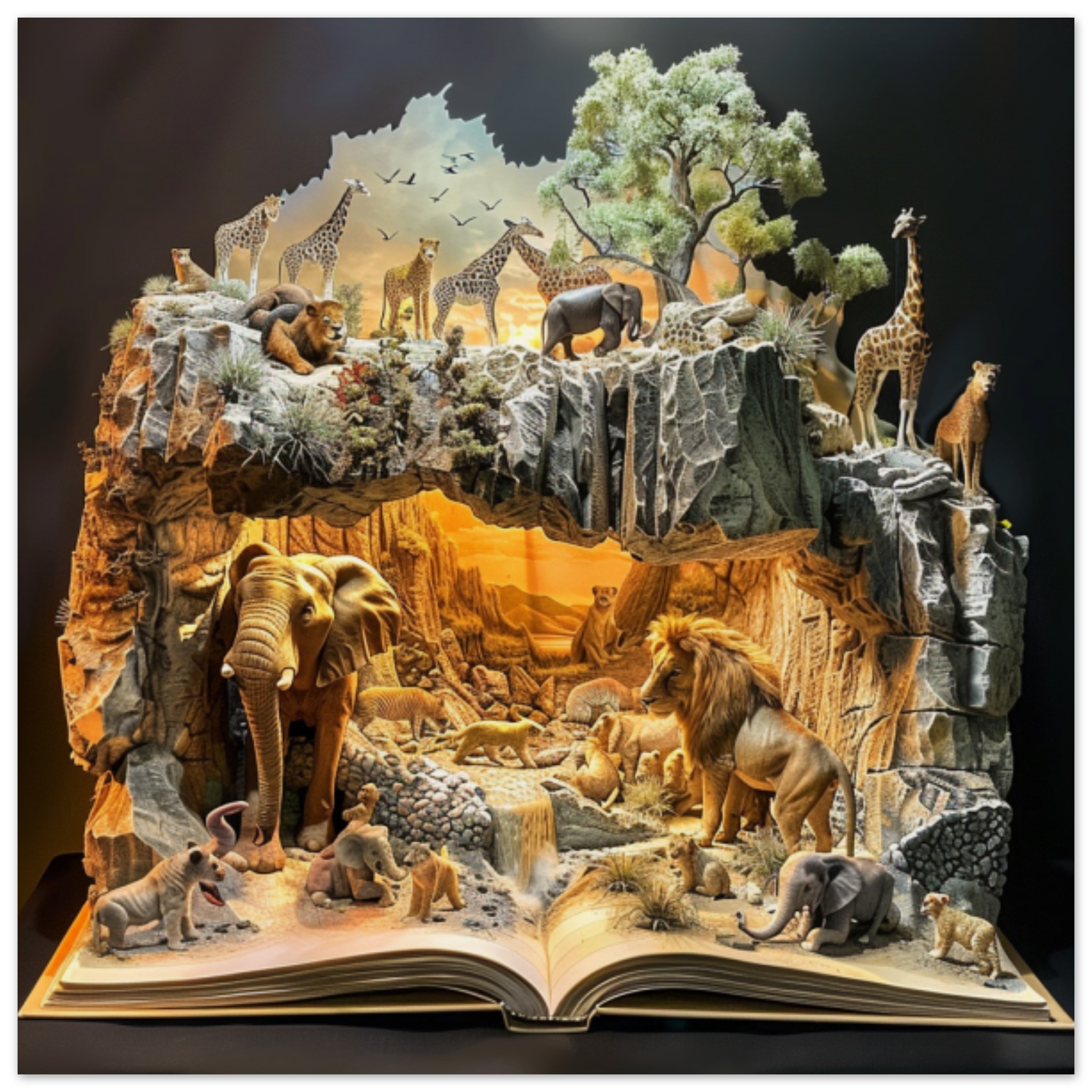 A detailed sculpture of animals is depicted in an open book, set against a black background. The sculpture includes a giraffe, an elephant with tusks, a lion, and various other mammal figures. The giraffe is standing in front of a bird, the elephant is lying down on the ground, and the lion is standing in front of a wall. The animals are intricately designed and appear lifelike. The scene is captured in a museum or indoor setting, showcasing the artistry and creativity of the sculptor. The colors of brown and black dominate the image, with accents of a warm orange hue.