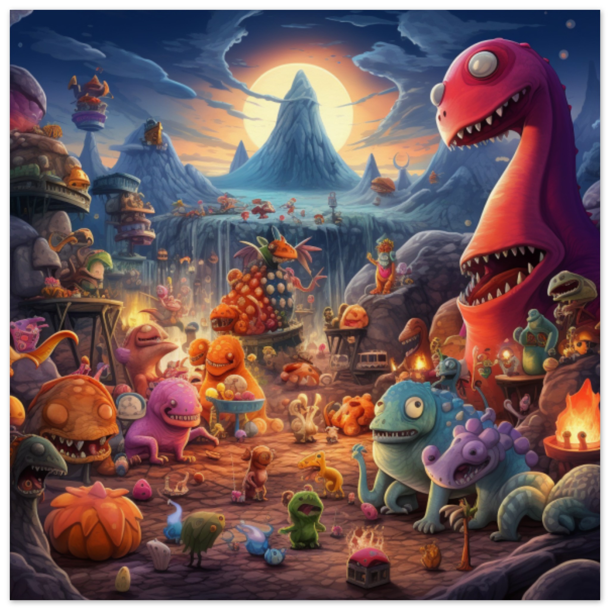 A whimsical cartoon illustration depicting a group of monsters gathered inside a dark cave. The monsters vary in shape and size, with one resembling a pink monster, another resembling a dinosaur, and a third resembling a pumpkin adorned with a pink and yellow flower. The scene is filled with playful animation, showcasing the monsters interacting with each other. In the foreground, there are two toy objects visible, one located towards the bottom center and the other towards the bottom right. The dominant colors in the image are various shades of brown, creating a warm and inviting atmosphere perfect for Halloween.