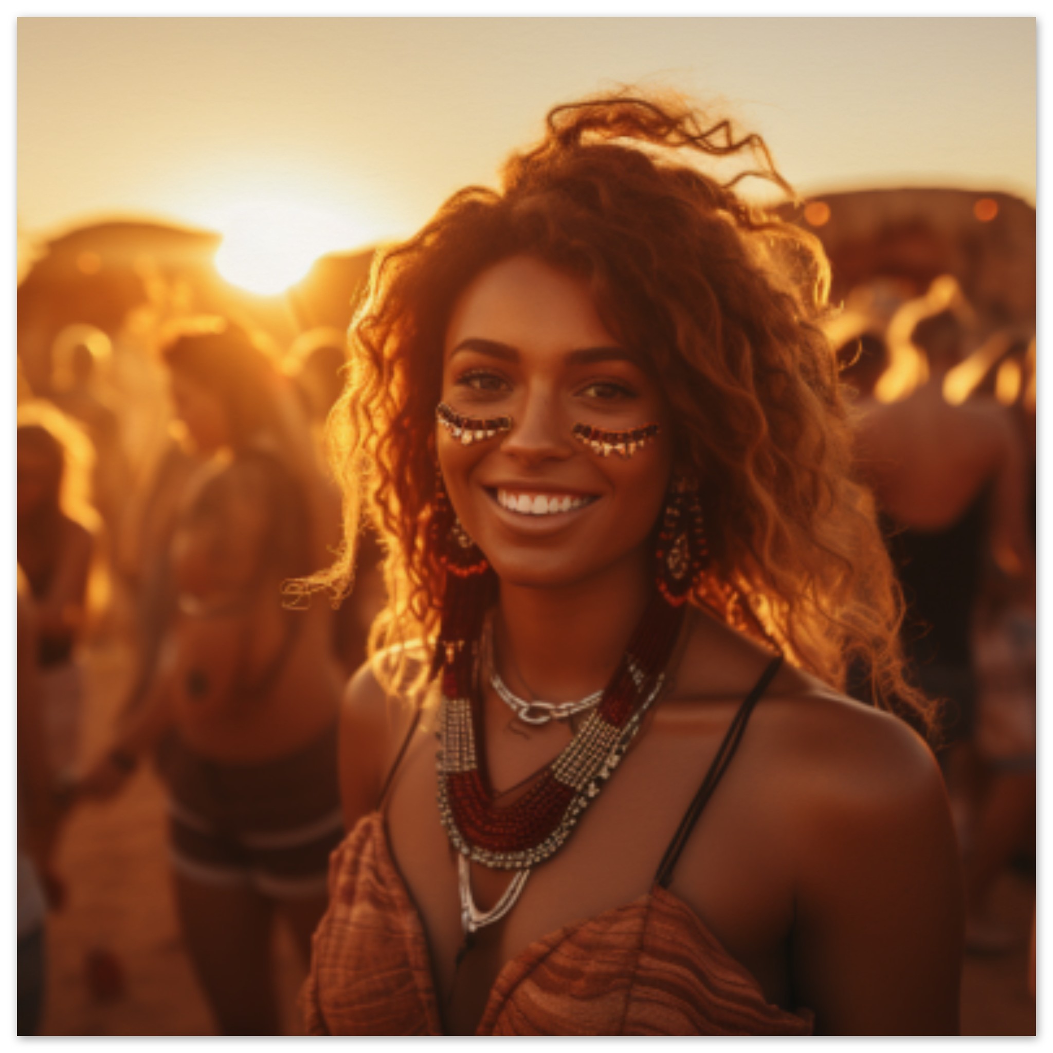 A woman with long curly brown hair is wearing a necklace and earrings. She is standing outdoors, smiling with the sunset in the background. The dominant colors in the image are brown, with a hint of gray in the accent color. The woman’s face is the focus of the photo, which also includes two other people in the background. The image is not black and white and shows a person’s face in a close-up shot. The woman’s face is slightly blurred, but her hair and accessories are clear and detailed.