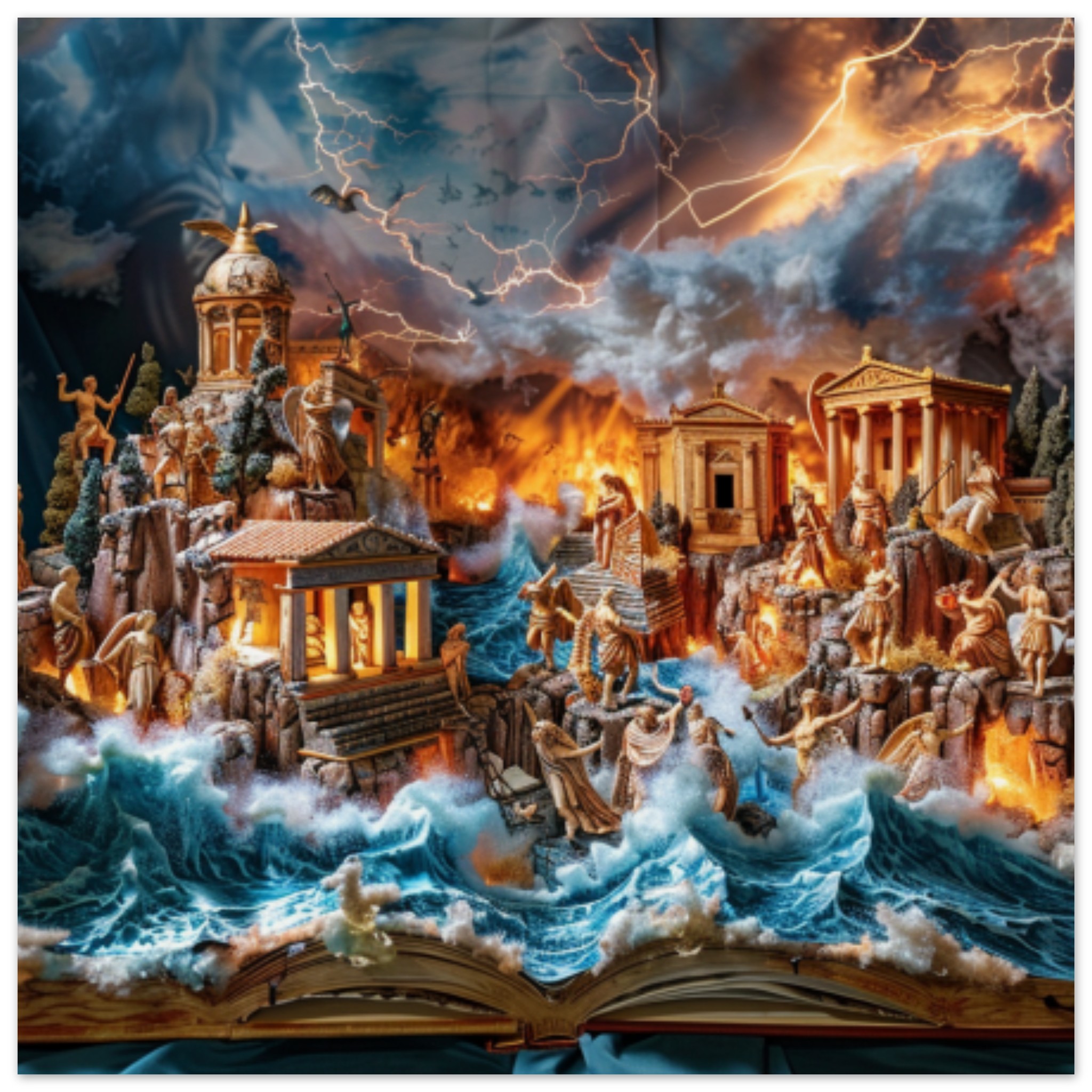 A captivating image featuring a book open to a painting of an ancient Greek city. The artwork depicts a majestic statue overlooking the cityscape, with storm clouds brewing in the background. The scene is rich in earthy tones of brown, black, and grey, creating a dramatic and atmospheric effect. The dominant colors of brown and black add depth to the composition, while the accent color of A76F24 adds a touch of warmth. This image is a beautiful blend of history, art, and nature, evoking a sense of mystery and awe.