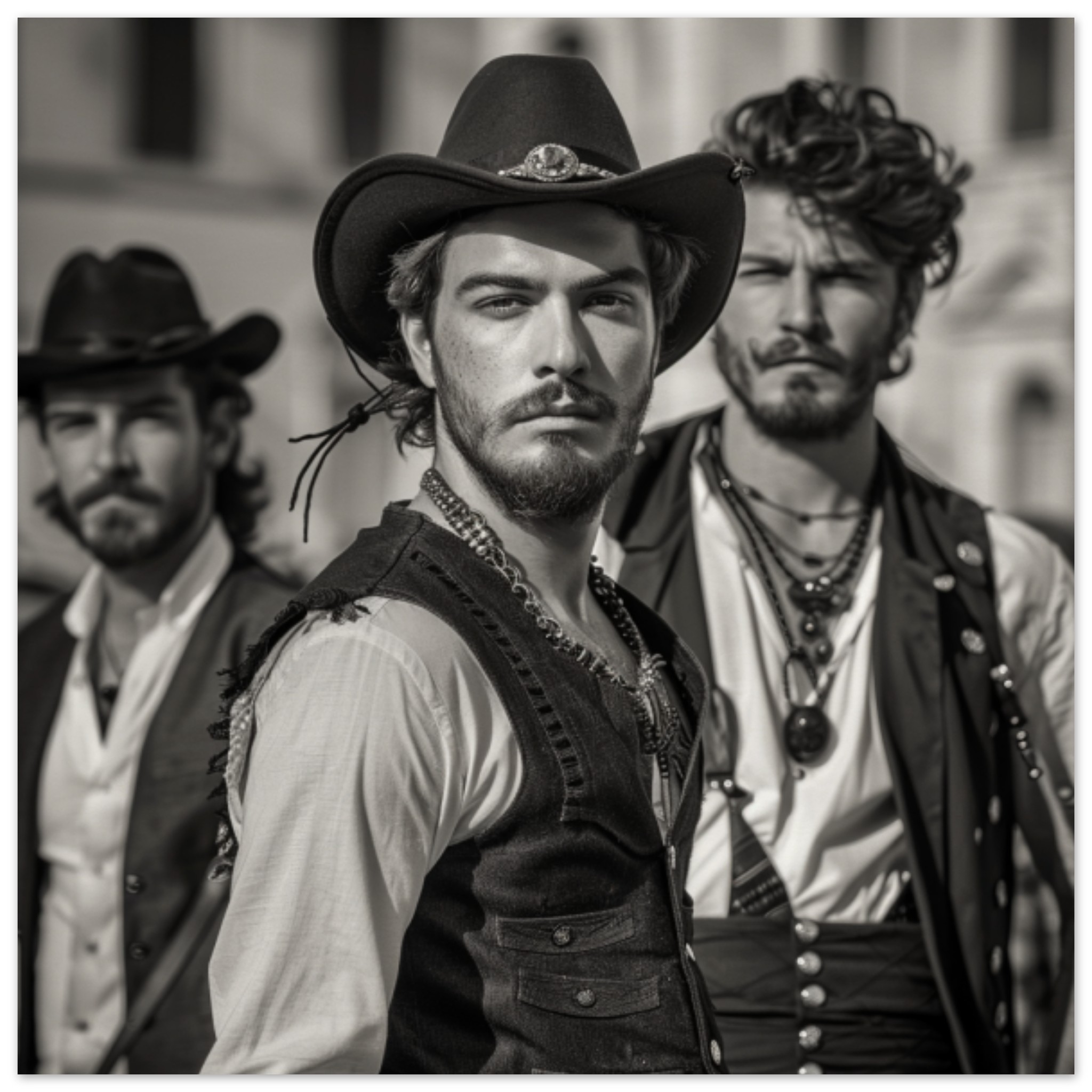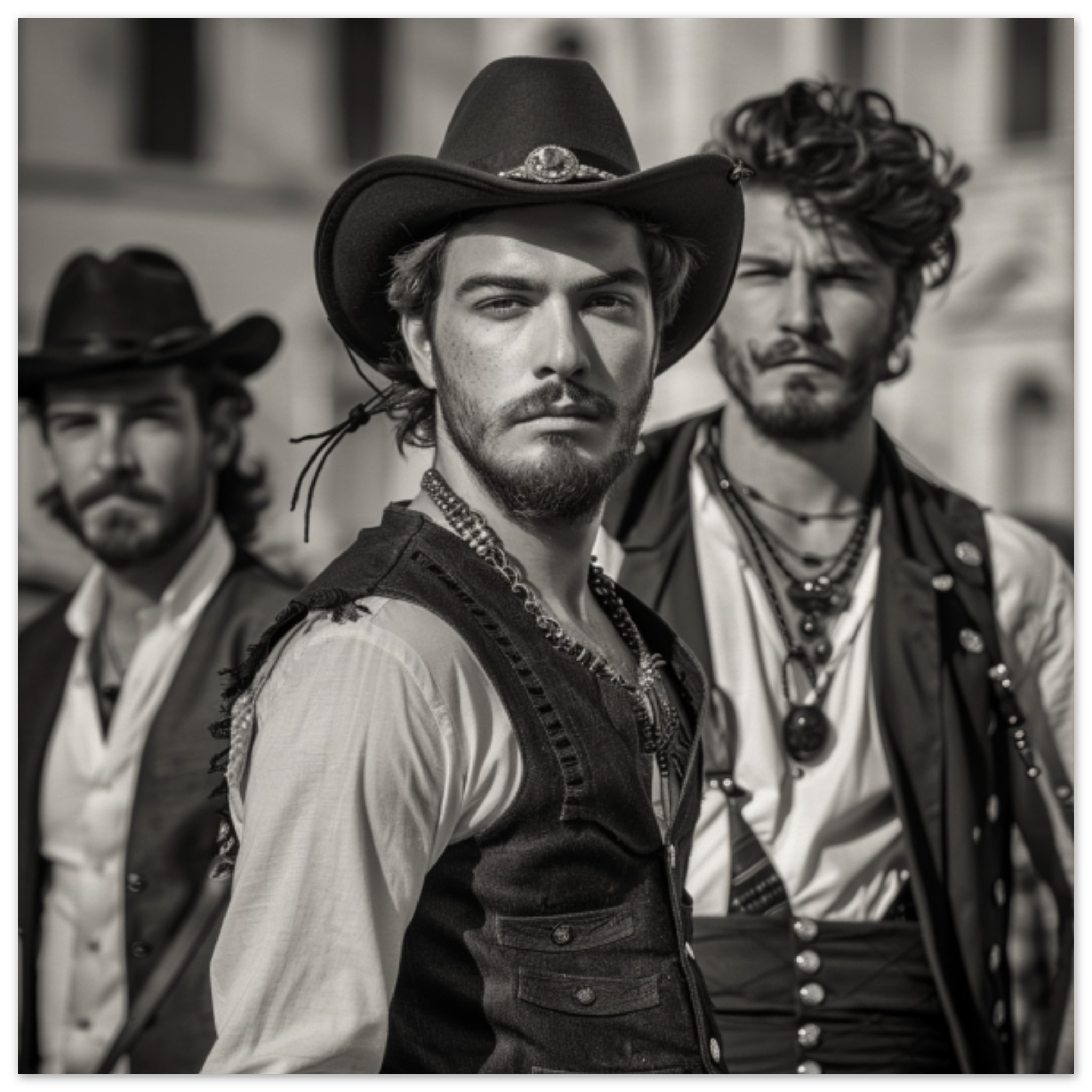 A group of men dressed in various styles of clothing are gathered together. One man is wearing a fedora hat and a necklace, while another man stands out in a cowboy hat. The group appears to be outdoors, with a street visible in the background. The image is in black and white, emphasizing the classic and timeless fashion choices of the men. Close-up shots reveal their facial features, including beards and expressions. The dominant colors in the image are grey and black, creating a cohesive and stylish aesthetic.