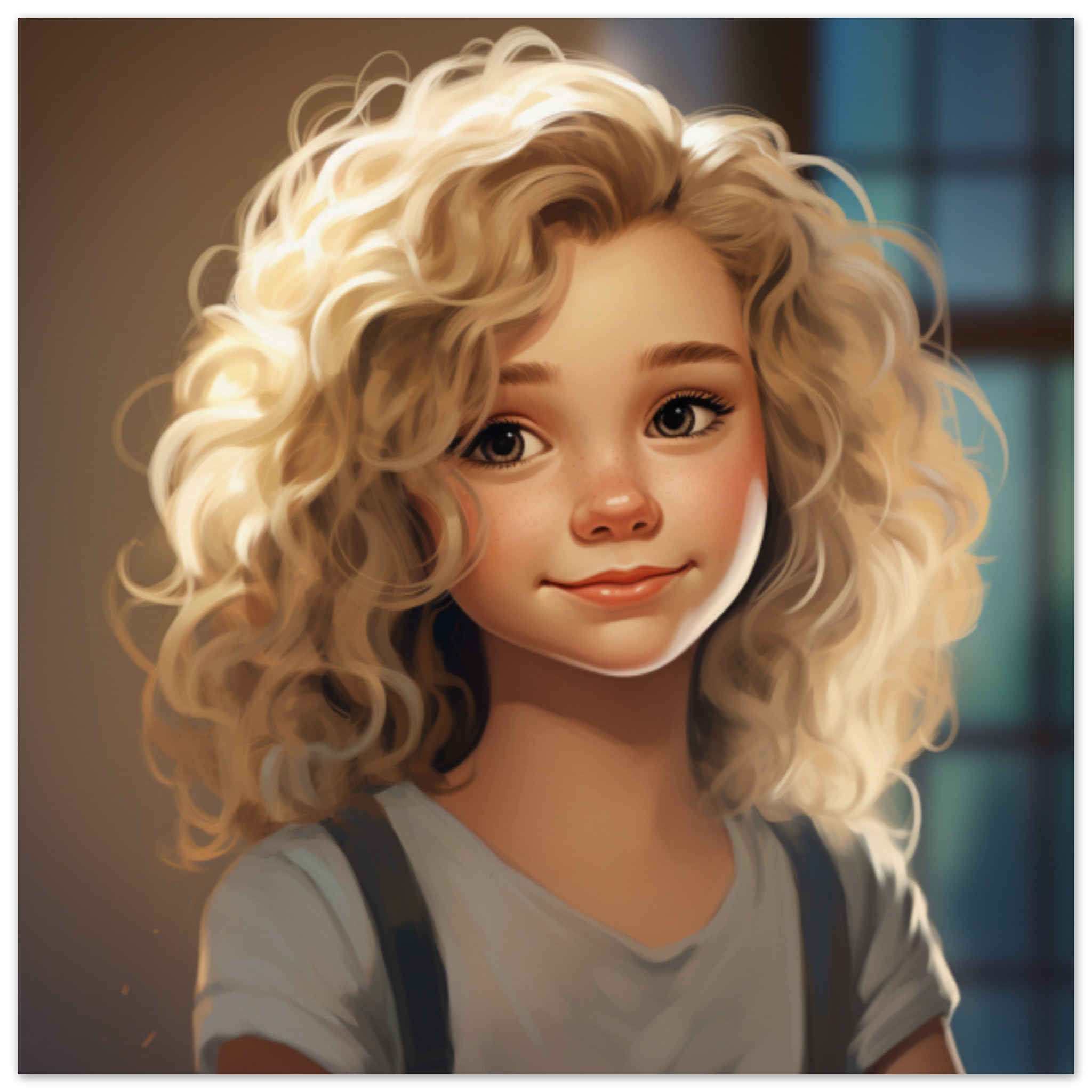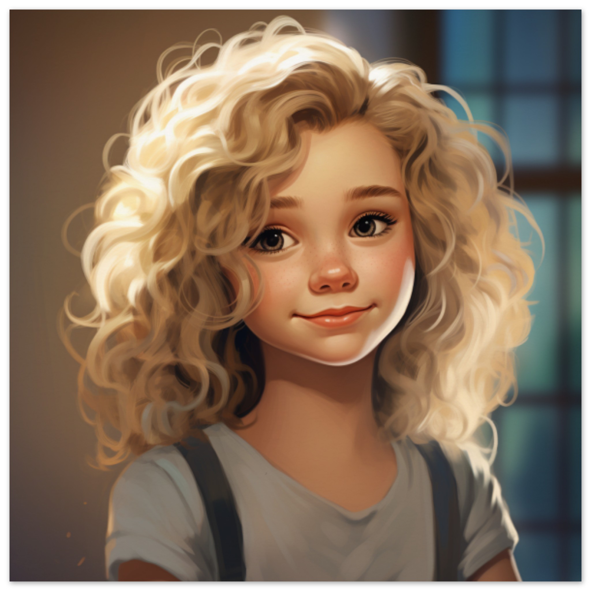 A young girl with curly blonde hair is featured in the image. She has a prominent human face with brown eyes and full lips. The girl is wearing clothing that is not clearly visible but appears to be casual. The background consists of shades of grey. The dominant colors in the image are brown and grey. The girl’s hair is the accent color, a dark shade of blue. The image is focused on the person’s face, specifically their chest area. The person is indoors, with the main focus on their blonde, curly hair.