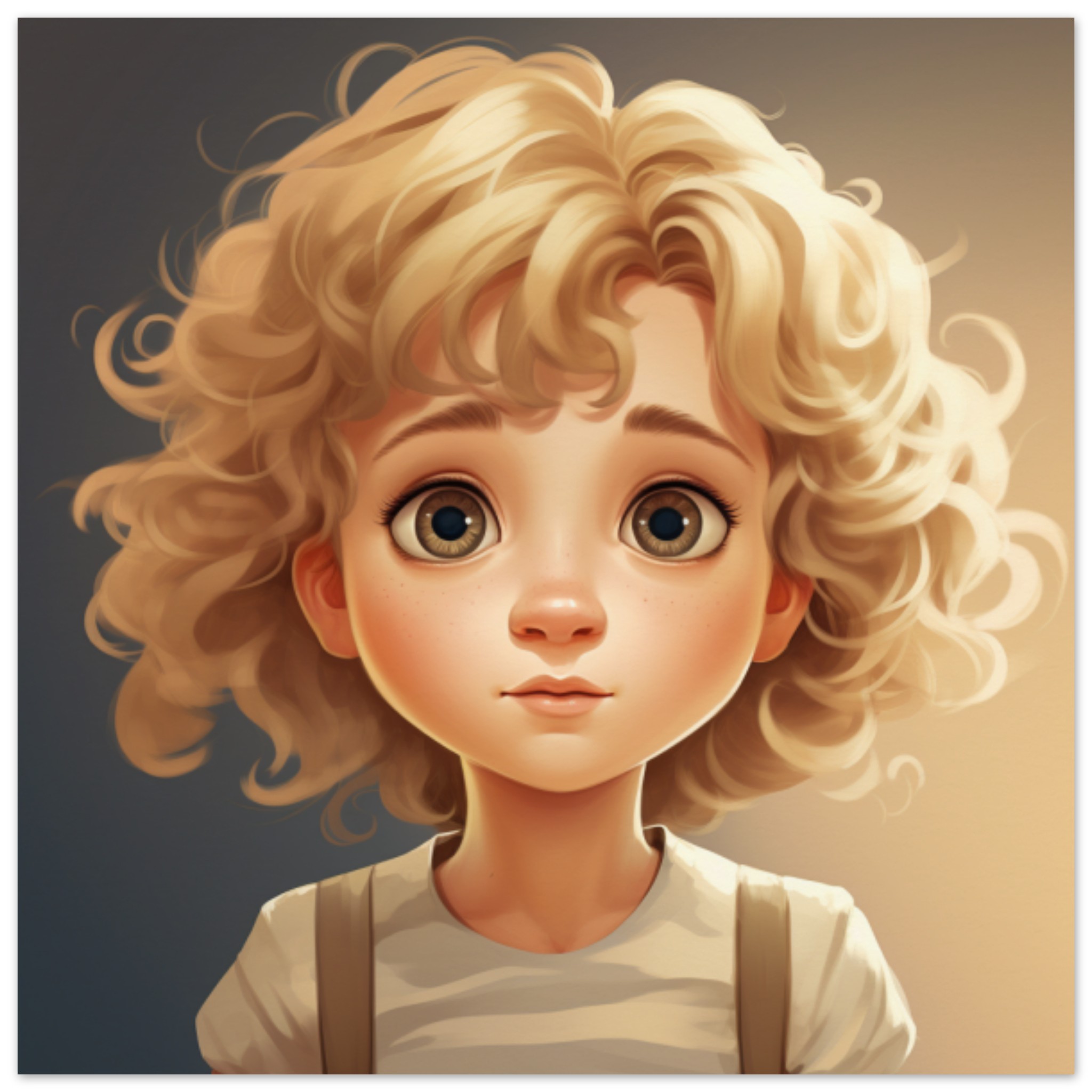 A detailed cartoon illustration depicting a young girl with big brown eyes, wearing brown clothing and a trendy hairstyle. The image is centered on a toy with a human face, displaying features commonly associated with dolls. The dominant colors in the artwork are shades of brown, with an accent color of dark gray. The girl’s eyes are enlarged and expressive, drawing attention to her animated appearance. The overall tone of the illustration is playful and whimsical, capturing the essence of childhood innocence and imagination.