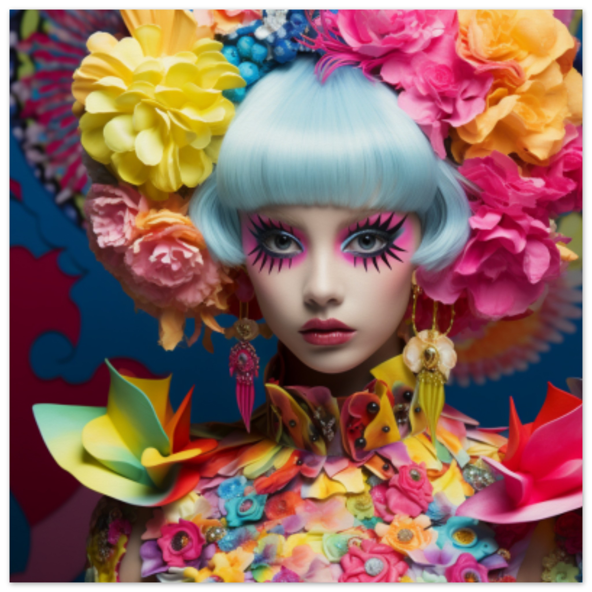 A vibrant image featuring a woman with striking blue hair adorned with colorful flowers. The background consists of a mix of pink and red hues. The woman’s face is the focal point, showcasing bold and artistic makeup. She exudes a doll-like quality, with a whimsical and playful essence. The image is not explicit or graphic, with a playful and artistic vibe. The dominant colors are pink and red, with an accent color of a deep blue. The scene is abstract in nature, with a textured feel. Overall, a visually captivating and unique composition.