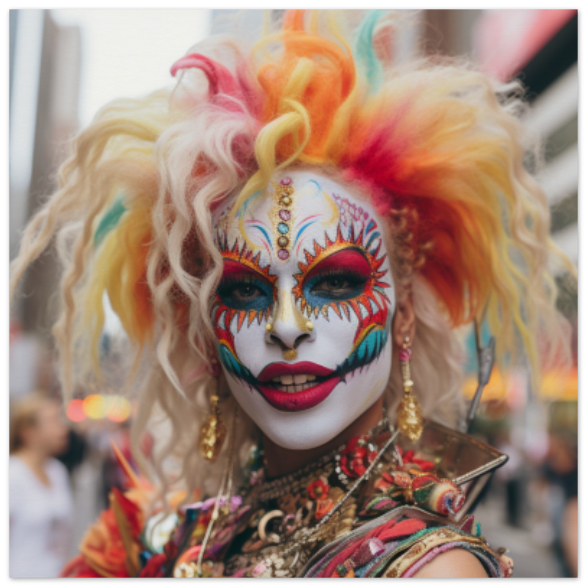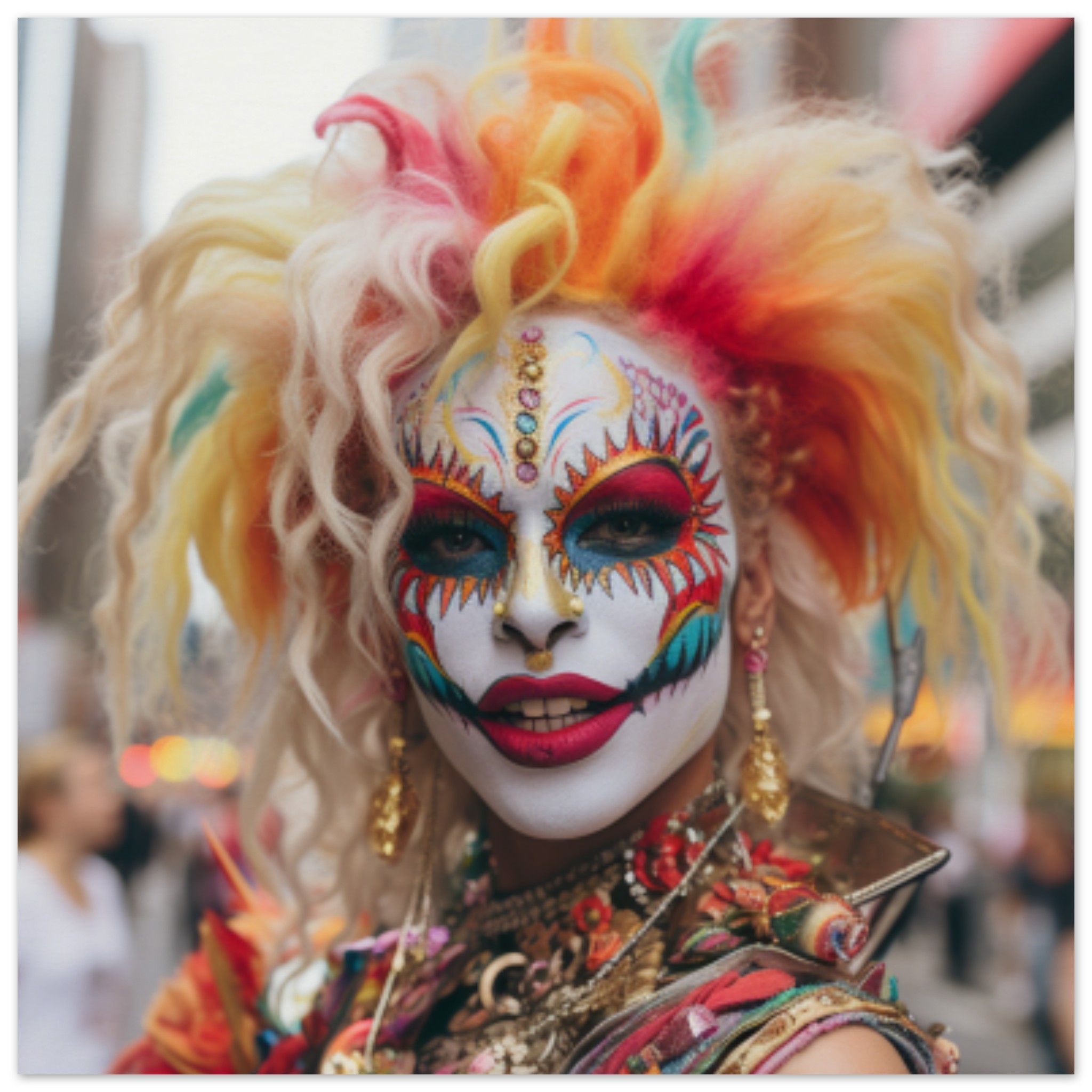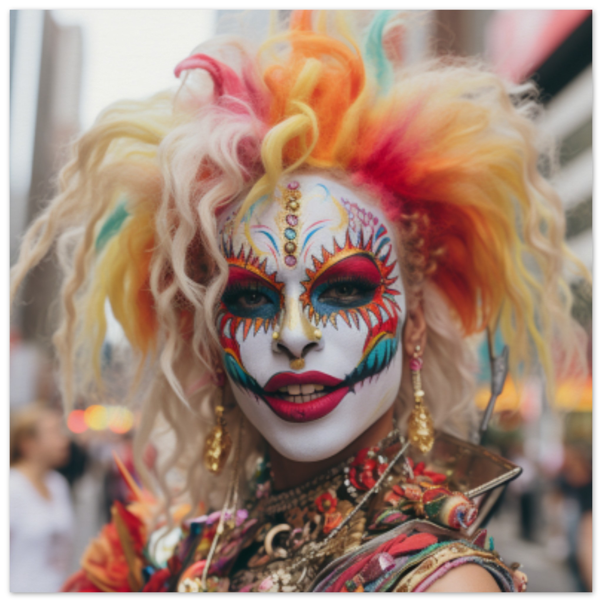 A woman with colorful hair and face paint is standing outdoors at a carnival or festival. She is wearing a vibrant costume resembling a masque or mask, possibly for Halloween or Mardi Gras. The woman’s grey and white face paint contrasts with her bright red accent color. The image shows two other people in the background, one wearing a black shirt. The main focus is on the woman in the center, with a blurry body and face paint. Overall, the scene conveys a festive and playful atmosphere with a hint of mystery and celebration.