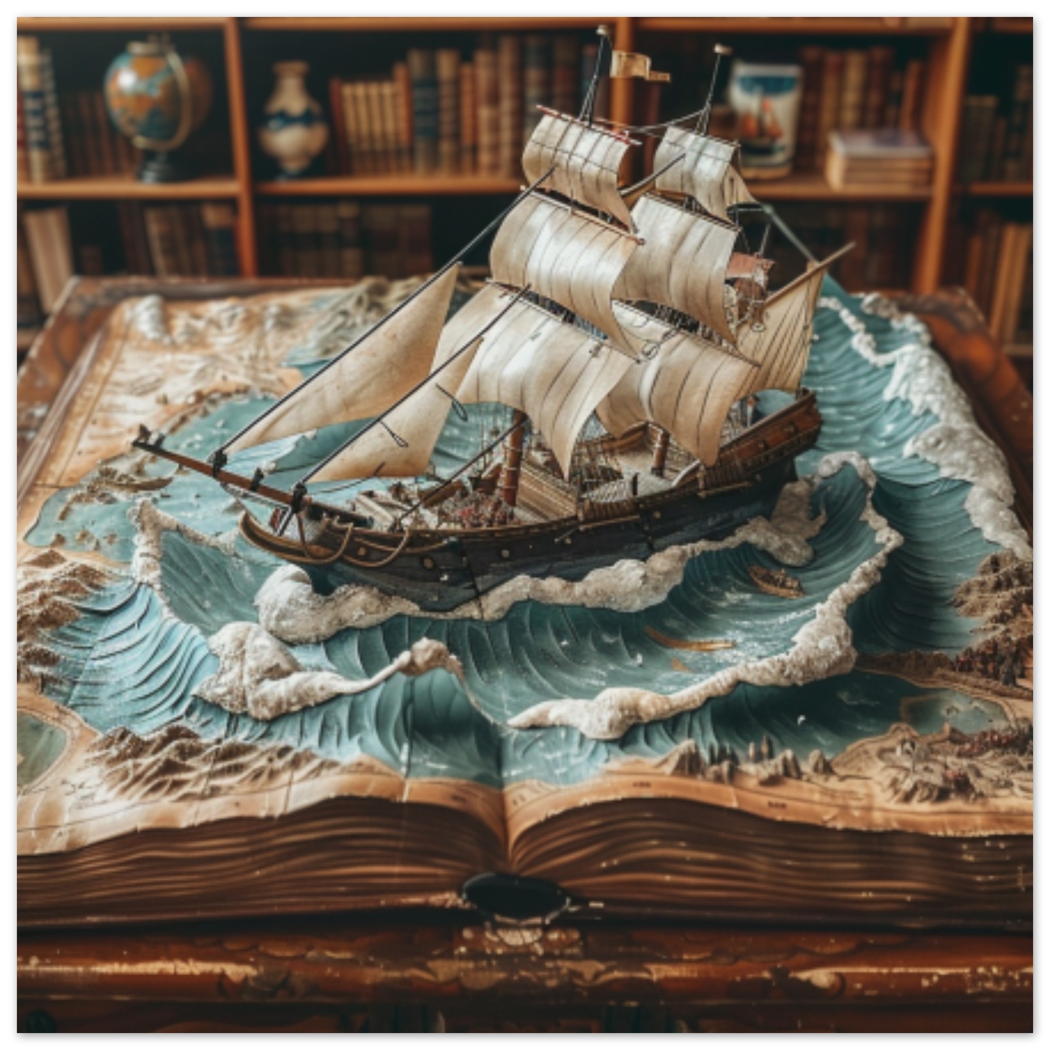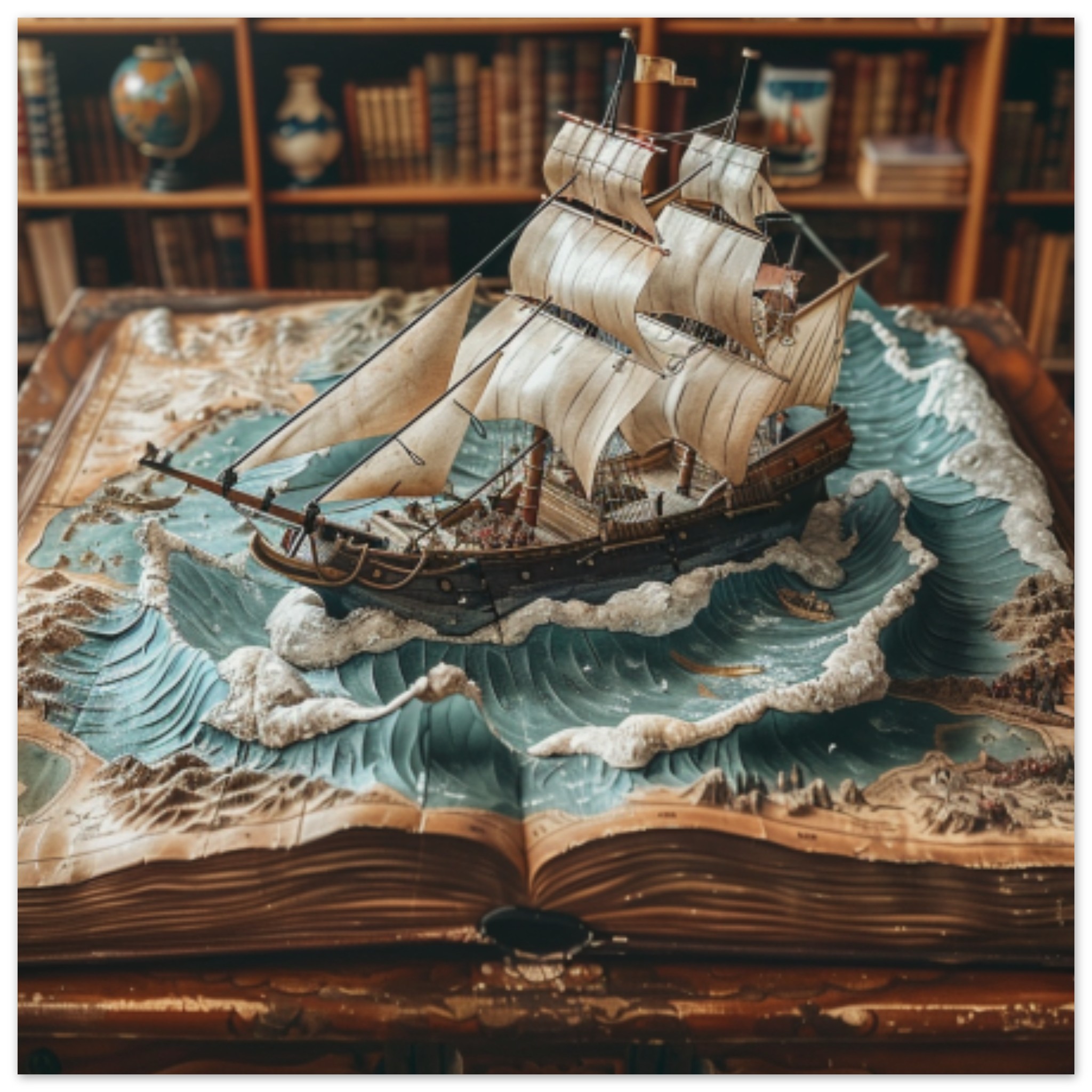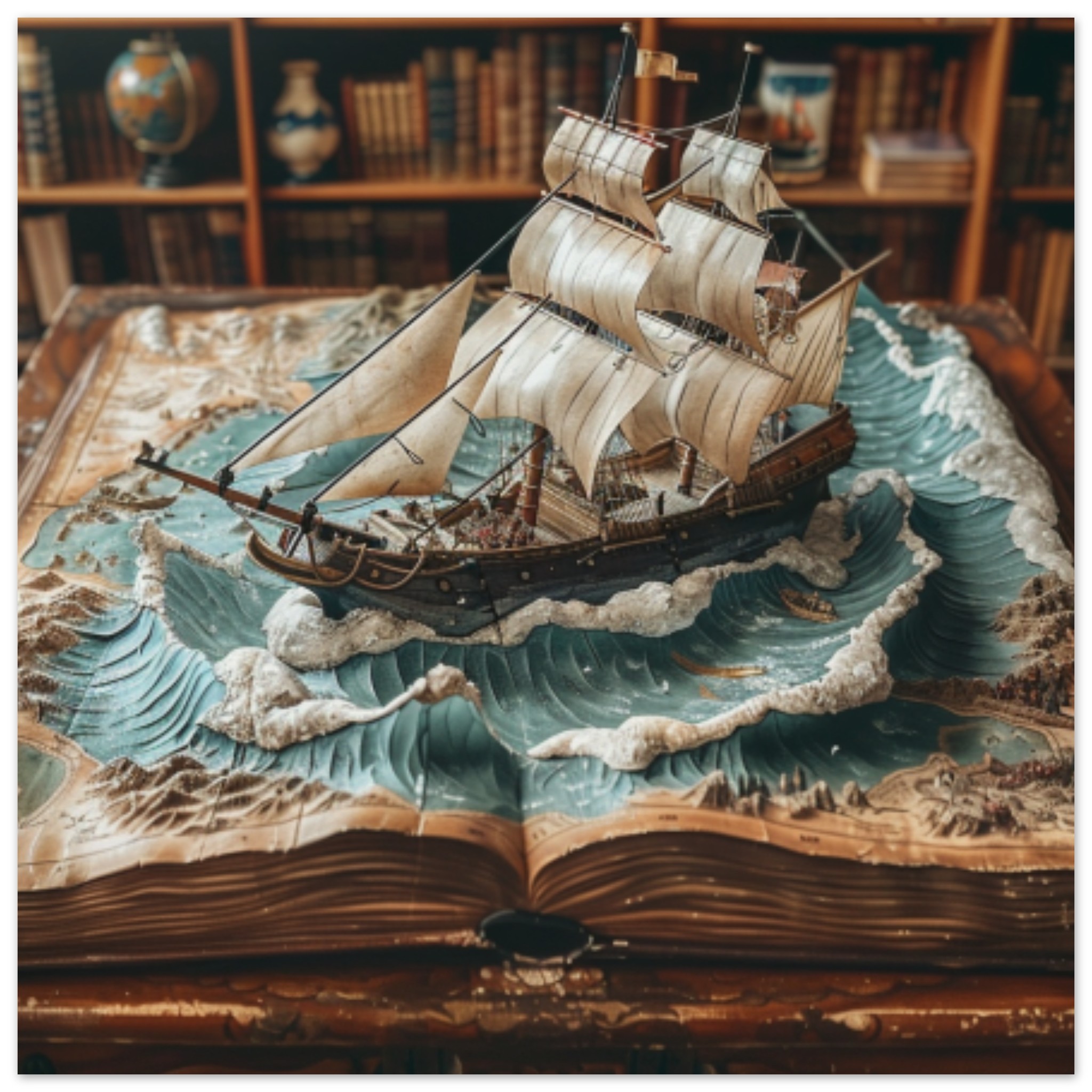 A model of a ship is placed on top of a book, creating a miniature nautical scene. The ship model is intricately detailed, with wooden accents and sails billowing in the wind. The background consists of a brown bookshelf, adding to the nautical theme of the display. The image is well-lit, showcasing the grey and black colors of the ship model against the warm tones of the bookshelf. The overall composition is aesthetically pleasing, with a focus on the craftsmanship of the ship model and the serene atmosphere it evokes.