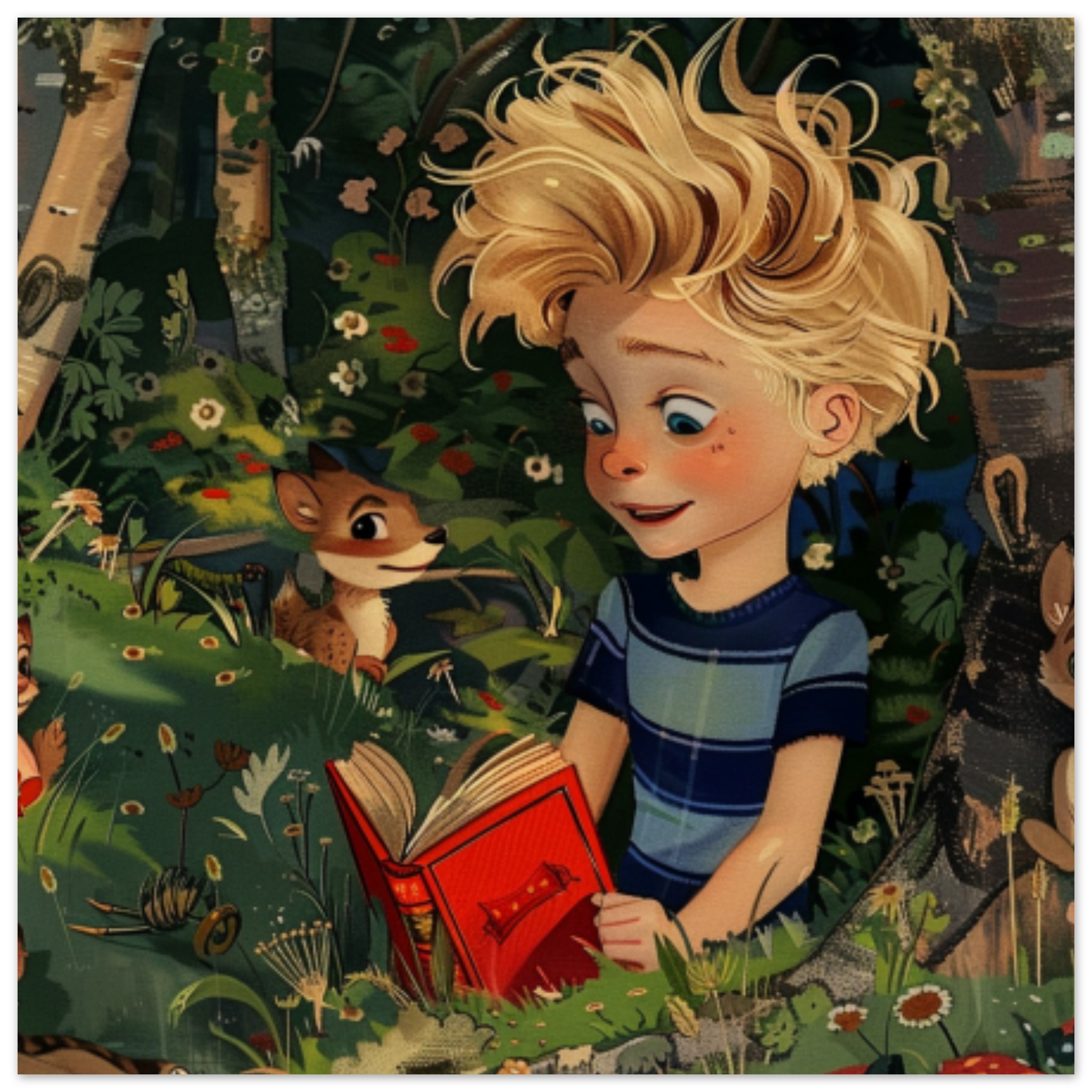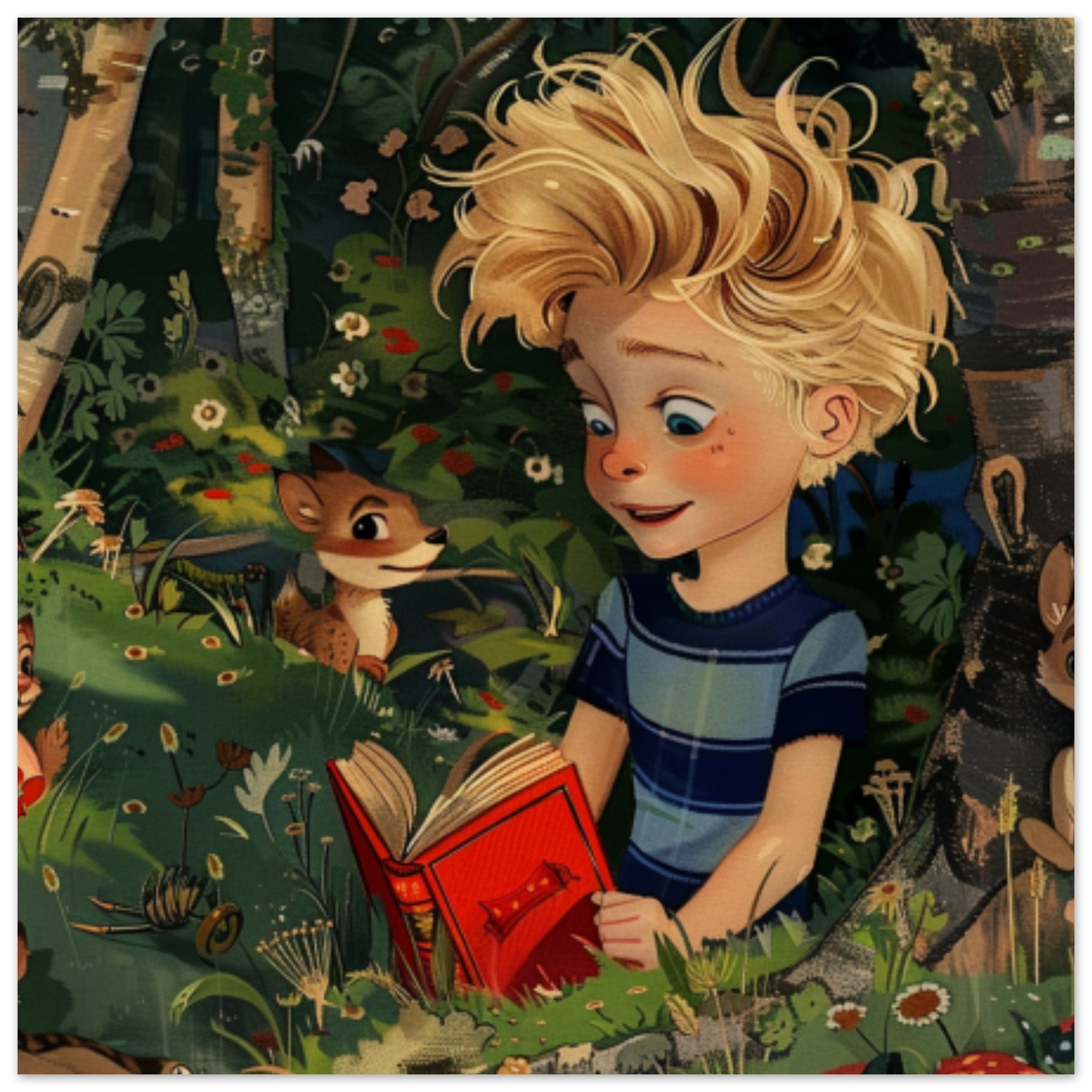 A detailed cartoon illustration featuring a young boy immersed in a book, surrounded by lush green woods. The boy is sitting on a tree stump, engrossed in his reading. A cute animal, possibly a cat, is playfully looking at him from a distance. The color palette consists mainly of black and brown tones, with a vibrant accent color of C31708 adding a pop of color. The image evokes a sense of tranquility and a love for reading in a natural setting. The overall scene is peaceful and serene, with a touch of whimsy.