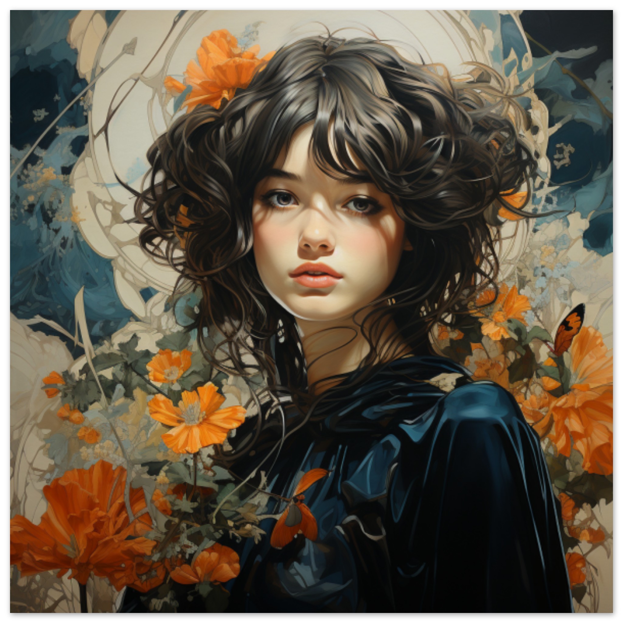 A beautiful painting of a woman with flowers in her hair is depicted in this image. The woman has long black hair and is facing the viewer directly. She has a serene expression on her face, with delicate features and a hint of a smile. The flowers in her hair add a touch of color to the mostly black background. The dominant colors in the image are black, with an accent color of 305059. The woman’s face is the main focus of the painting, exuding a sense of tranquility and grace.