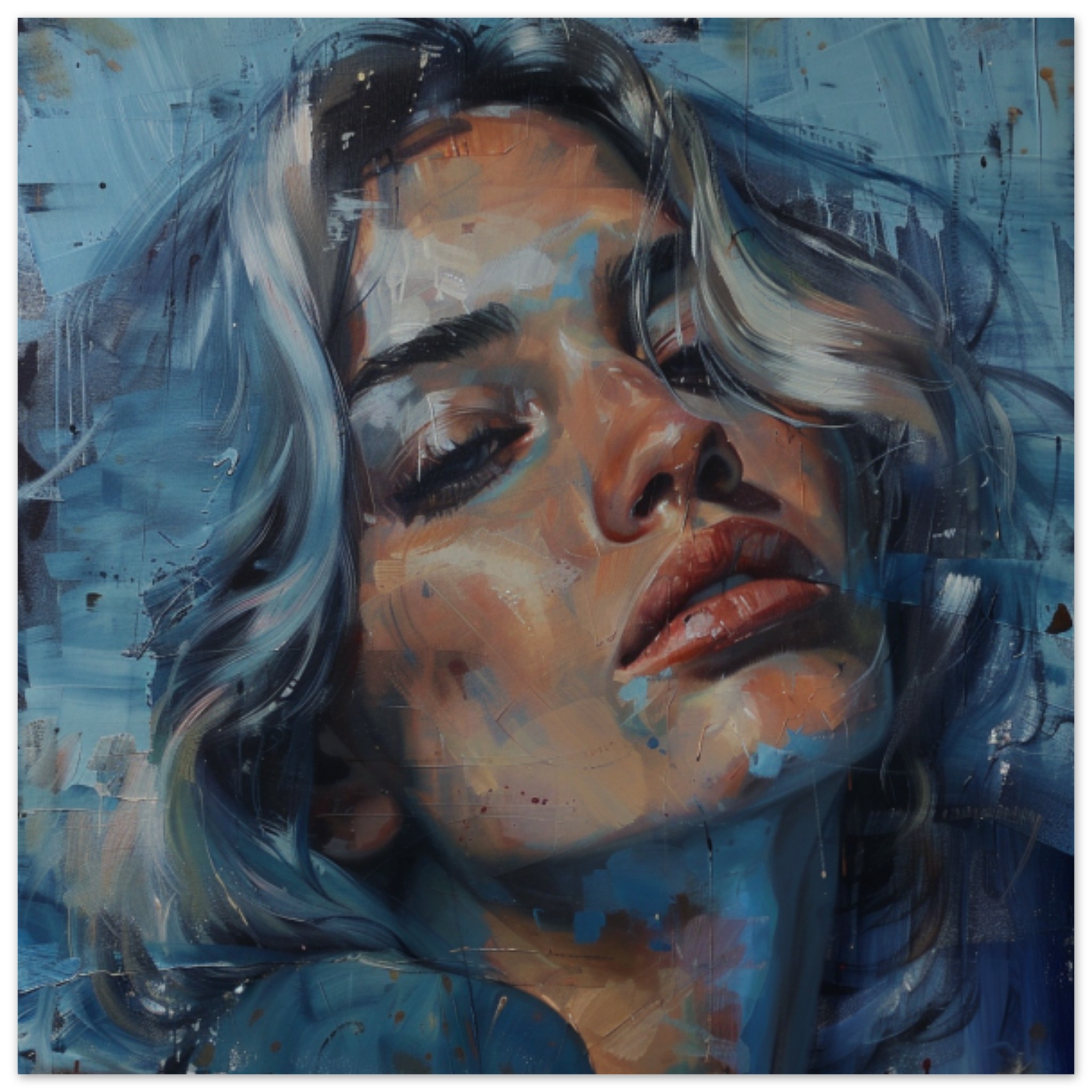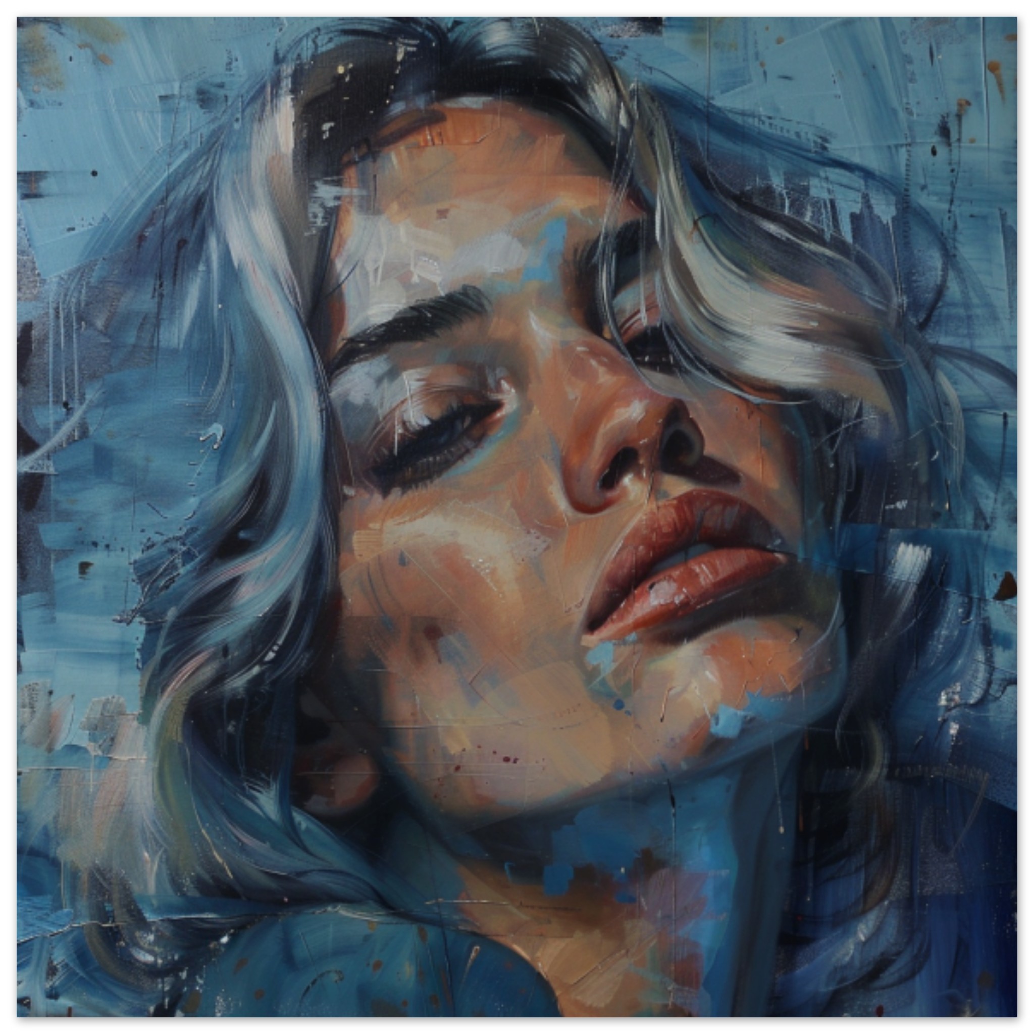 A beautiful painting of a woman’s face is depicted in this artwork. The portrait showcases intricate details and expressive features, capturing the essence of modern art. The use of acrylic paint adds depth and texture to the piece, creating a visually captivating composition. The color palette consists of dominant shades of grey against a black background, with a subtle accent color of 304961. This striking artwork is a testament to the artist’s skill in creating compelling visual art, making it a stunning example of contemporary portraiture.