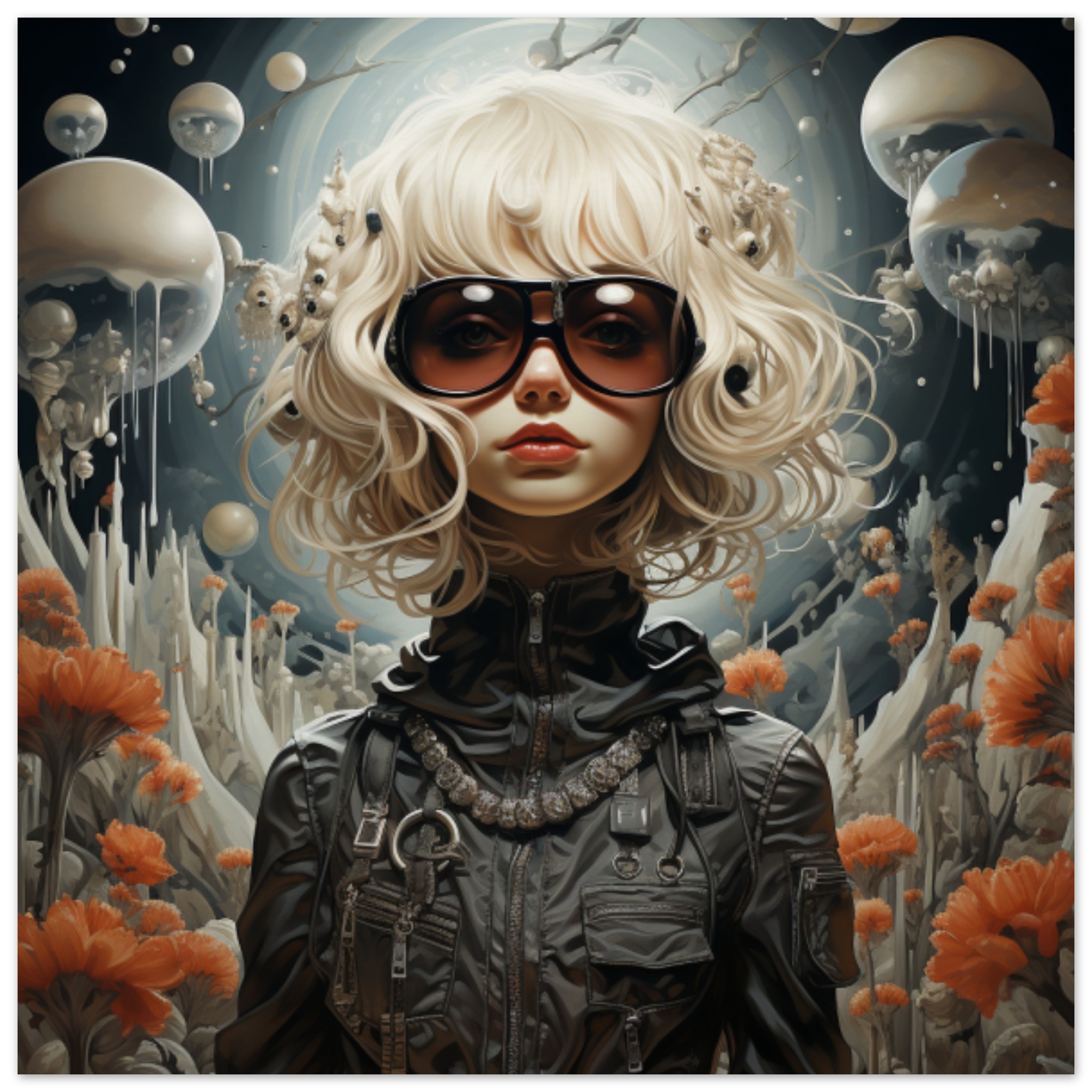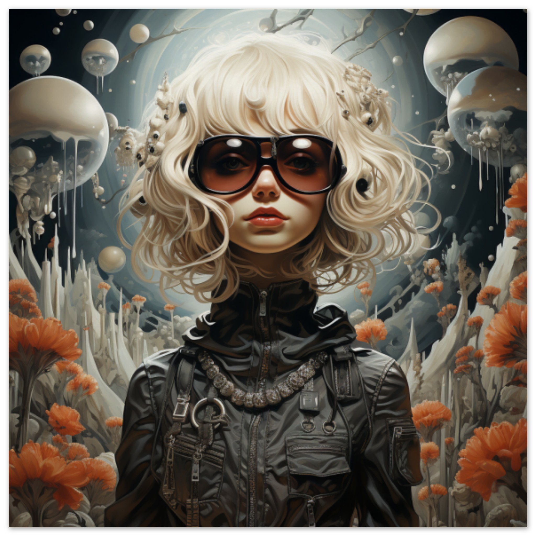 A cartoon depiction of a woman with glasses and flowers is shown in this image. The woman is wearing a black jacket and has a human face with no identifiable landmarks in the background. The dominant colors in the image are grey and black, with an accent color of 965A35. The image does not contain any adult, racy, or gory content. The tags associated with the image include cartoon, human face, fictional character, and anime. The image features a person as the main object, positioned towards the center with a width of 403 pixels and a height of 583 pixels.