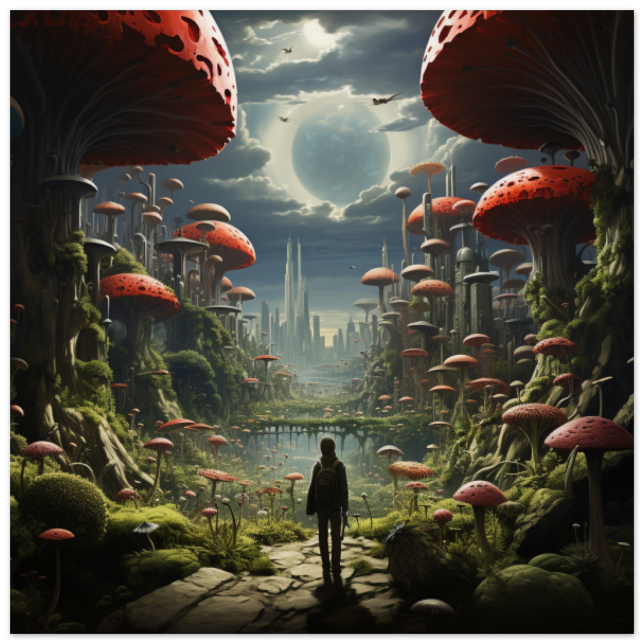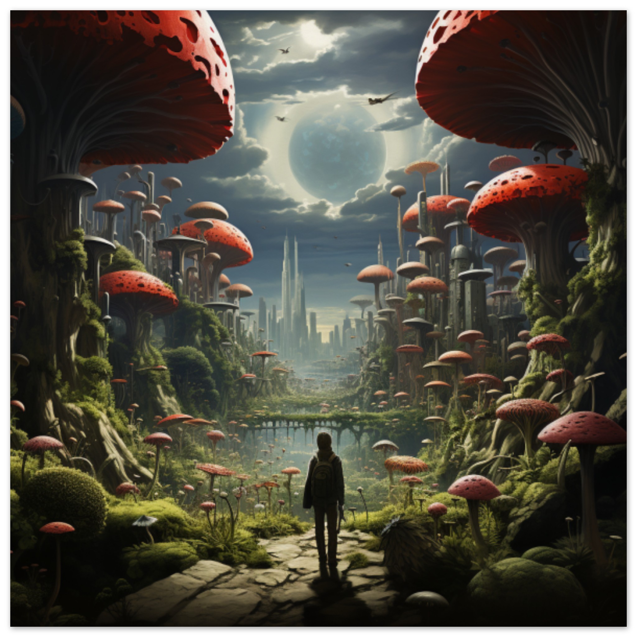 A person is standing in a fantasy landscape that resembles a reef or aquarium, with various plants and outdoor elements. The image has dominant colors of black and grey, with an accent color of 6E3829. The person is located towards the center of the image, with a score of 0.64. The image is not black and white, and there are no faces, celebrities, landmarks, or text detected. The image is categorized as “others_” and “outdoor_”. The overall adult, racy, and gory content scores are low.