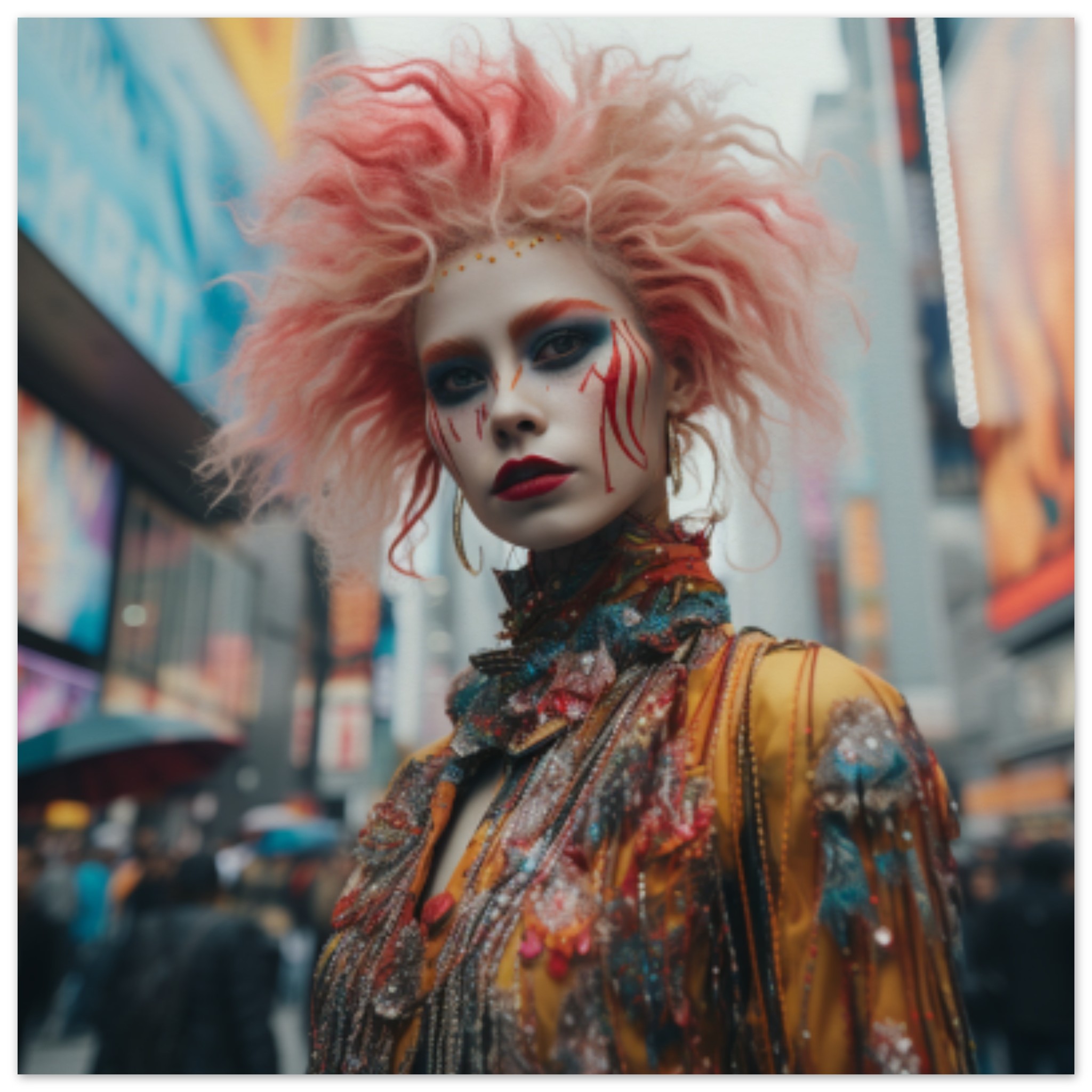 A woman with pink hair and makeup stands outdoors in a street festival wearing a costume. The image, with a resolution of 600×400 pixels, features dominant colors of black and grey. The woman, with a face partially blurred, is the main focus of the photo, with another person also visible in the background. The scene is lively and festive, capturing the essence of a fun and creative event. The woman’s pink hair and vibrant makeup add to the overall playful and colorful atmosphere of the image.