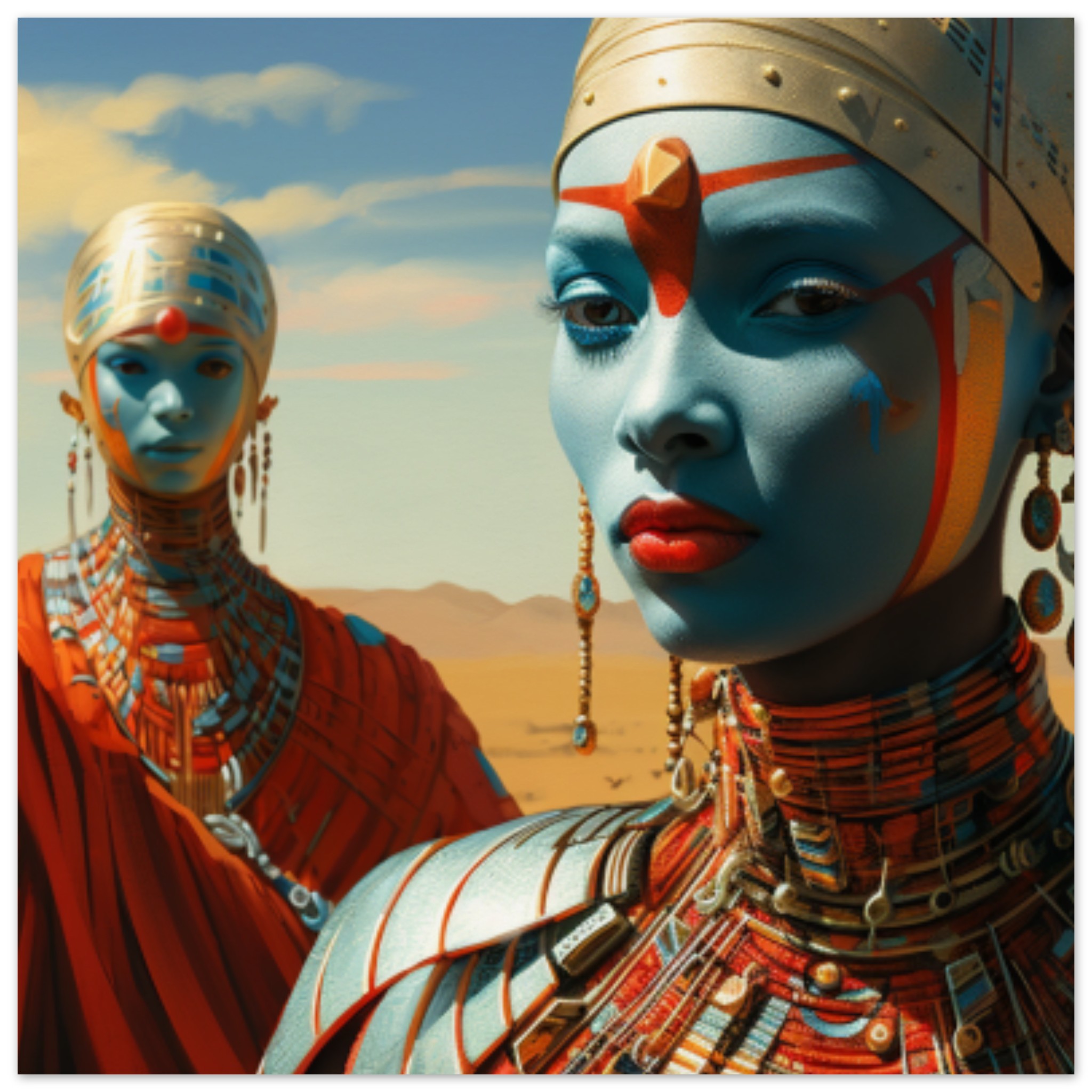 A woman is depicted wearing a garment with blue face paint and a gold hat. The image, with a resolution of 600×400, shows the woman against a background dominated by red and brown colors. She is outdoors, with a clear sky in the backdrop. Two instances of a person are detected in the image, with one person located at the center and another on the left. The woman’s face is painted blue, and she is wearing a striking gold hat. The overall scene exudes a vibrant and culturally rich atmosphere.