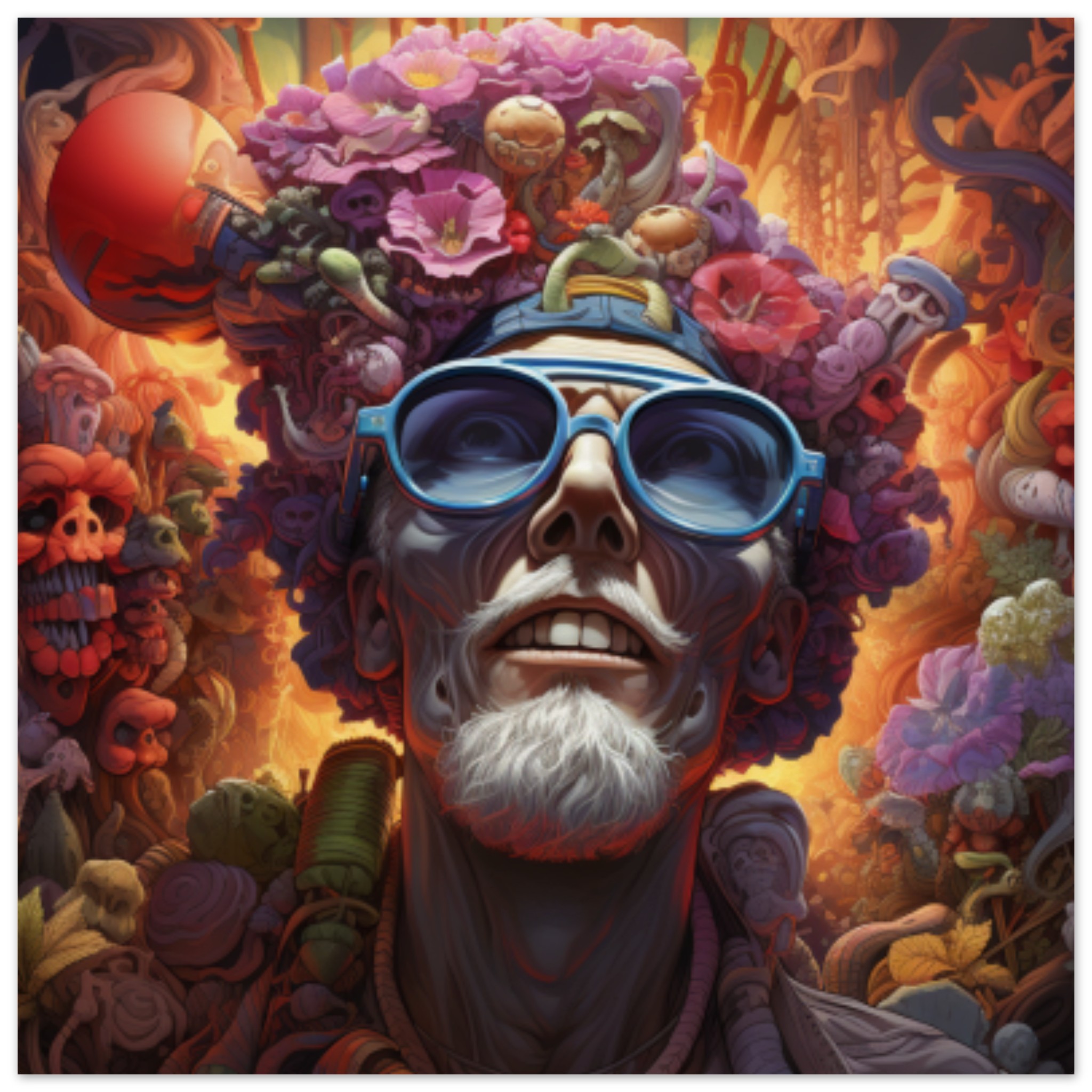 A man with glasses and a beard is wearing a colorful reef of flowers on his head. The man is looking directly at the camera with a calm expression. His glasses have blue frames that complement the vibrant flowers. The background is black, making the brown tones of the flowers and the man’s skin stand out. The image is artistic and whimsical, showcasing a unique and creative style. The man’s facial features are clear and well-defined, adding to the overall aesthetic of the composition. It is a visually striking portrait that exudes a sense of creativity and individuality.