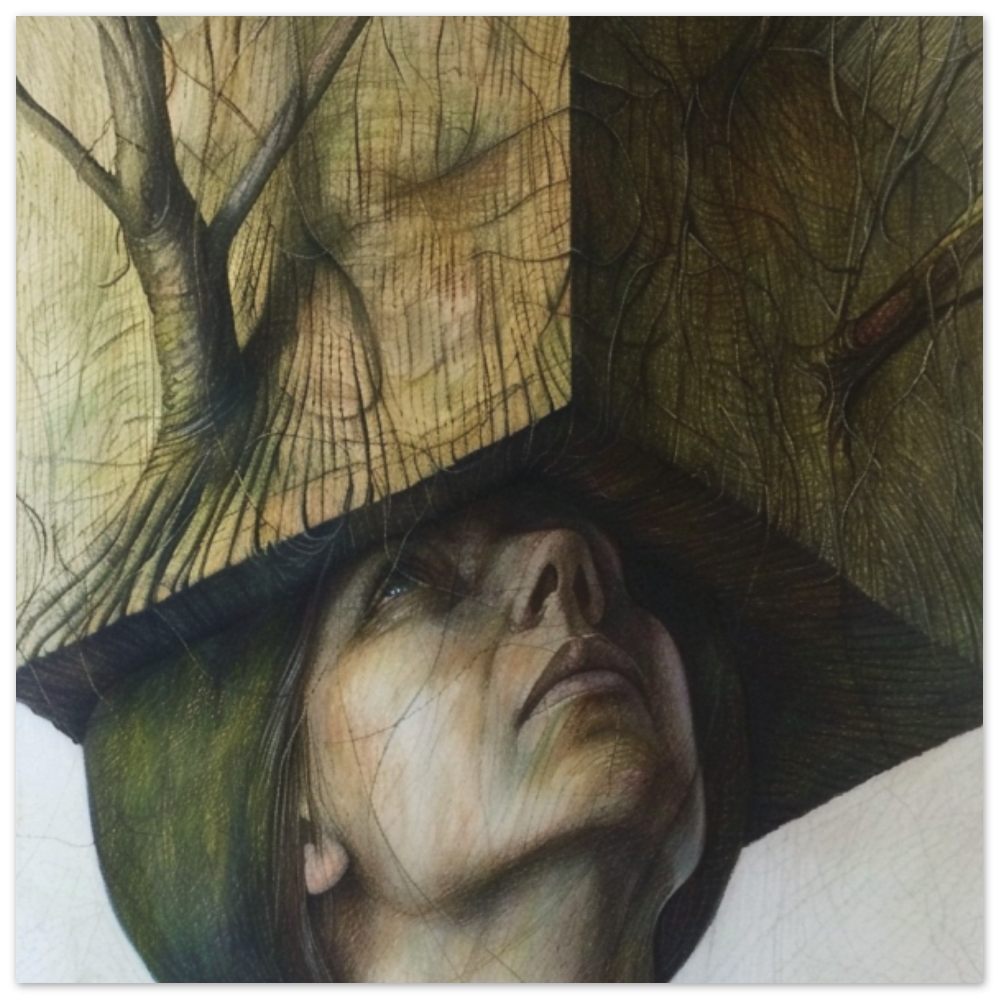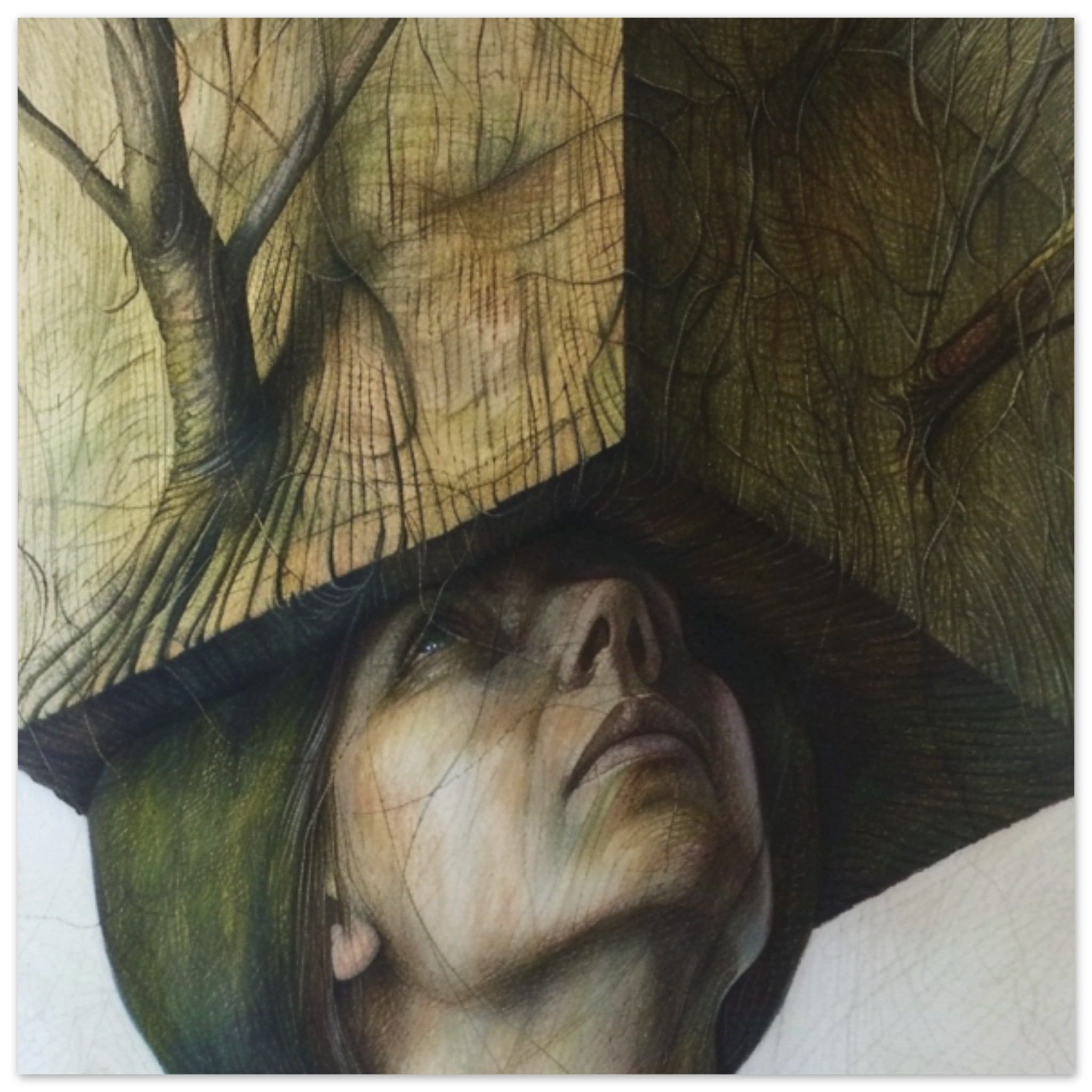 A detailed painting of a woman with a tree on her head is depicted in this image. The woman’s face is the main focus, showing intricate details and emotions. The artwork is done in a sketch style, with a mix of colors including white as the dominant color. The woman is wearing a hat that blends into the tree on her head, creating a unique and artistic look. The overall composition is a close-up portrait of the woman, showcasing the creativity and skill of the artist. This image is a captivating and imaginative piece of art.