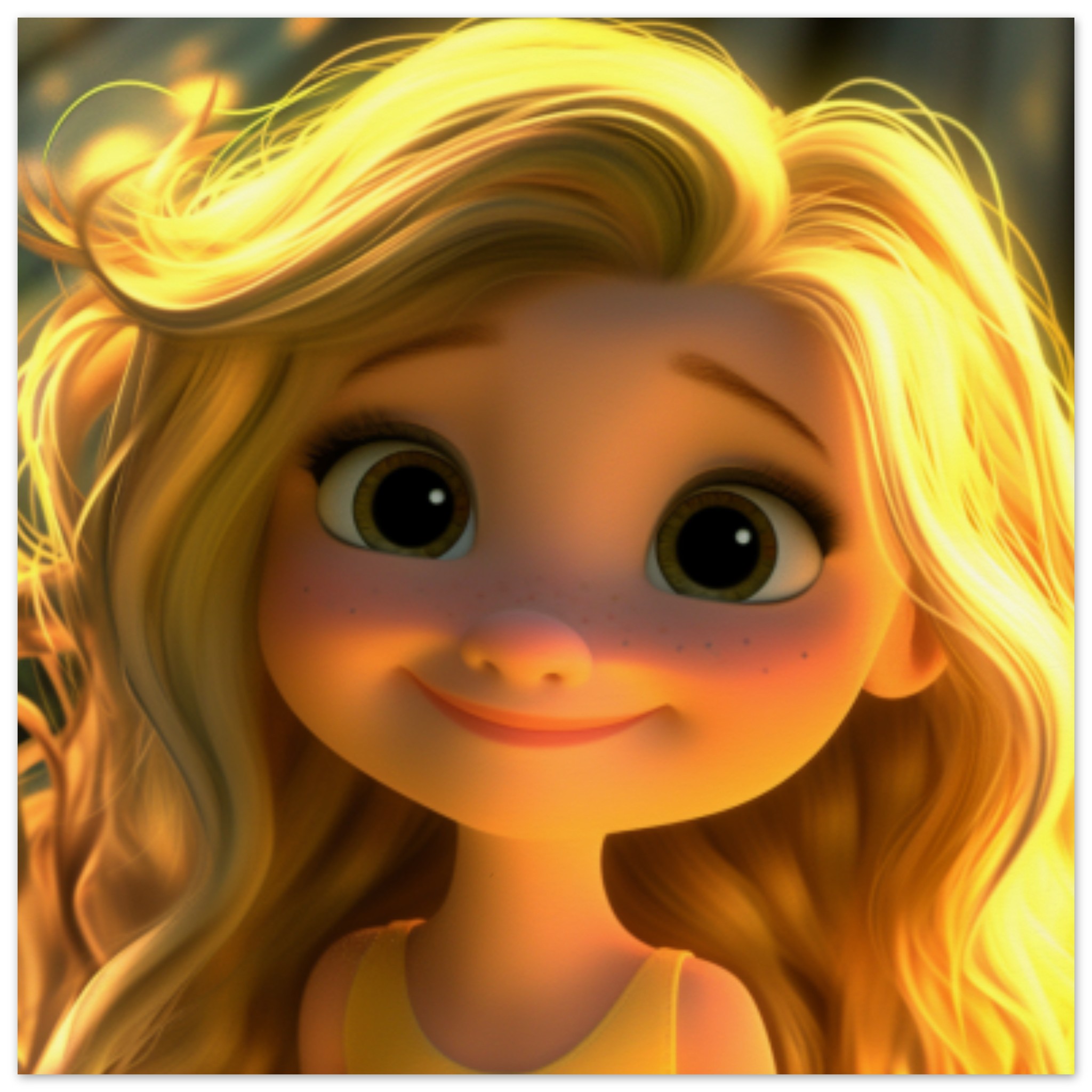 A colorful cartoon image featuring a girl with long blonde hair, wearing a brown dress. The background is a vibrant yellow color. The main focus is on a doll in the center of the image, with a detailed face and eyes. The image is not adult, racy, or gory in content, suitable for all ages. The dominant colors are brown and yellow, with the accent color being a shade of green. The image is not black and white. The image is tagged as a toy, doll, cartoon, girl, person, and yellow. The category of the image is people portrait.