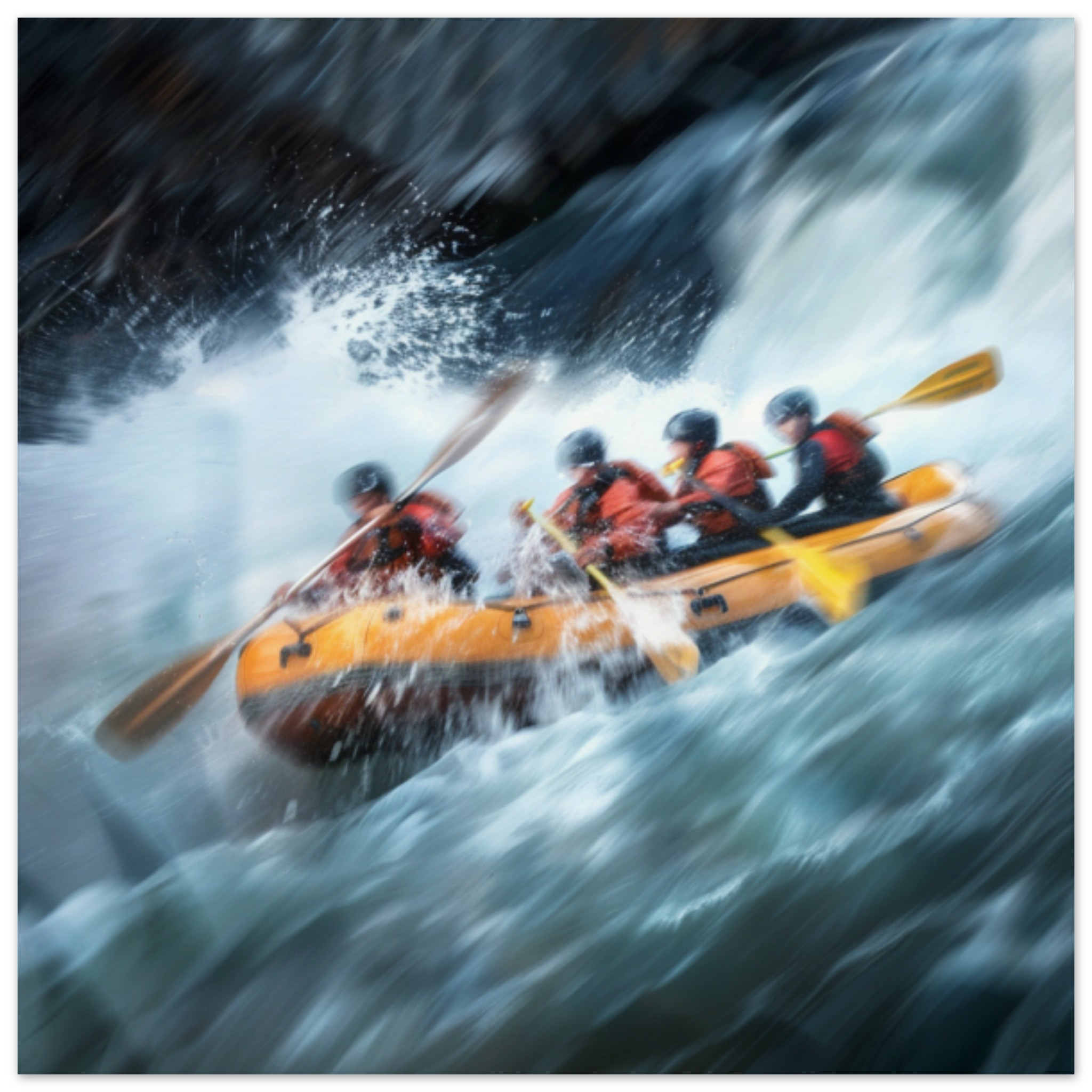 A group of people are seen on a white water raft in the middle of a black river. The individuals are wearing life jackets and are paddling through the rapid water. The raft is inflatable and there is a canoe nearby. The scene shows an outdoor recreational activity taking place on the water. The dominant colors in the image are white and black, with an accent color of AB7120. The image is not black and white. The tags associated with the image include watercraft, outdoor, transport, rapid, water, paddle, raft, life jacket, rafting, and inflatable boat.