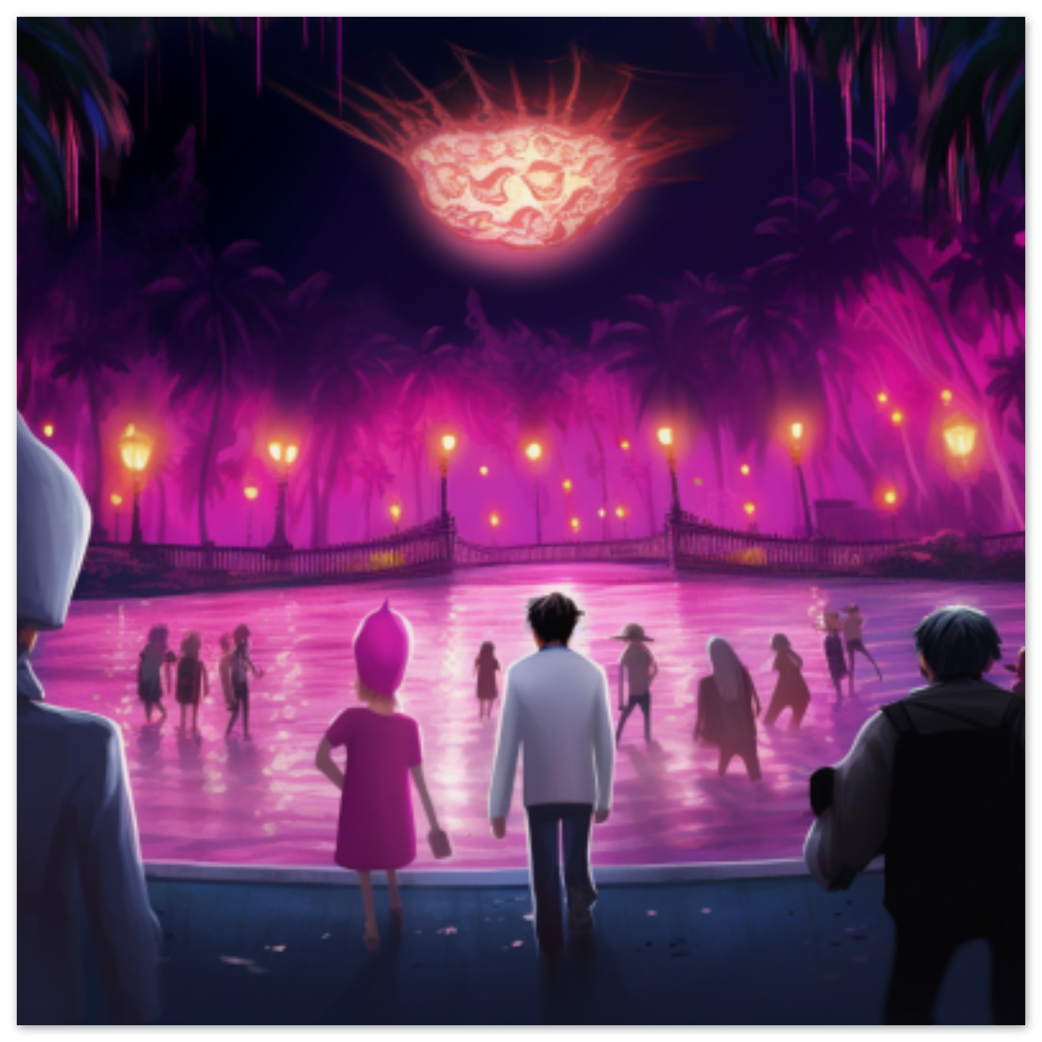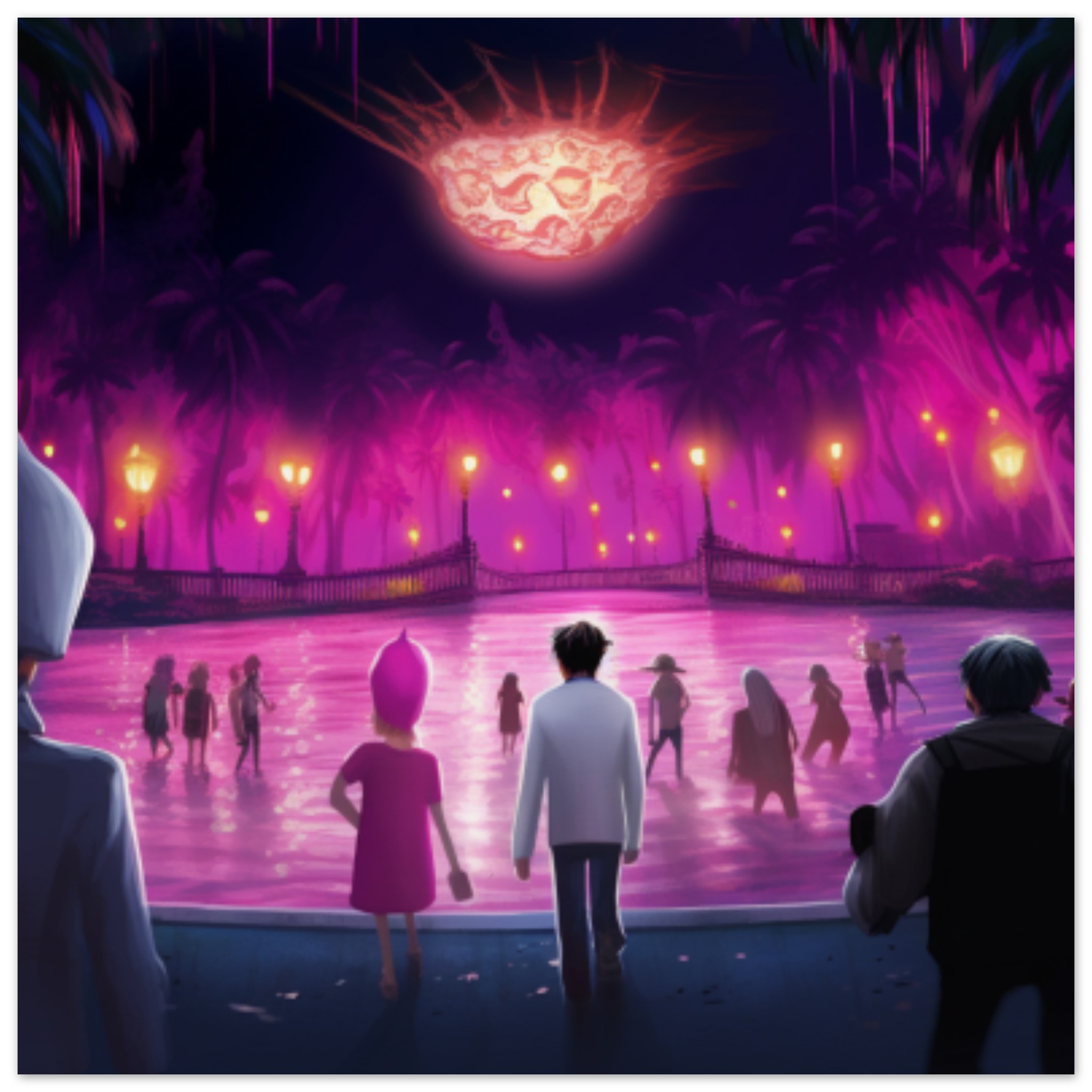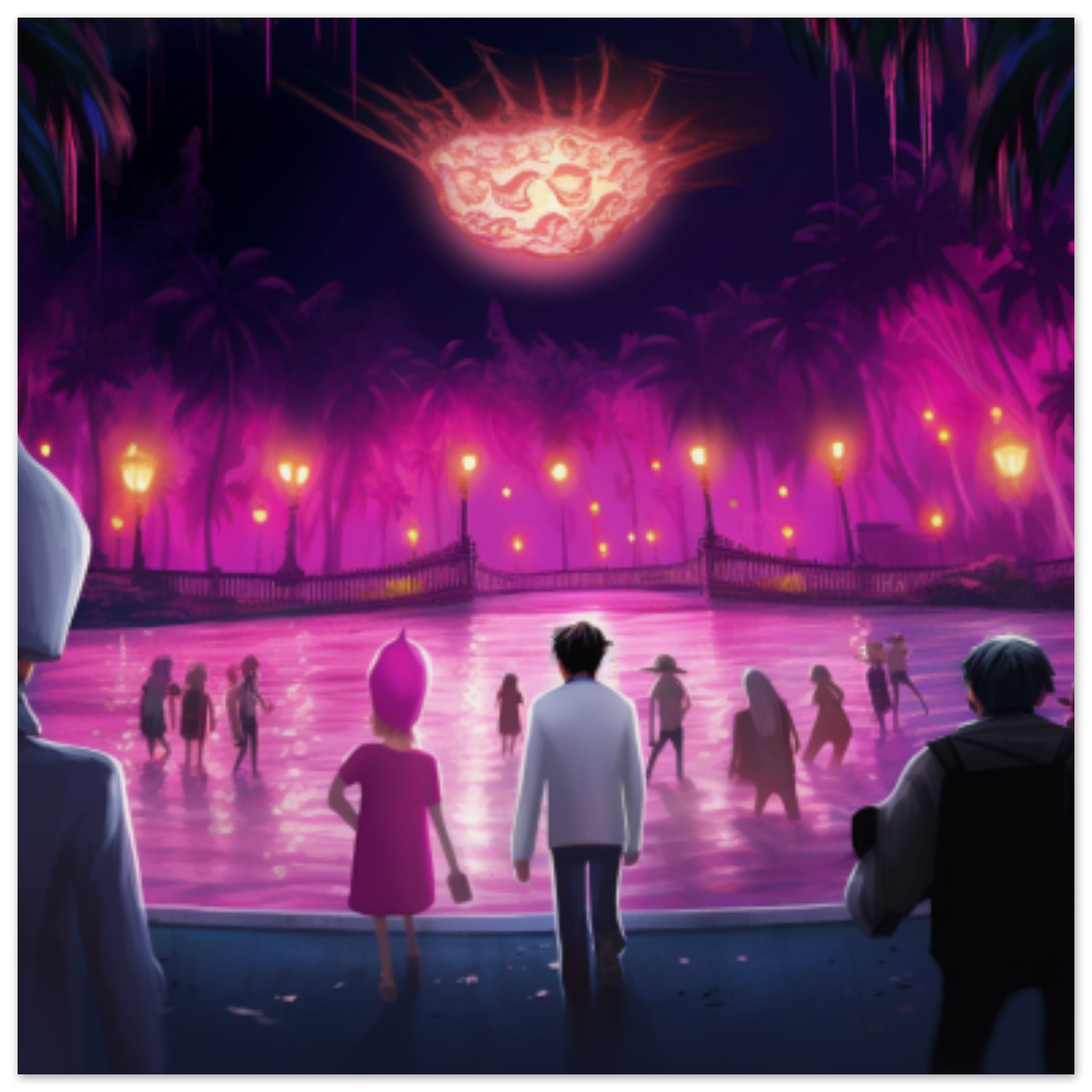 A group of four people, wearing various clothing, are standing in water. The scene is outdoors, with a purple and black color scheme dominating the background. The individuals are spread out in the water, with one person walking towards a purple and pink landscape. The image is not in black and white, and there are no visible faces. The people appear to be enjoying themselves in this unique setting. The overall vibe is serene and peaceful, with a hint of mystery and whimsy. The setting could be a rink or a recreational area with fireworks in the background.