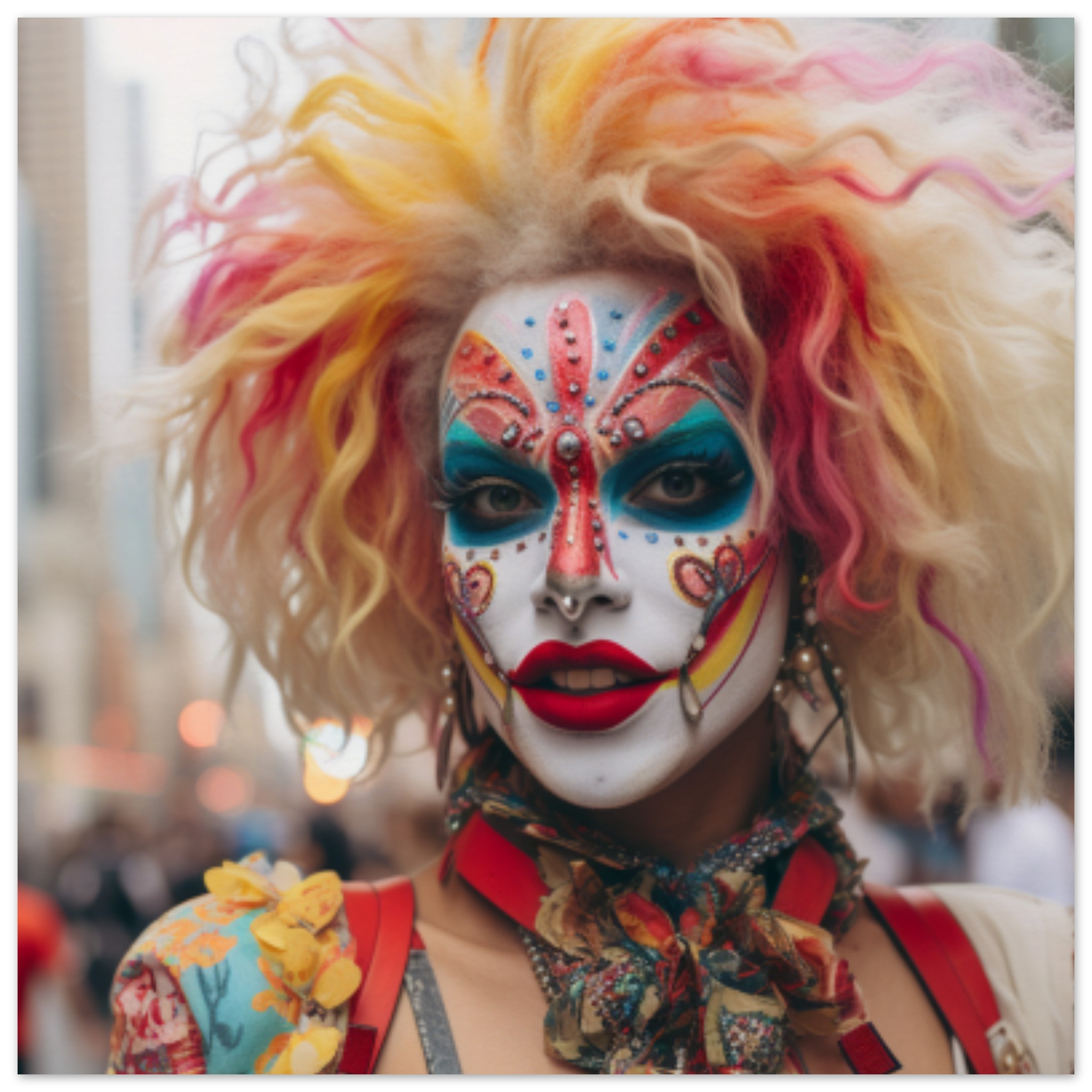 A woman with colorful hair and face paint is standing outdoors, wearing a festive costume resembling a masque or clown. The image is not explicit or gory, with dominant grey tones in the background. The person is the main focus, occupying a significant portion of the frame. The outfit suggests a carnival or Halloween theme, with a street festival atmosphere. The woman’s vibrant hair and face paint add to the whimsical and playful vibe of the scene. The image captures a moment of celebration and creativity, perfect for a costume or clothing dataset.