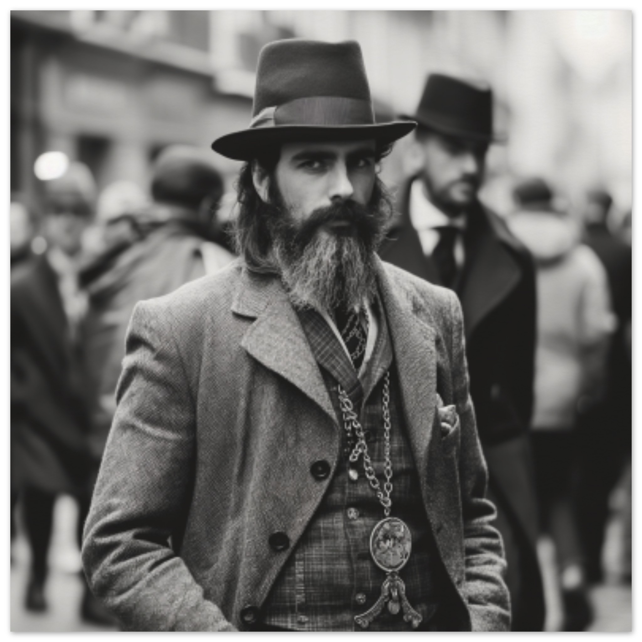 A black and white image of a man with a beard walking on a crowded street. The man is wearing a fedora hat, a jacket, and a suit. His facial features are visible, showing a hint of a smile. The background consists of buildings and people walking around. The image is focused on the man’s headwear, specifically the fedora, which is placed slightly tilted on his head. The overall atmosphere is one of urban street fashion, with the man exuding a sense of style and confidence as he navigates through the bustling city scene.