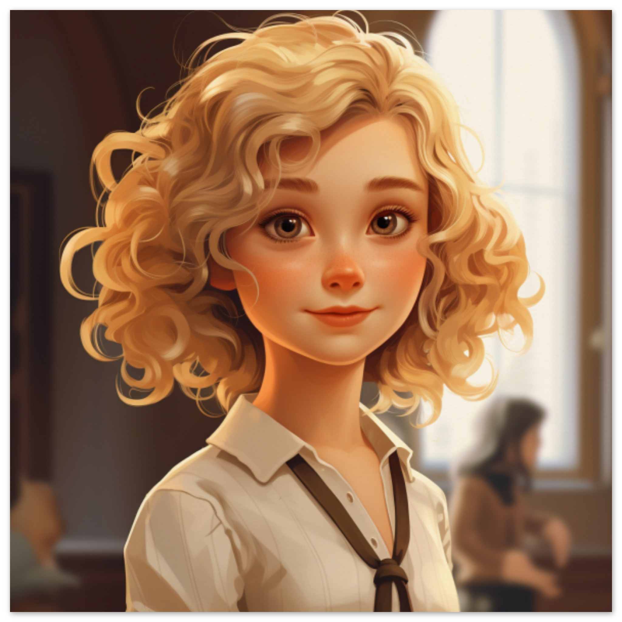 A detailed cartoon illustration of a young girl with curly blonde hair is depicted in this image. The girl is shown with brown eyes and a sweet smile, wearing a white top and brown pants. The background is also brown, creating a warm and cozy atmosphere. The girl’s hair is styled in loose curls, adding to her cute and playful appearance. The image is focused on the girl, with a soft blur effect around her, emphasizing her presence. Overall, this charming cartoon character exudes innocence and charm, making her a delightful subject for any artistic project.