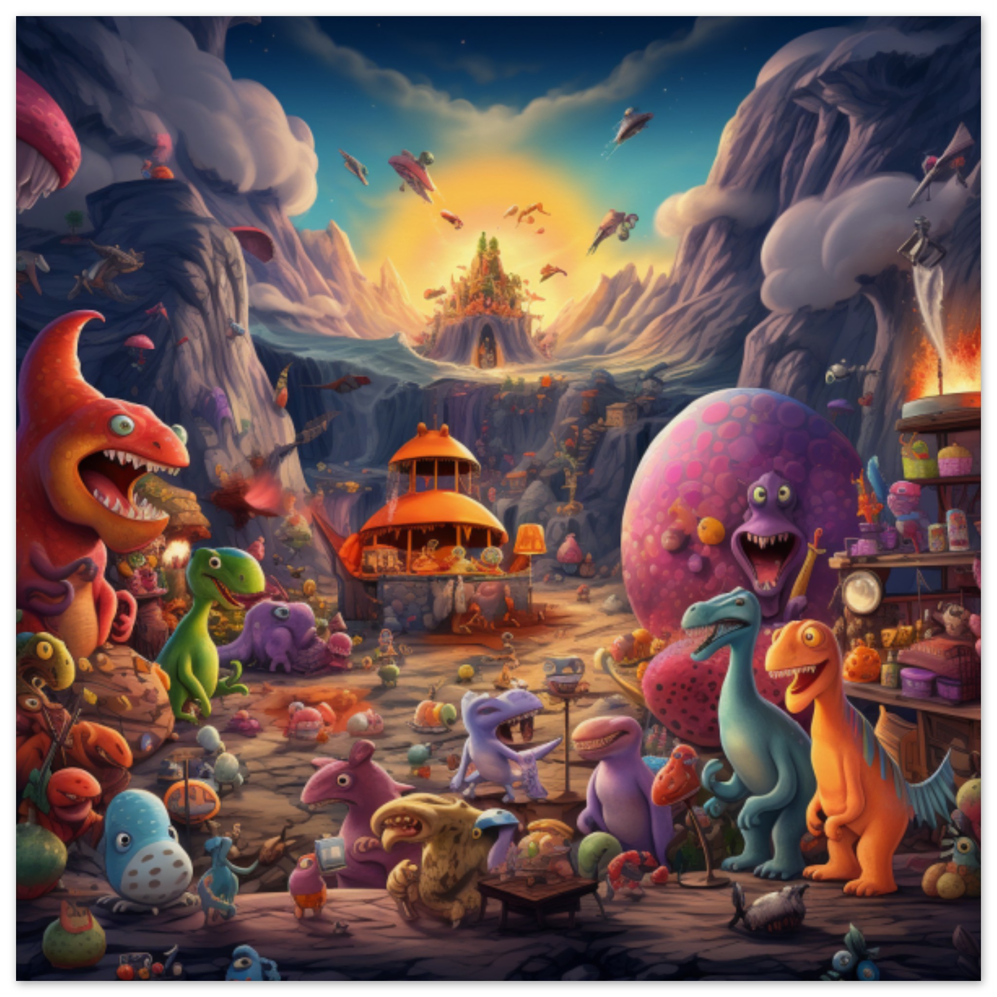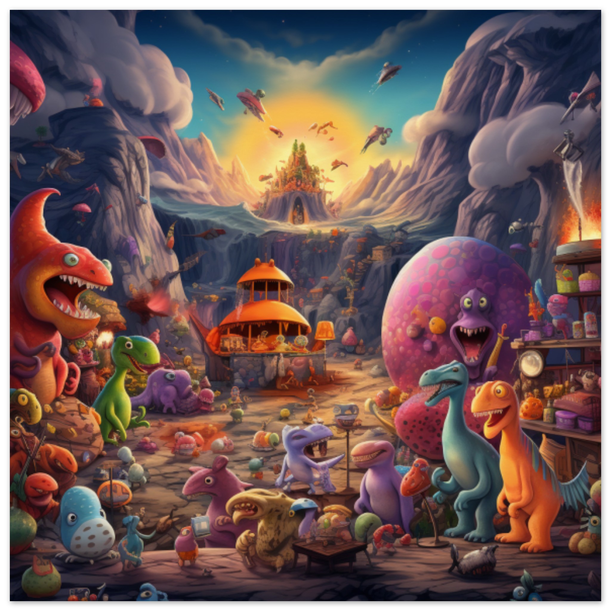 A colorful cartoon illustration featuring dinosaurs in a cave. The image is lively and animated, with vibrant hues of orange and purple. Two toy objects are also depicted in the scene, one near the bottom left corner and the other towards the middle right. The background is a rich brown color, complementing the overall warm palette of the artwork. The dinosaurs are playfully designed, with one having a colorful face. The setting suggests a fun and imaginative world, perfect for children’s entertainment. The style is reminiscent of a painting, adding depth and texture to the composition.