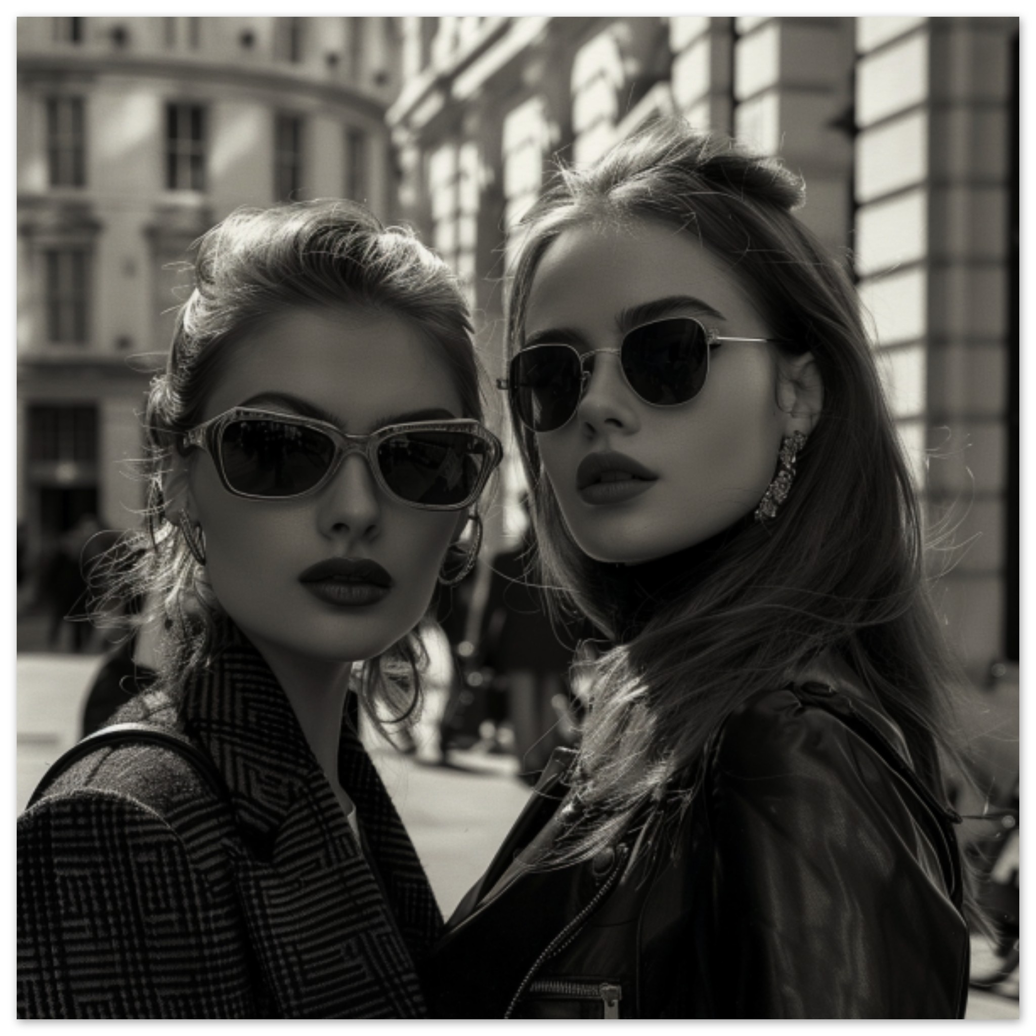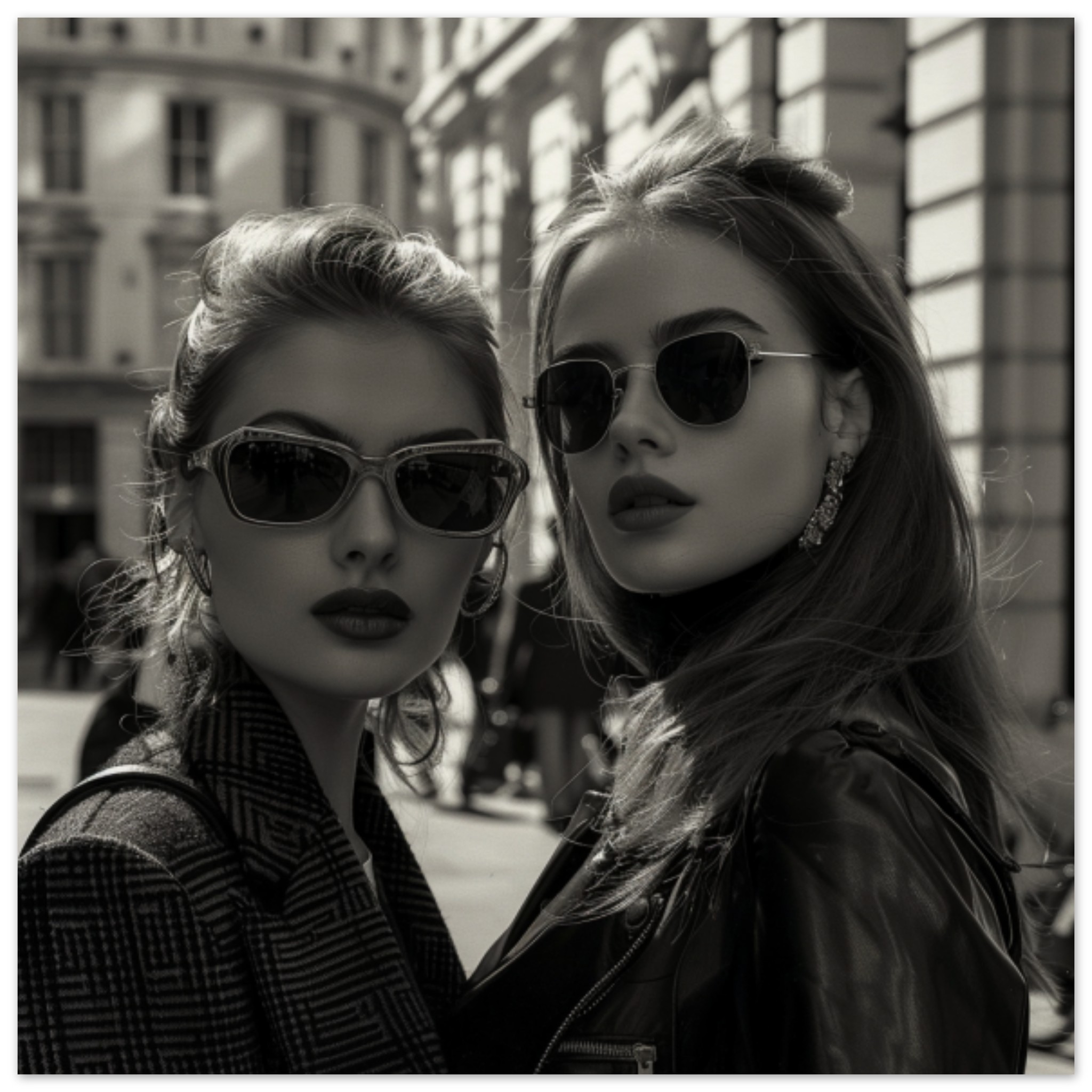 Two stylish women, one wearing a leather jacket and the other a regular jacket, are posing outdoors. Both women are wearing sunglasses, adding a trendy touch to their street fashion look. The image is in black and white, with the dominant colors being black and grey. The women are standing in front of a building, with a street in the background. The women’s faces are the main focus of the image, showing their stylish eyewear. The women are looking directly at the camera, exuding confidence and style in their fashionable accessories.