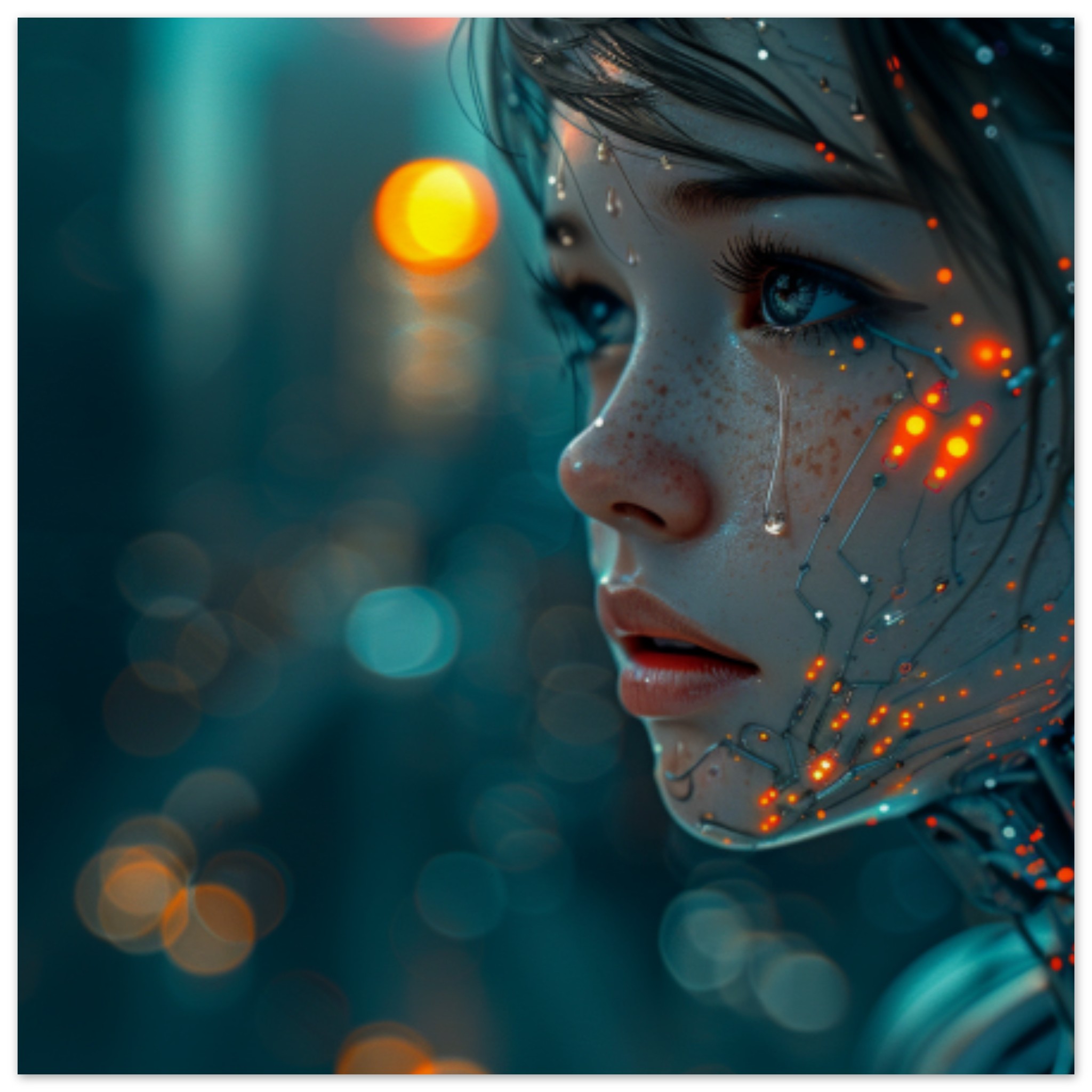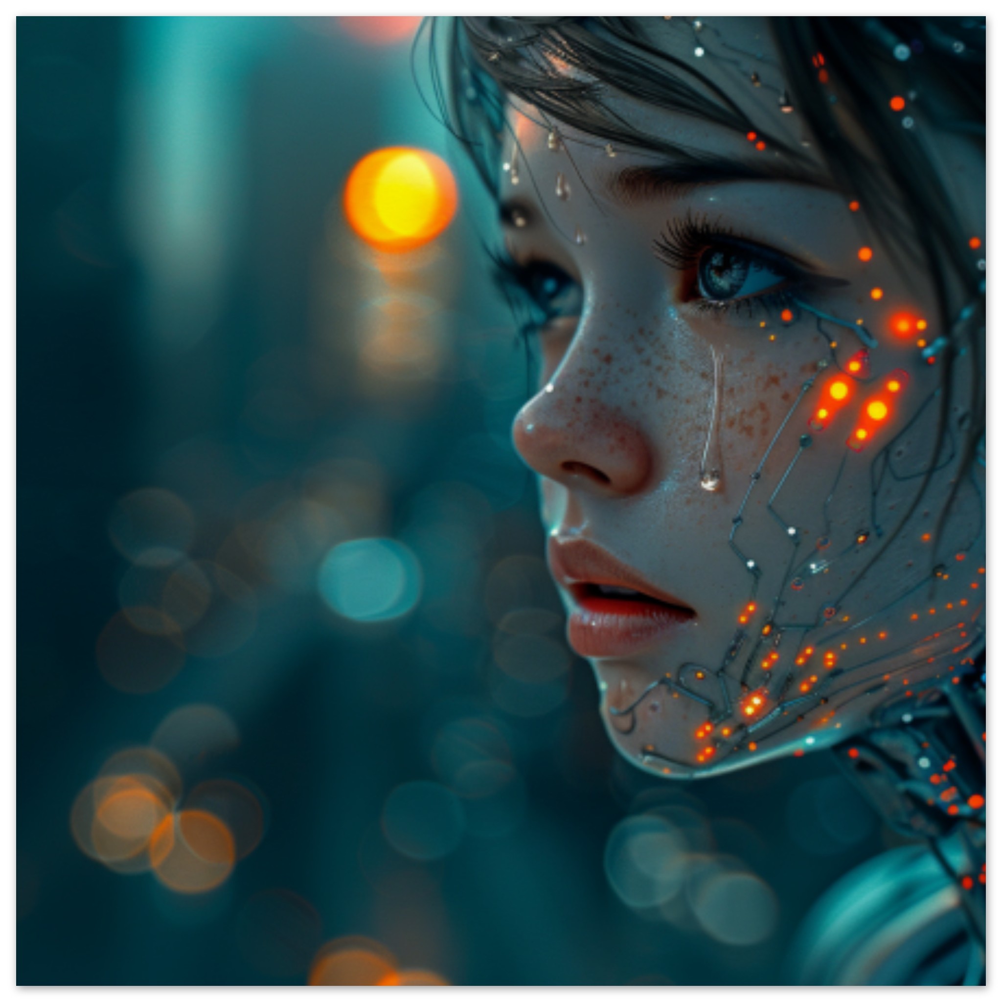 A woman with glowing wires on her face is featured in the image. The woman’s face is the main focus, with the wires creating a futuristic and abstract appearance. The background is black, emphasizing the bright glow of the wires on her face. The woman’s expression is not visible, adding to the mysterious and intriguing nature of the image. The dominant colors are black and a hint of gold. The image is high contrast and visually striking, with the woman’s face and the glowing wires drawing the viewer’s attention.
