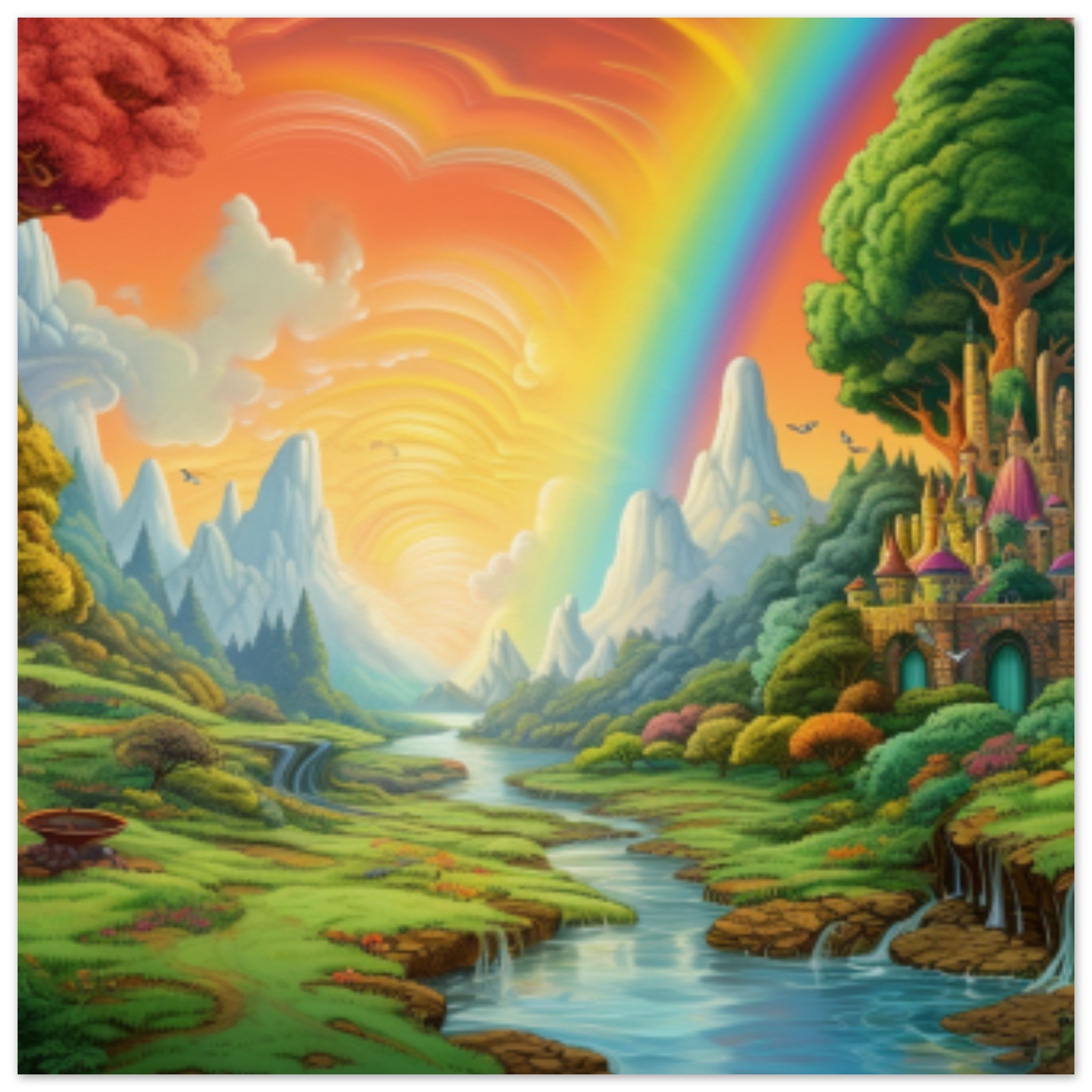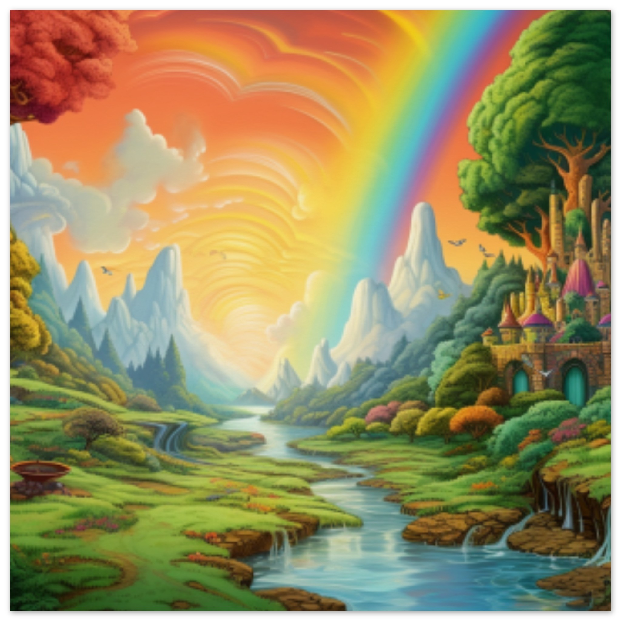 A stunning rainbow arches gracefully over a serene river, creating a mesmerizing scene of natural beauty. The lush greenery along the riverbanks complements the vibrant colors of the rainbow, adding to the overall picturesque landscape. The image, possibly a painting or artwork, captures the essence of nature’s splendor with its peaceful and harmonious setting. The dominant colors of green and brown blend seamlessly, while a touch of golden accent color adds a warm glow to the scene. This captivating portrayal of a rainbow over a river embodies the tranquility and wonder of the great outdoors.