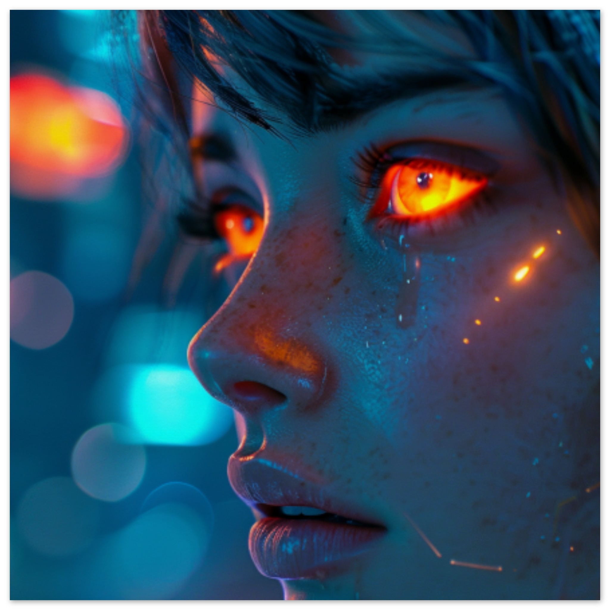 A detailed close-up image of a woman’s face with red eyes. The woman’s eyes are strikingly red, adding a dramatic and intense element to the portrait. Her features include long eyelashes, well-defined eyebrows, and full lips. The overall color scheme is dominated by black, with a vibrant accent color of C14D0A. The image is focused on the woman’s face, showcasing her unique and captivating appearance. The composition highlights the intensity and emotion conveyed through her red eyes, creating a powerful and mesmerizing visual impact.