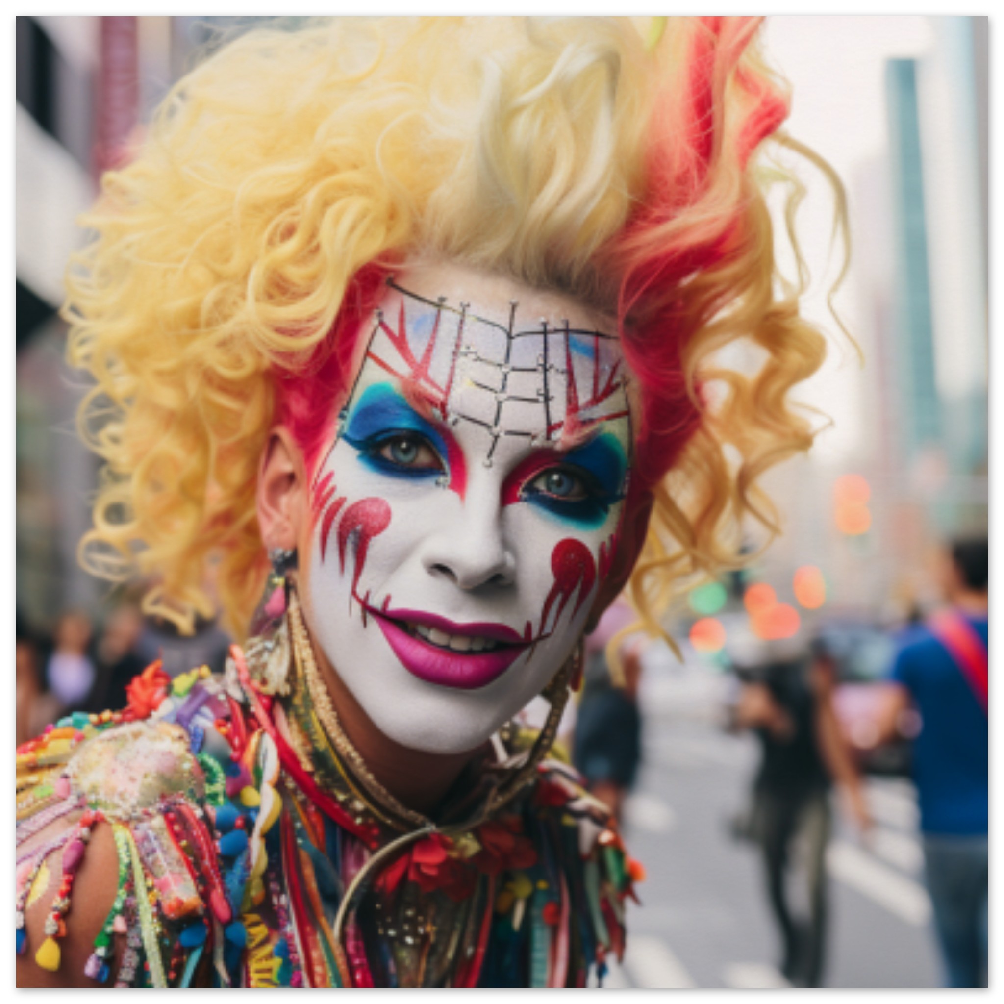 A woman with colorful hair and face paint is standing outdoors wearing a vibrant costume resembling a clown or masque for Halloween. She has grey clothing and her face is intricately painted with bright colors. The dominant colors in the image are grey and the accent color is a deep blue. In the background, there is a car parked. The image also contains multiple people, with one person in focus in the foreground. The image is slightly blurry, capturing the movement of people on the street.