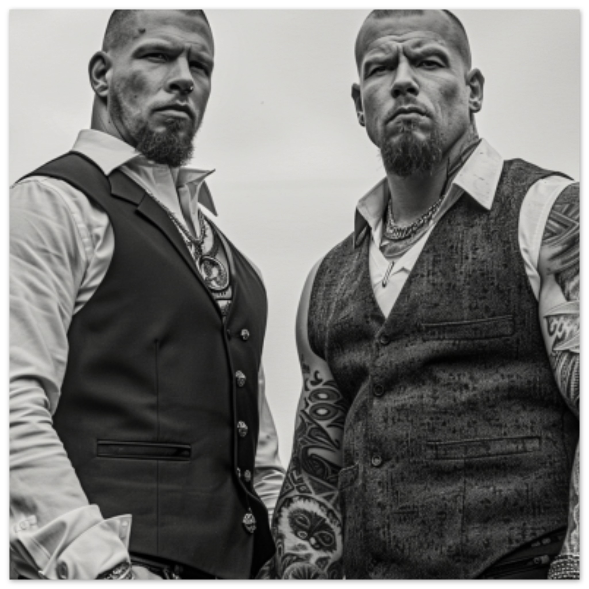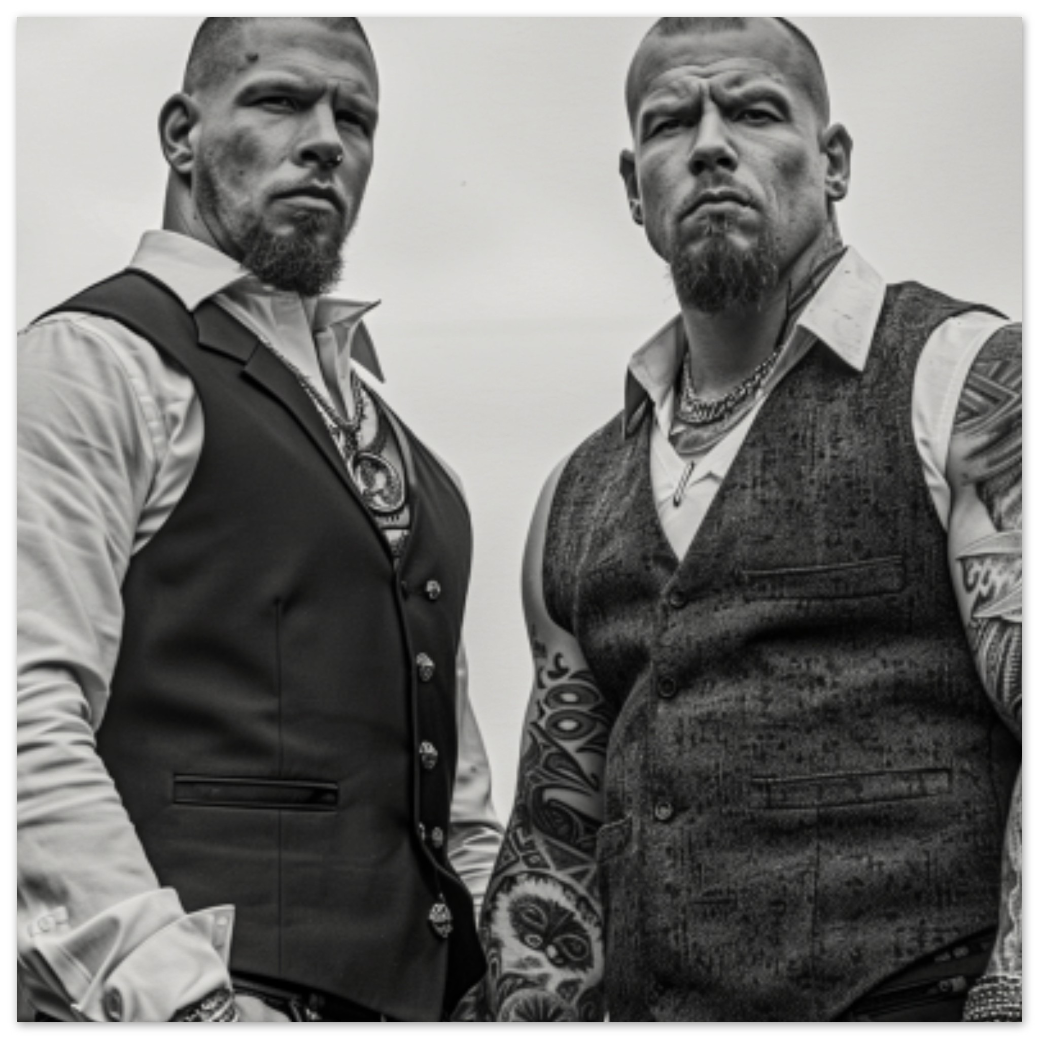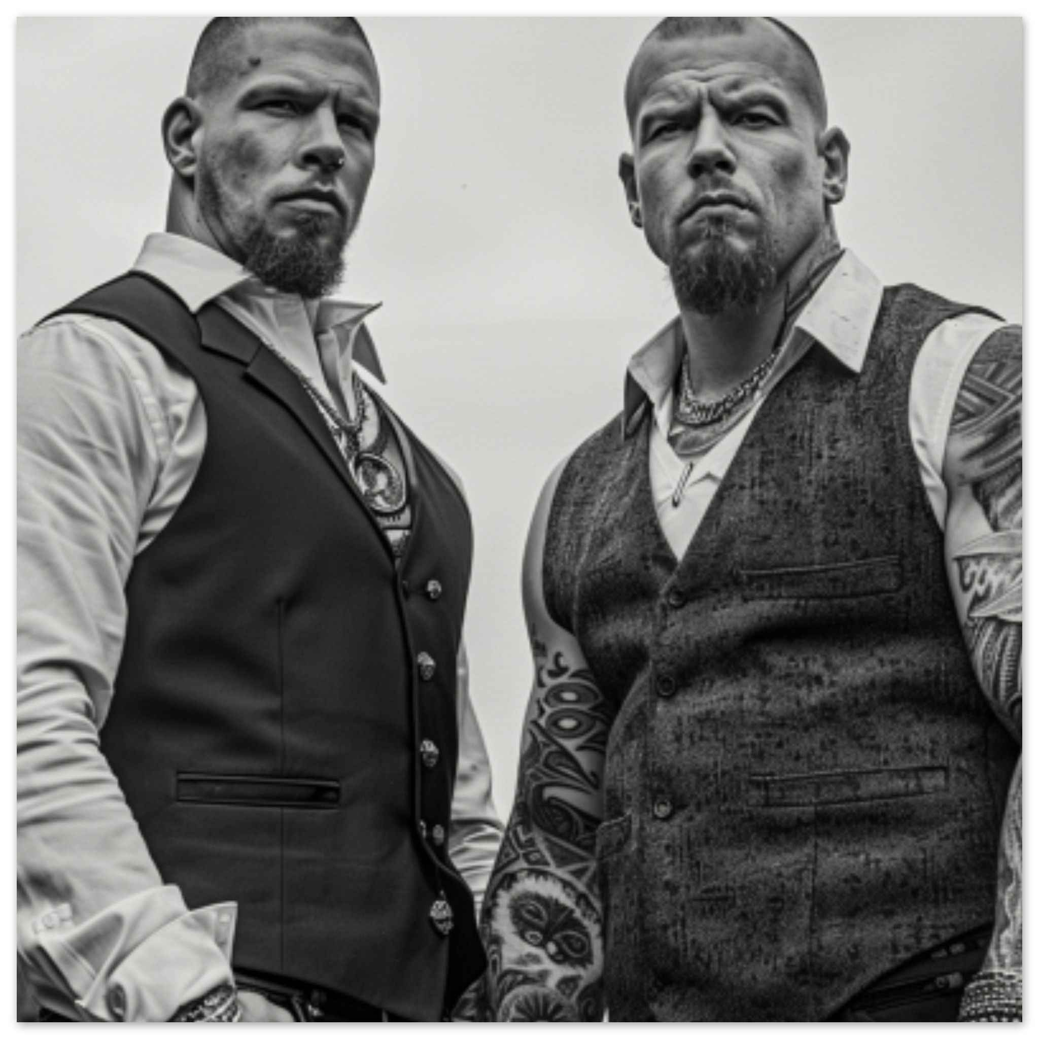 Two men are posing for a picture outdoors. The image is in black and white, with a dominant color scheme of white, grey, and black. One man is wearing a vest and the other is wearing a jacket. Both men are standing on a street with a building in the background. The men have tattoos on their arms. The photo is focused on the two men, with a sculpture object in the background. The men’s faces are visible, with one man’s face in the top left corner and the other man’s face in the middle.