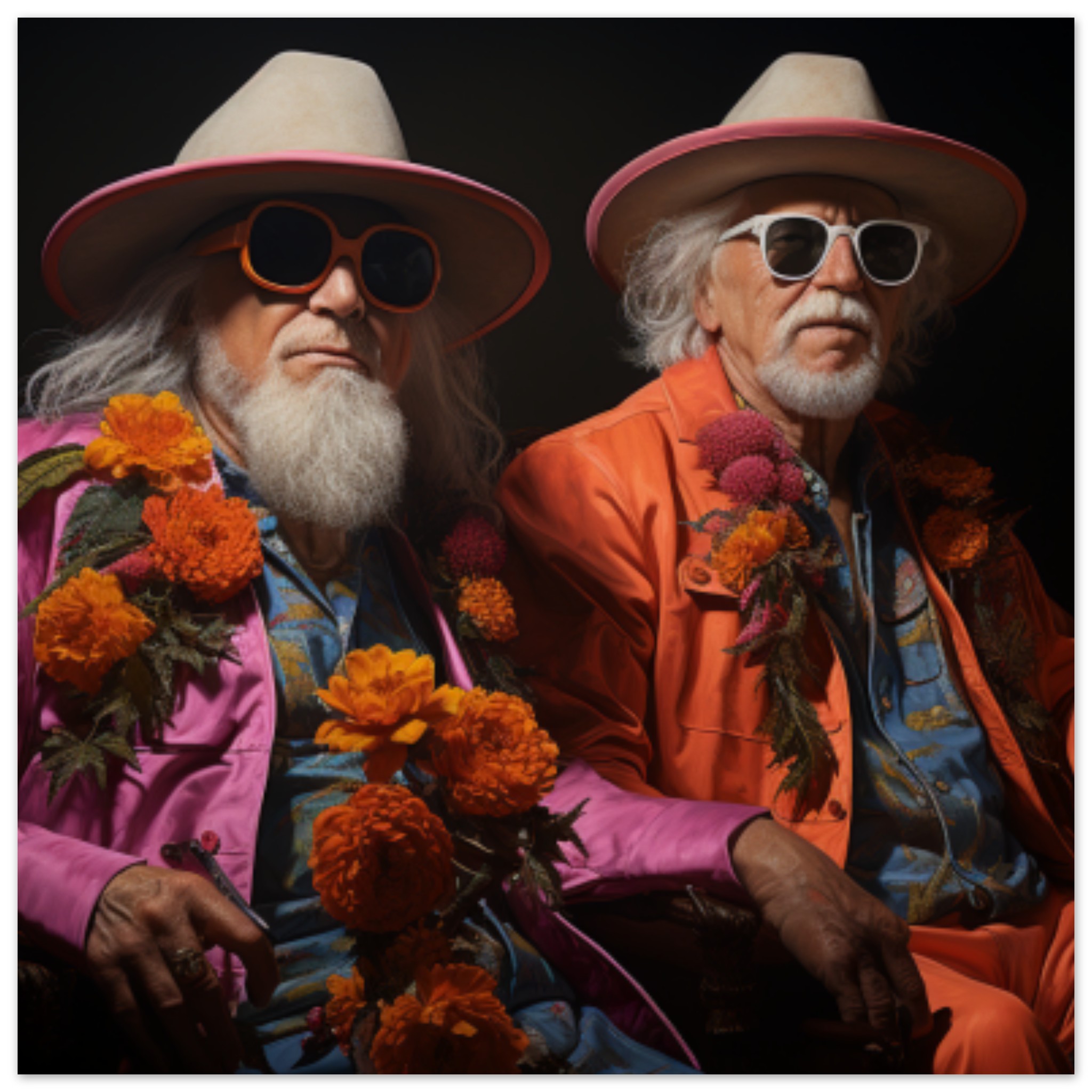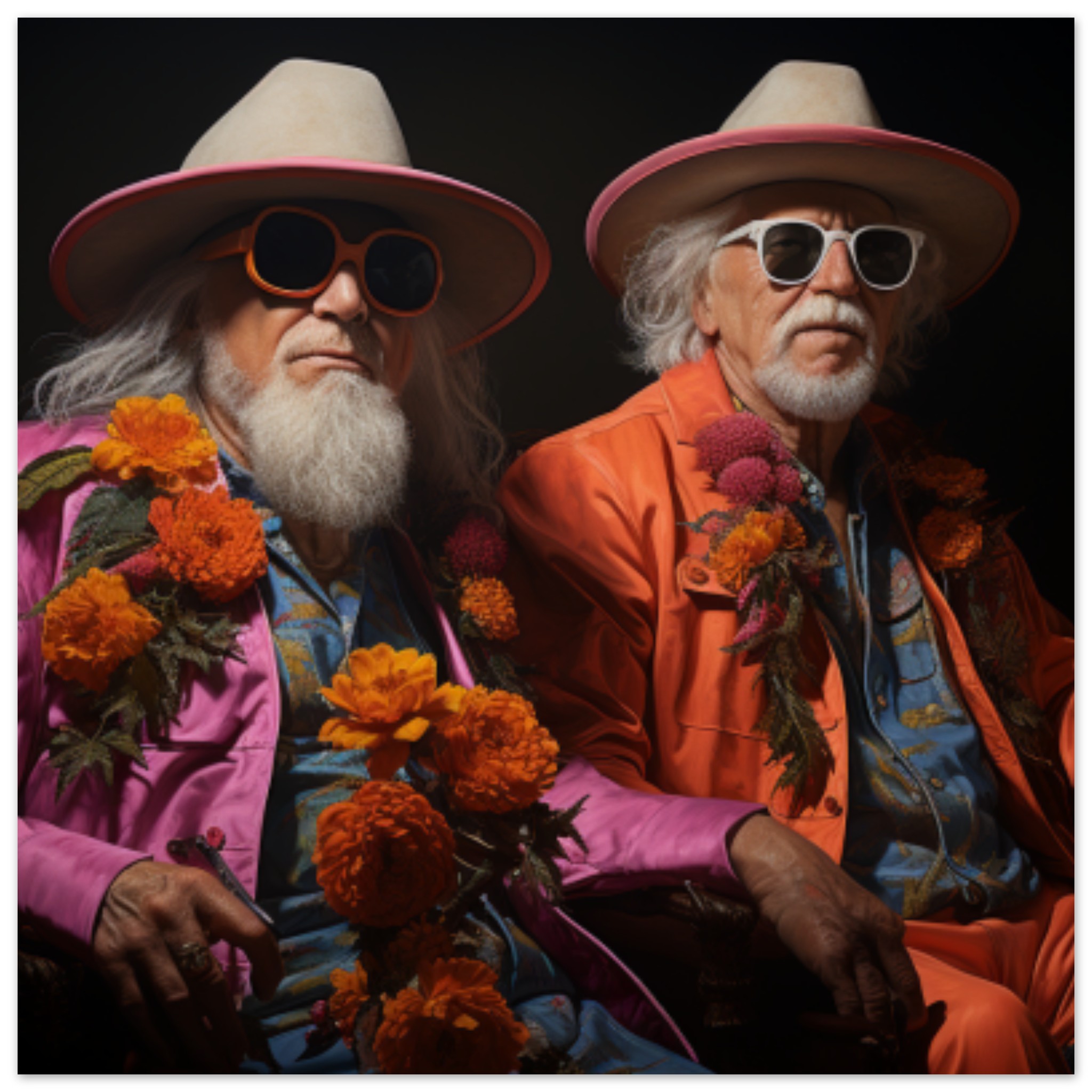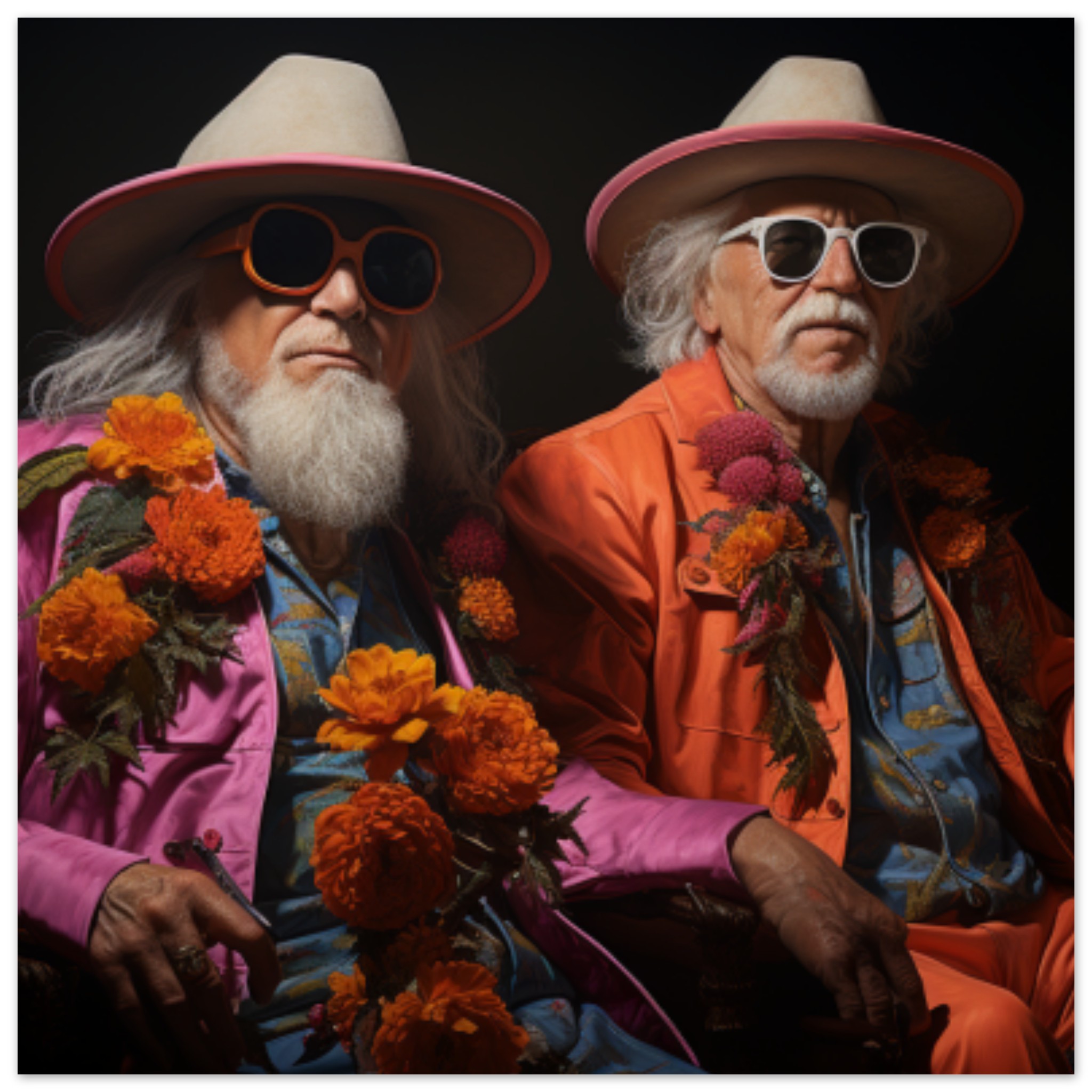 Two men are depicted in the image, both wearing stylish hats and sunglasses. The men appear to be indoors, with a dominant color scheme of black and brown. One man is wearing a sun hat while the other is sporting a fedora. They are both well-dressed, with one man in an orange suit holding a gun. The image features various fashion accessories like ties and glasses. The men are the central focus, with no visible faces or celebrities present. The overall tone of the image is fashionable and mysterious, with a hint of danger.