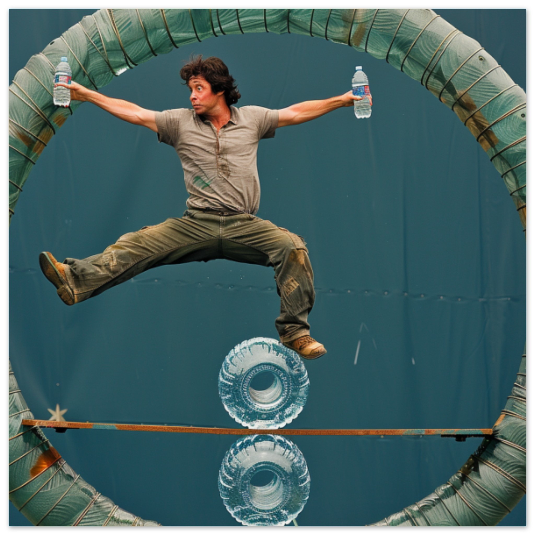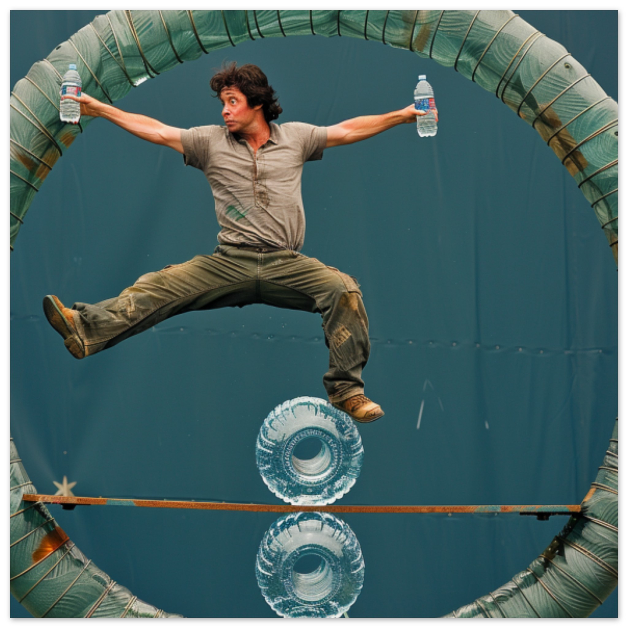 A man wearing casual clothing is energetically jumping in a circular motion outdoors, surrounded by water bottles. The predominant colors in the image are shades of grey, with an accent color of a warm brown. The man appears to be the main focus, with a bounding box indicating his position in the center of the image. He is engaged in a playful activity, with his arms outstretched as if in motion. The scene conveys a sense of movement and fun, captured in a moment of dynamic action.