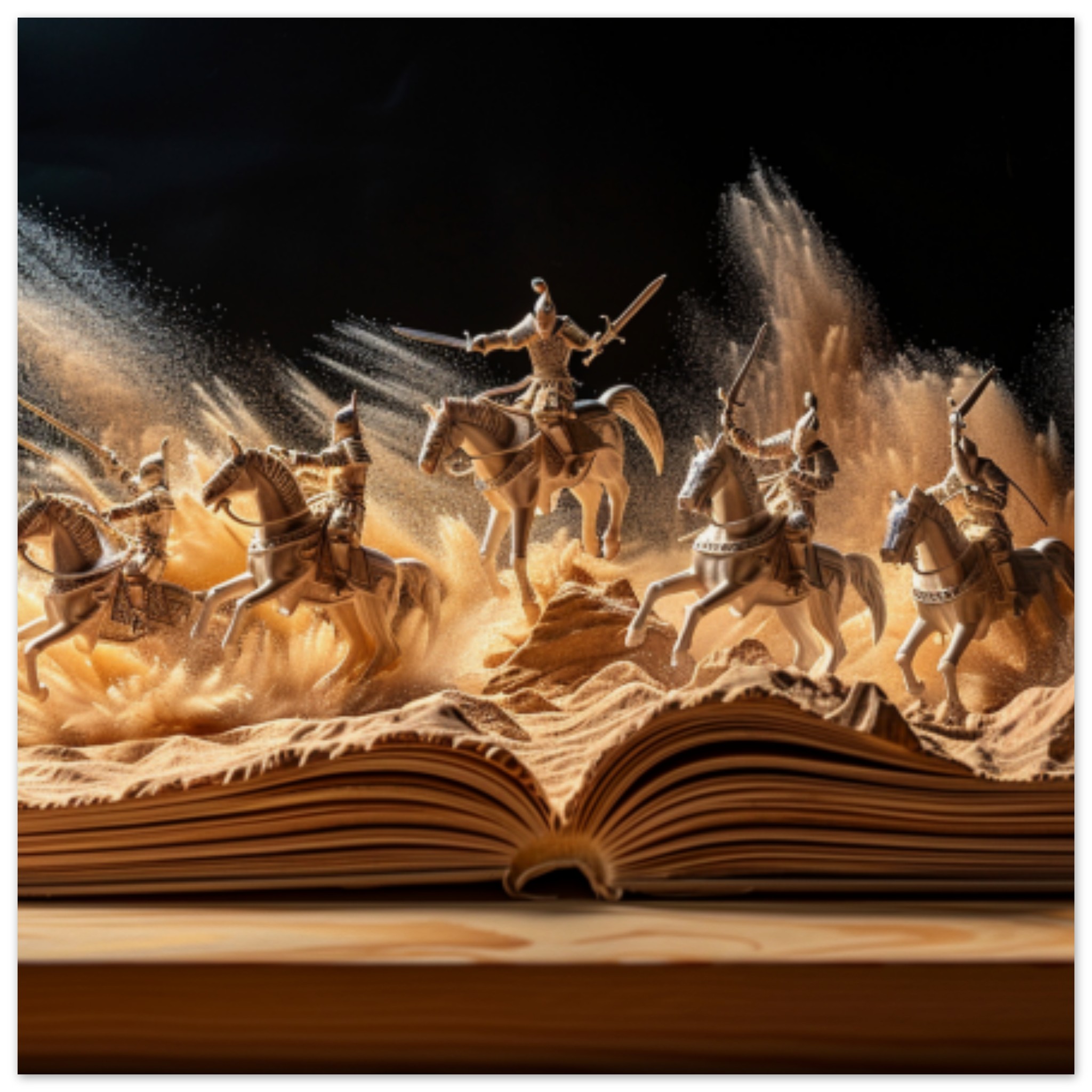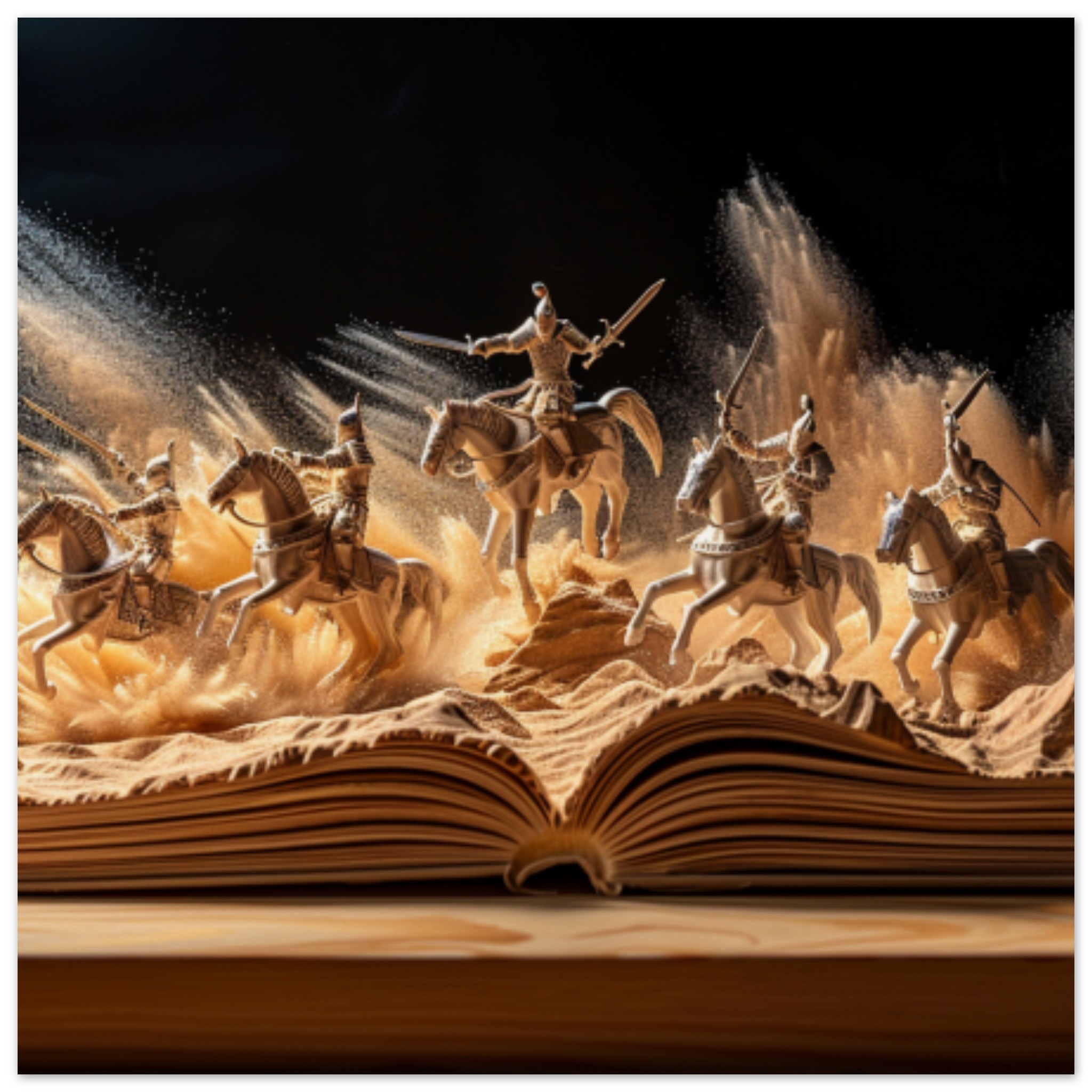 A brown book with an open cover is displayed, showcasing a group of figurines riding on toy horses. The figurines depict men in historical attire, holding swords as they ride the detailed horse figurines. The background is black, emphasizing the intricate details of the brown book and the figurines. The dominant colors in the image are brown and black, with an accent color of AA6D21. The scene evokes a sense of art and history, with a focus on horseback riding and medieval themes. The image is rich in detail and invites viewers to explore the world of these miniature horse riders.