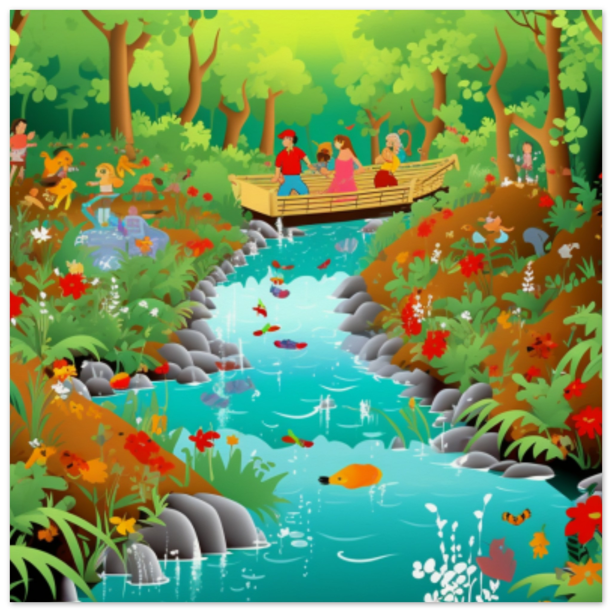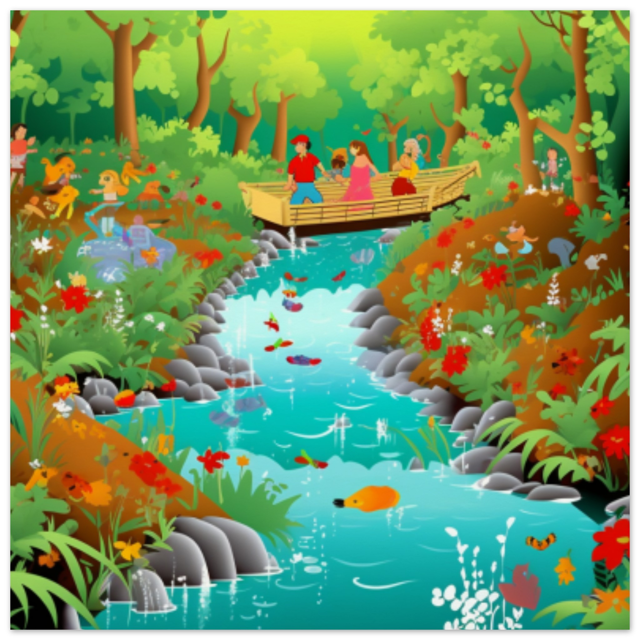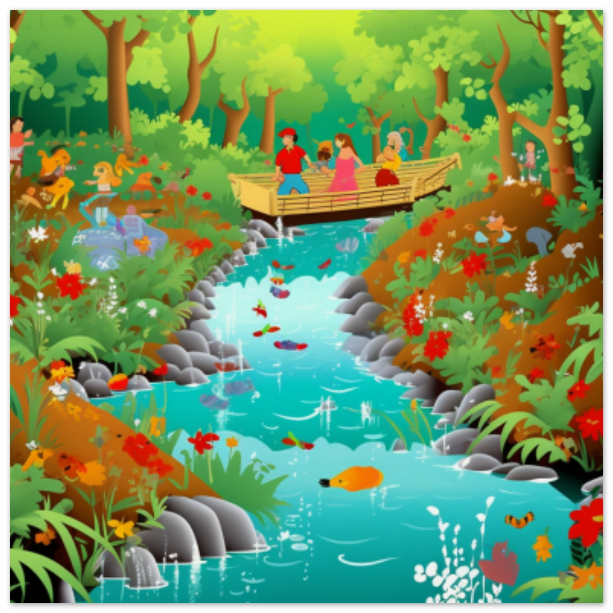 A vibrant cartoon scene depicting a lush green river with a charming bridge crossing over it. The river is teeming with life, including colorful fish swimming gracefully. People can be seen leisurely strolling across the bridge, admiring the beauty of their surroundings. The background is filled with various shades of green, enhancing the serene and peaceful atmosphere of the scene. The illustration is intricate, showcasing intricate details of flowers and plants along the riverbanks. This whimsical artwork captures the essence of nature and tranquility, inviting viewers to get lost in its beauty.