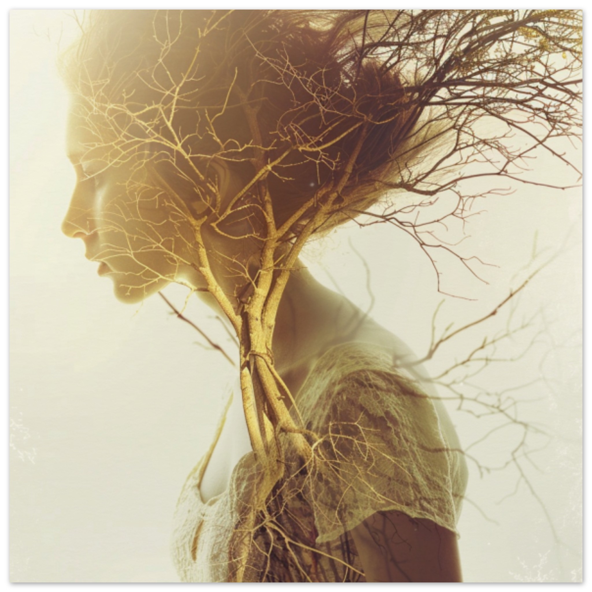 A woman stands in a foggy outdoor setting, surrounded by tree branches. She appears serene and contemplative, with a hint of mystery in her expression. The dominant colors in the image are brown and white, creating a natural and earthy atmosphere. The woman’s presence adds a touch of warmth to the cool, misty landscape. There are no identifiable objects or faces in the scene, allowing the focus to solely be on the woman and the ethereal environment she is in. This captivating image evokes a sense of tranquility and connection with nature.