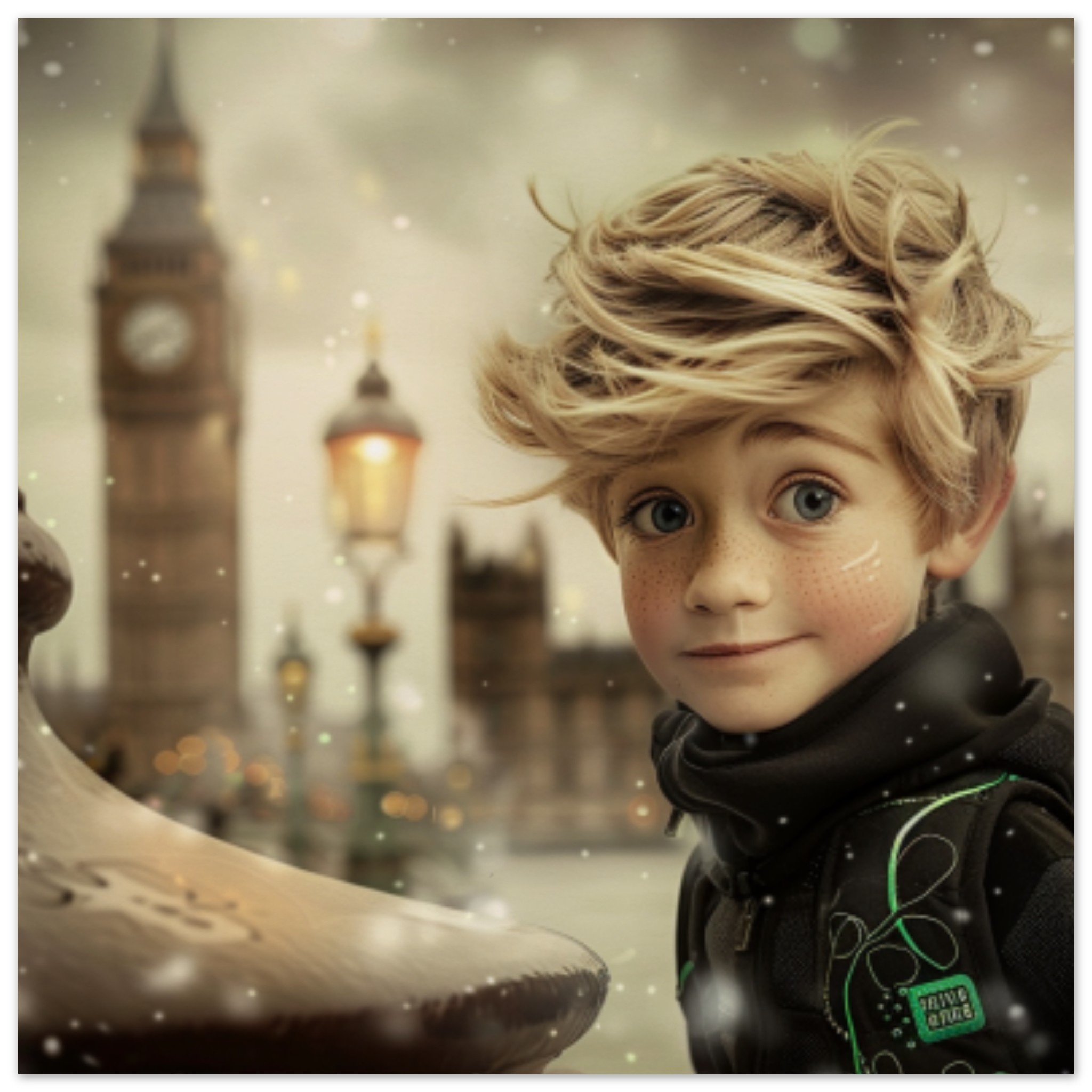 A young boy with freckles and blue eyes is standing in front of a majestic clock tower on a snowy winter day. He is wearing a black jacket with a patch and carrying a black backpack with a green cord. The clock tower looms in the background, with a clock mounted on a pole. The scene is set against a backdrop of brown and black colors, with a lamp post visible in the foreground. The boy’s face, framed by his nice hair, shows a sense of wonder and curiosity as he gazes up at the towering structure.