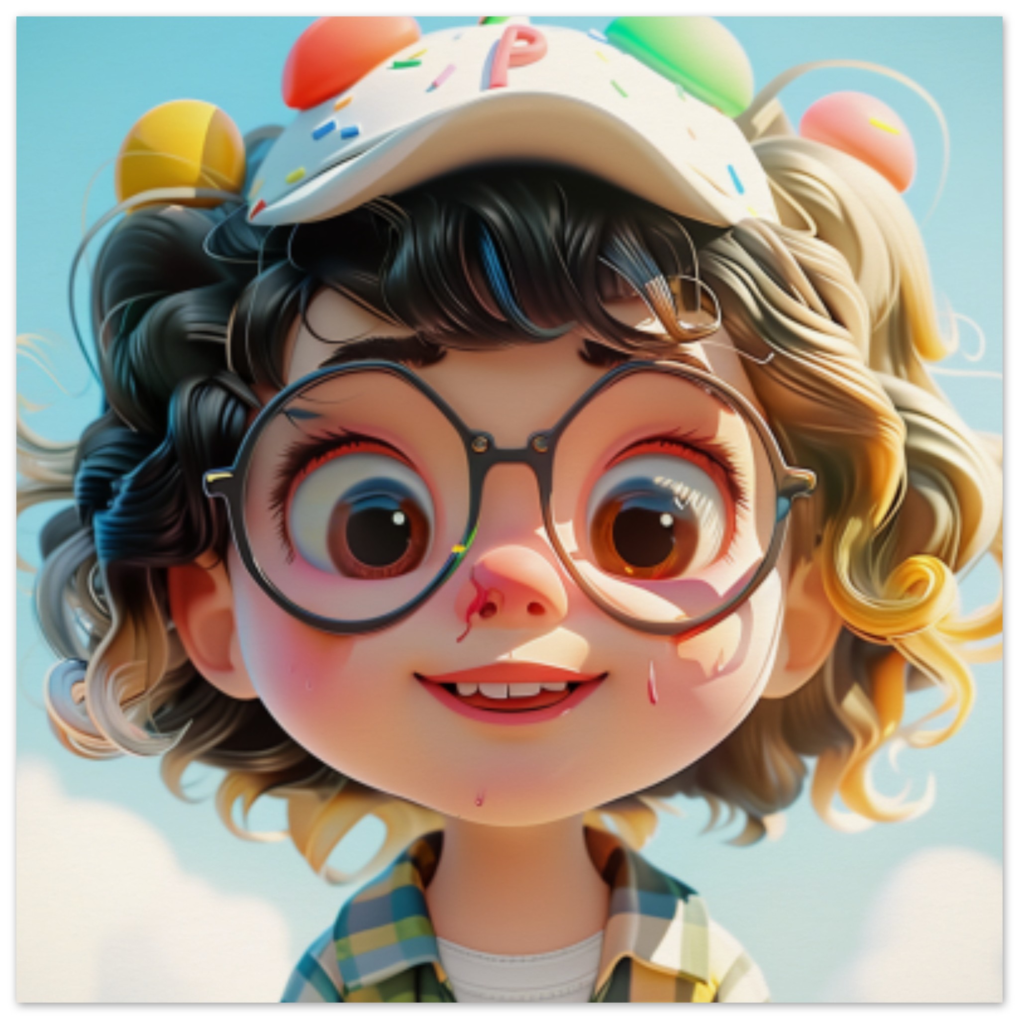 A cartoon girl with brown hair is depicted wearing glasses and a hat in this colorful image. The background is mostly white, with the girl’s outfit standing out in shades of brown and white. The girl’s face is visible, showing a happy expression. The image is outdoors, with a clear sky in the background. The girl is the main focus of the image, taking up most of the frame. The cartoon style is evident, with exaggerated features and a playful vibe. This whimsical scene evokes a sense of fun and creativity.