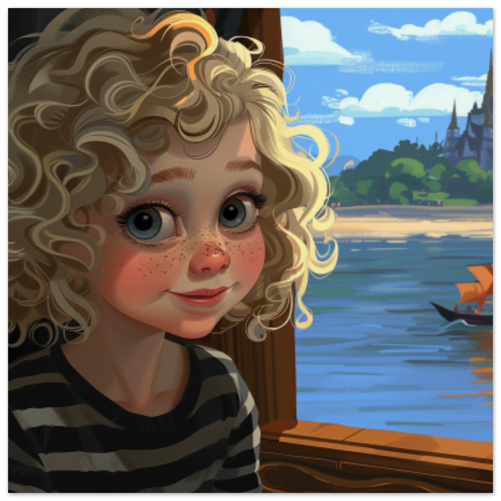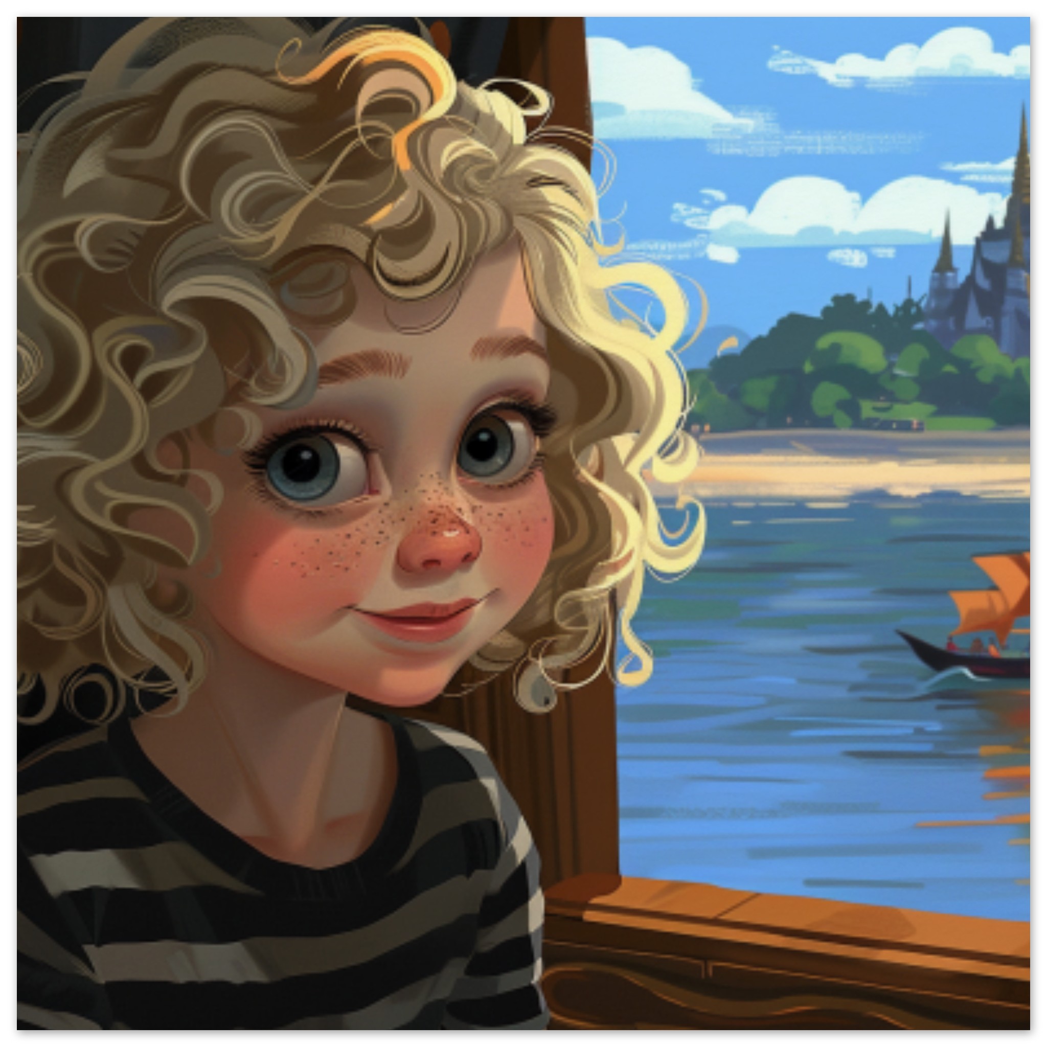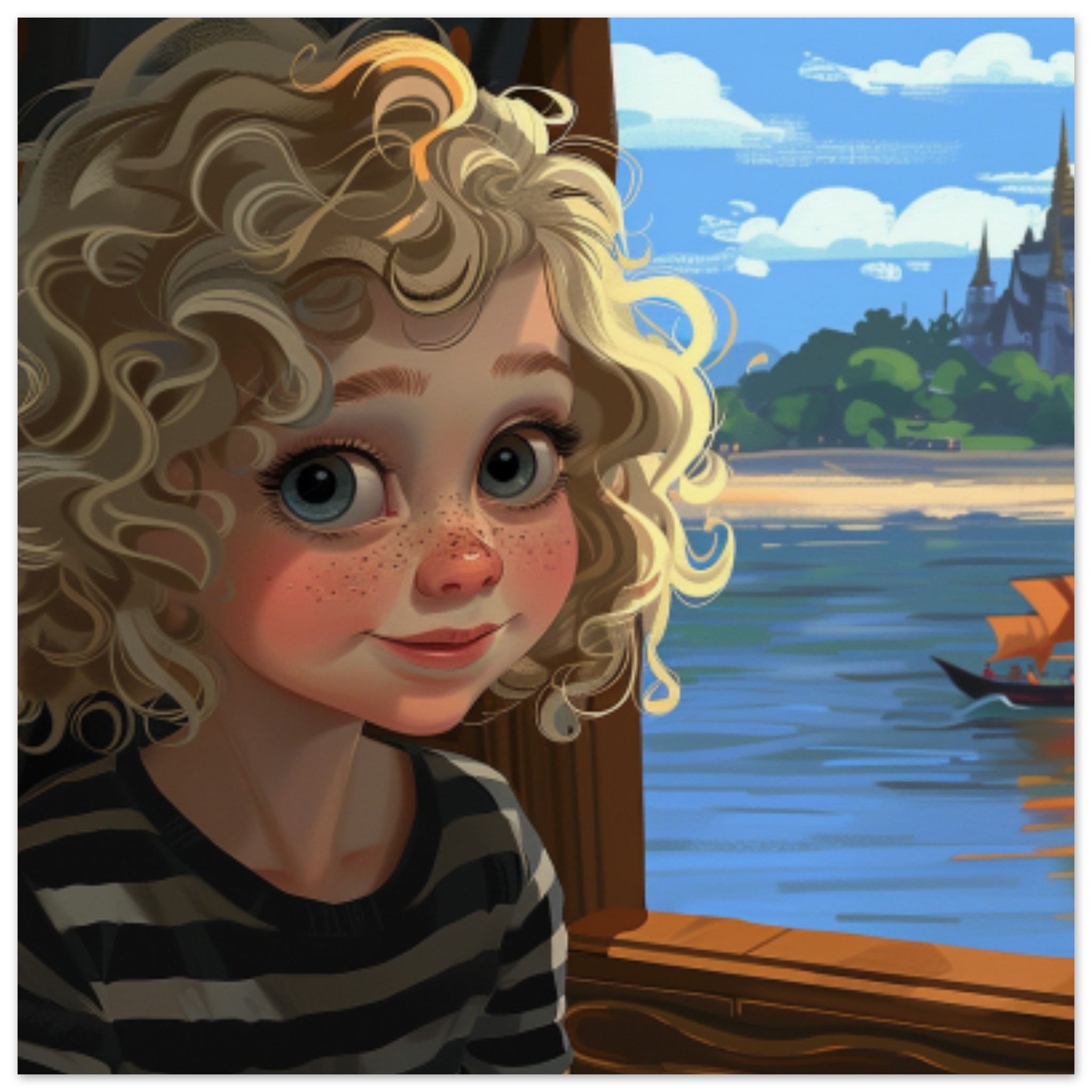 A detailed cartoon illustration depicting a young girl with curly blonde hair standing in front of a window. The scene includes a large sailboat with orange sails in the background, set against a serene lake and sky. The dominant colors are brown and black, with a vibrant accent color of blue. The girl’s joyful expression conveys a sense of happiness and relaxation, suggesting a vacation setting. The image is colorful and lively, with a focus on outdoor elements like water and boats. The overall composition is cheerful and inviting, perfect for a summer-themed artwork collection.