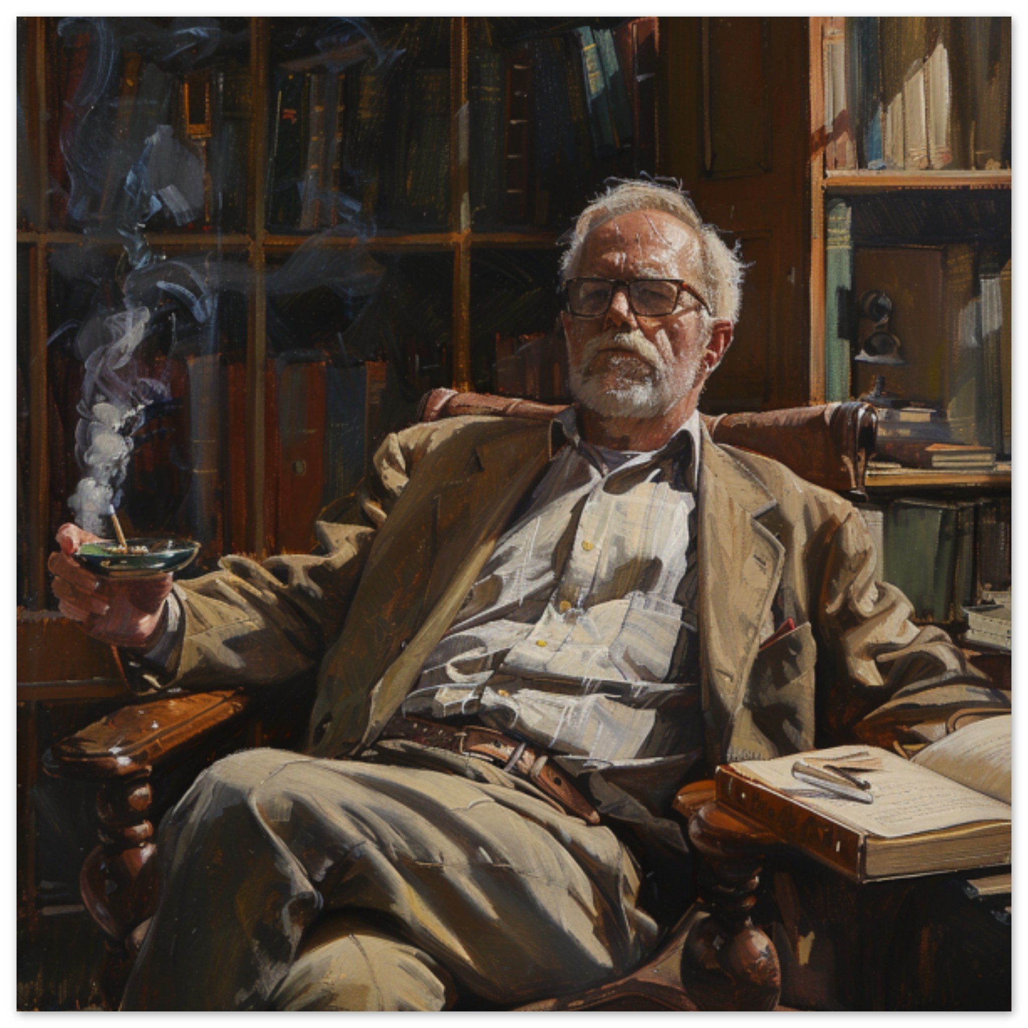A man is depicted sitting in a chair while holding a cigarette. The man is wearing glasses and appears to be engrossed in a book placed on a nearby table. The dominant colors in the image are brown and black, with the accent color being a shade of brown. The image is not in black and white and features a person as the main subject. The man’s face is not visible, and he is situated indoors. The image also includes furniture, specifically a chair, and there are no celebrities or landmarks present.