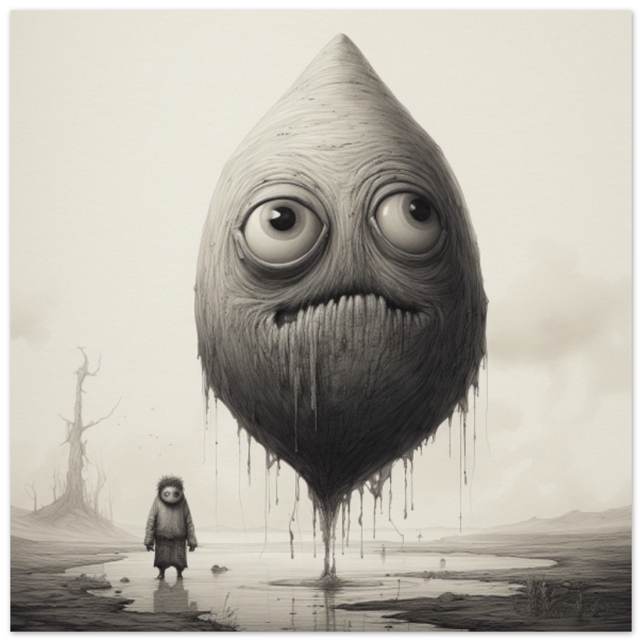 A black and white cartoon depicting a monster with a disproportionately large head. The monster has googly eyes and a mischievous expression. The image is set outdoors, with a clear sky in the background. The drawing is primarily white and grey, with an accent color of 7B7150. The creature is the dominant object in the image, taking up a significant portion of the frame. The style of the drawing is artistic, resembling a sketch or a piece of art. The creature appears playful and whimsical, adding a sense of fun to the scene.