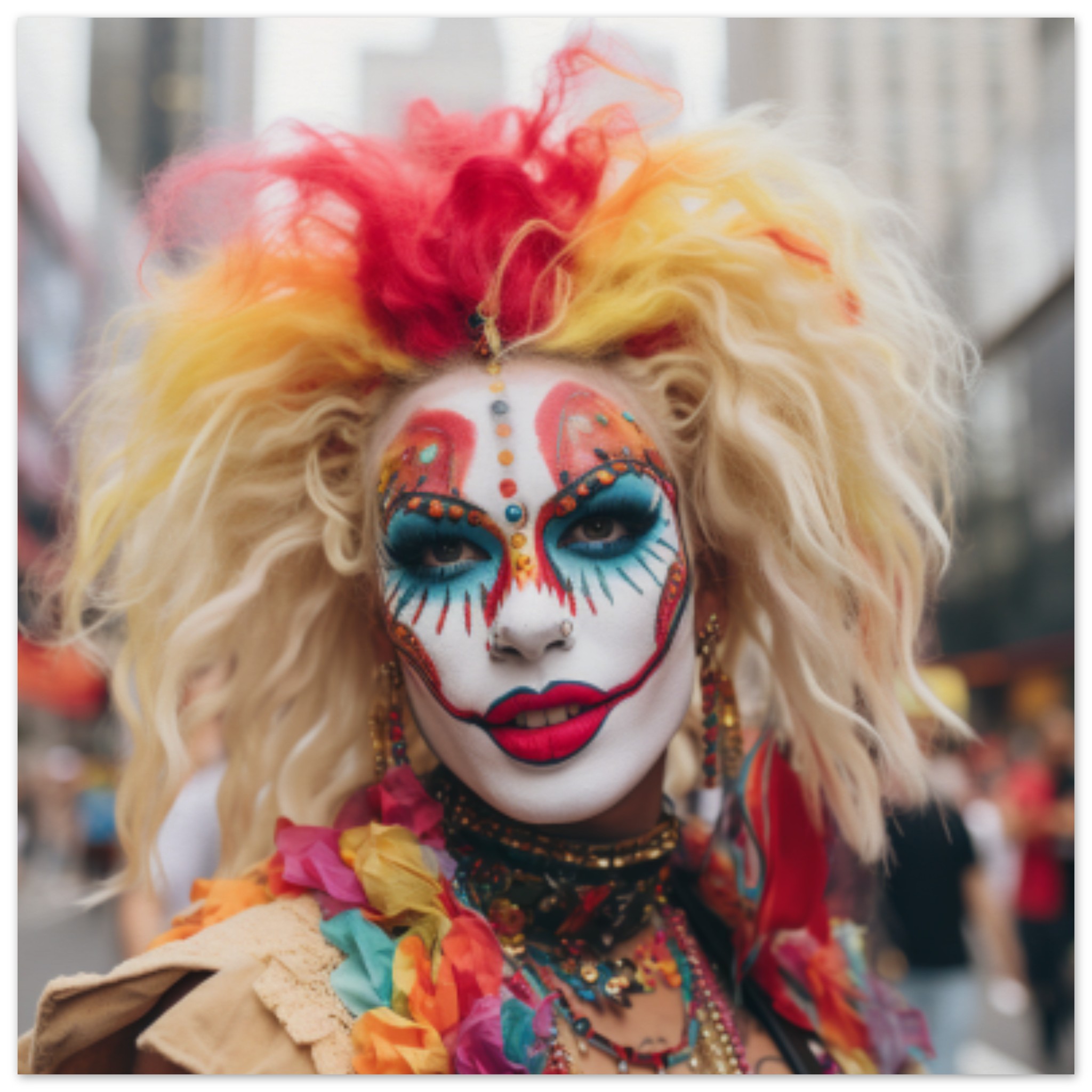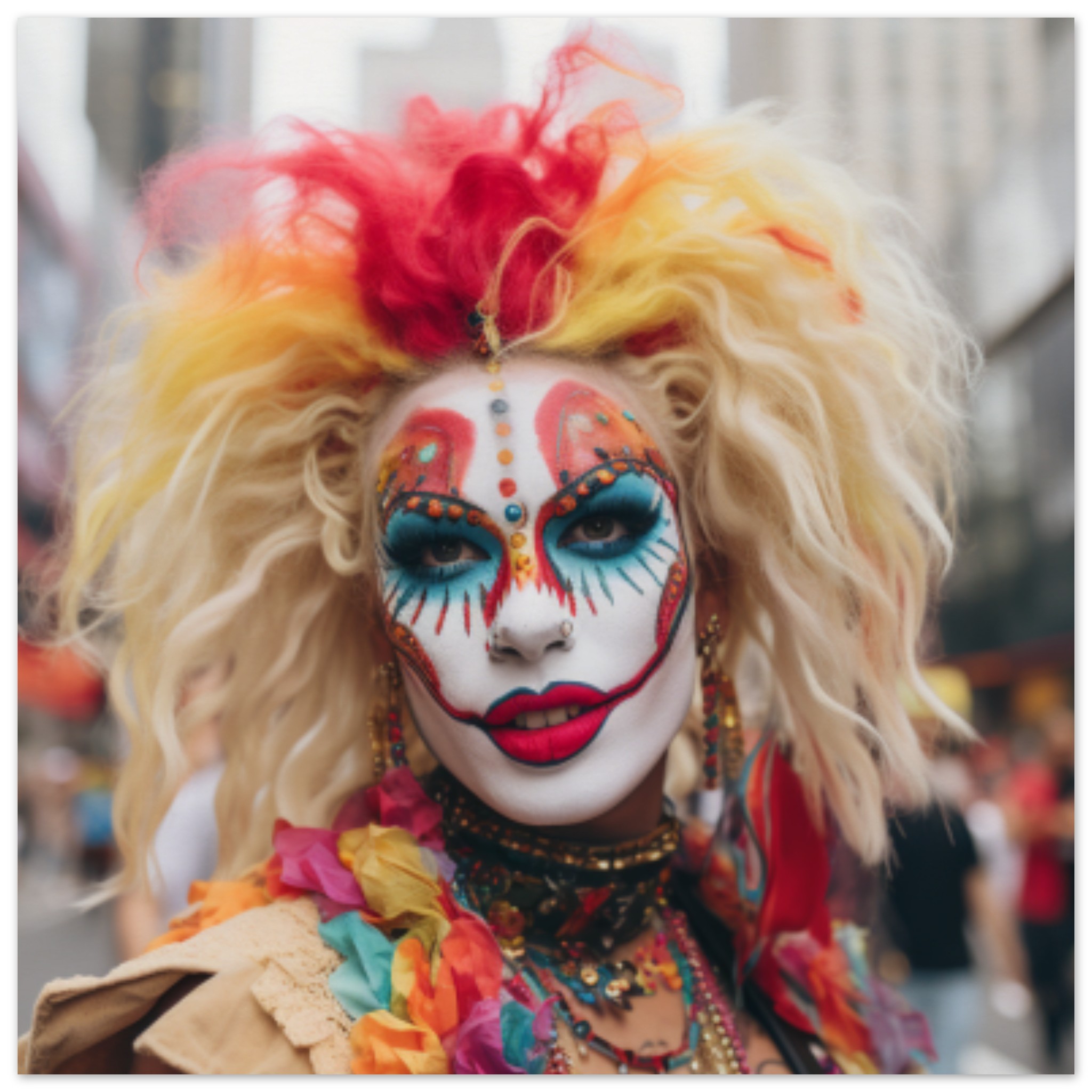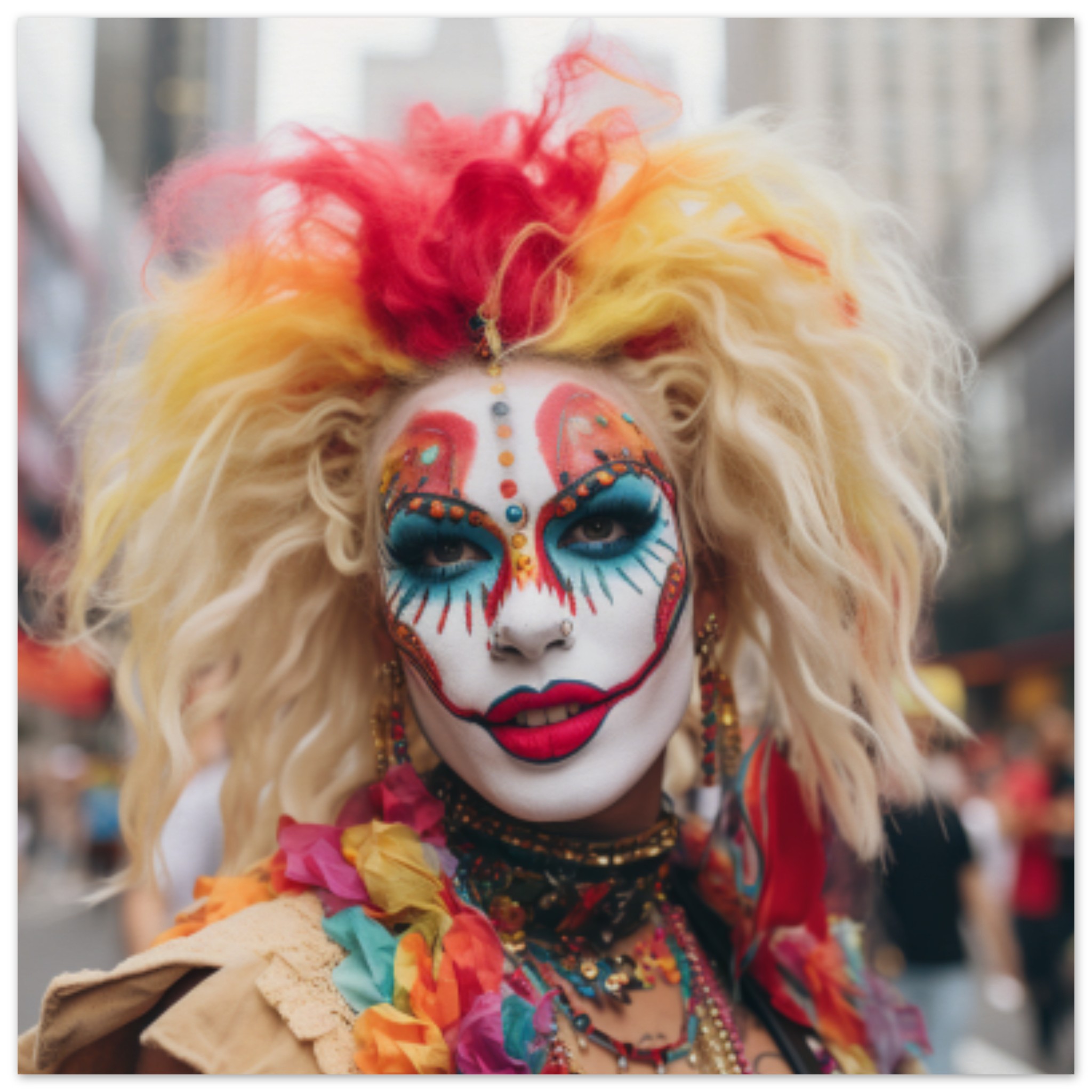 A woman with face paint and colorful hair is captured in this image. She is wearing a costume, possibly for a festival or carnival. The person is outdoors, possibly part of a street parade or cosplay event. The dominant colors in the image are grey and white, with an accent color of A82332. The woman’s face is the main focus, with a blurry background. There are no adult, racy, or gory elements in the image. The person’s face is slightly blurry, and the image also contains a person in the foreground wearing a black shirt.